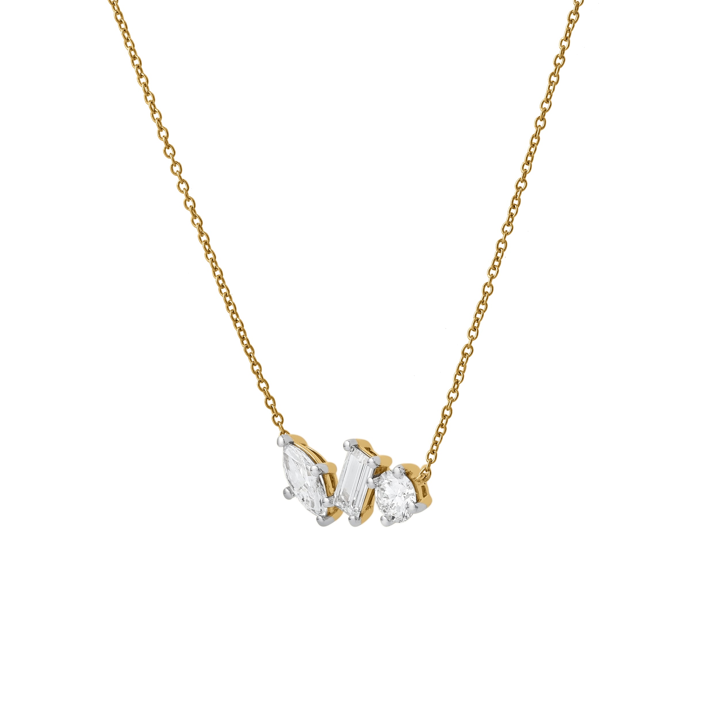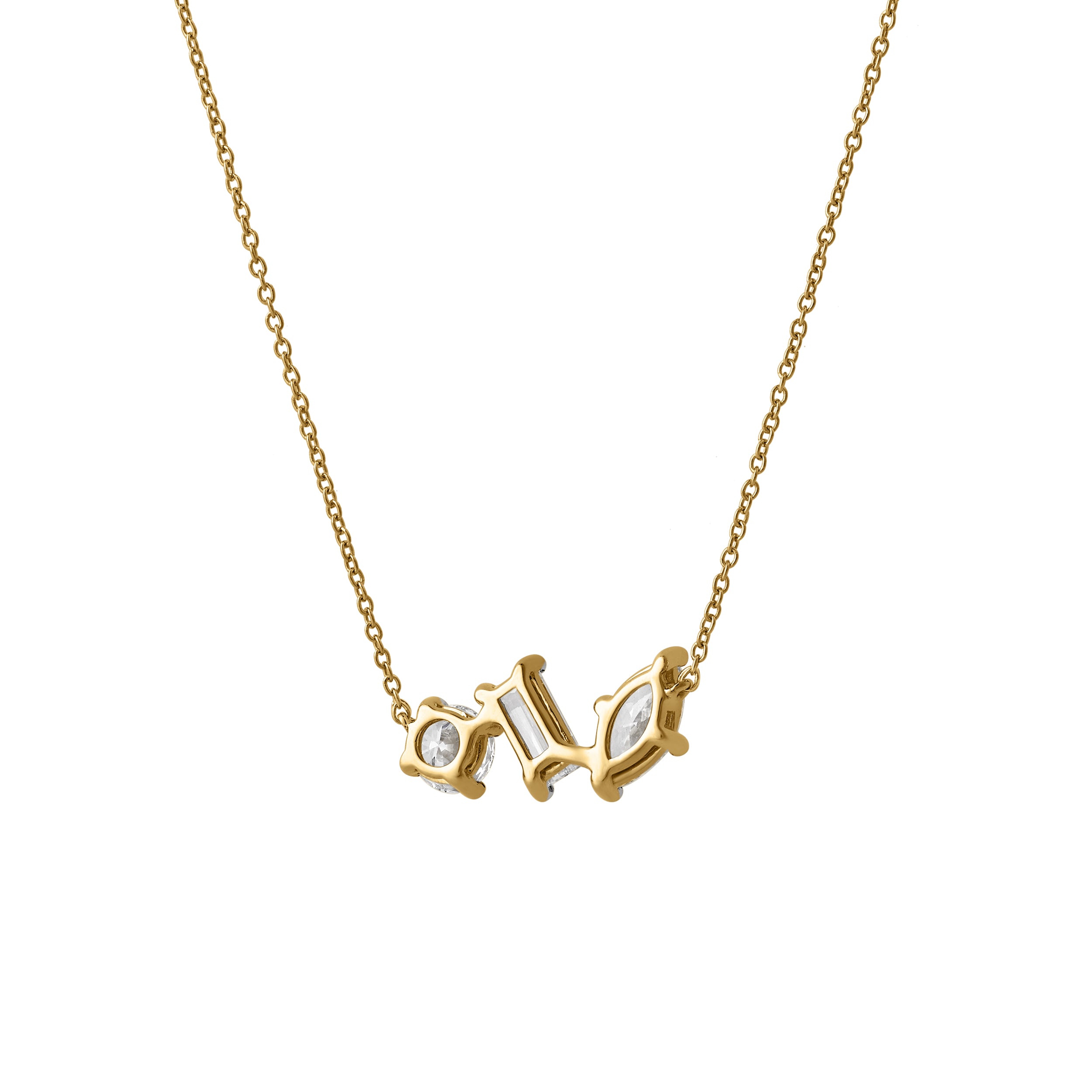 Crafted in 14K Yellow Gold with 0.75 cts of lab grown marquise round and baguette diamonds. The trio of shapes creates soft contrast and effortless elegance. Perfect worn alone or layered to tell your own style story. The chain is 18 inches. Each piece is handmade with care and rooted in conscious craftsmanship. Diamond carat weight may vary up to 0.05 carats from the stated weight.
