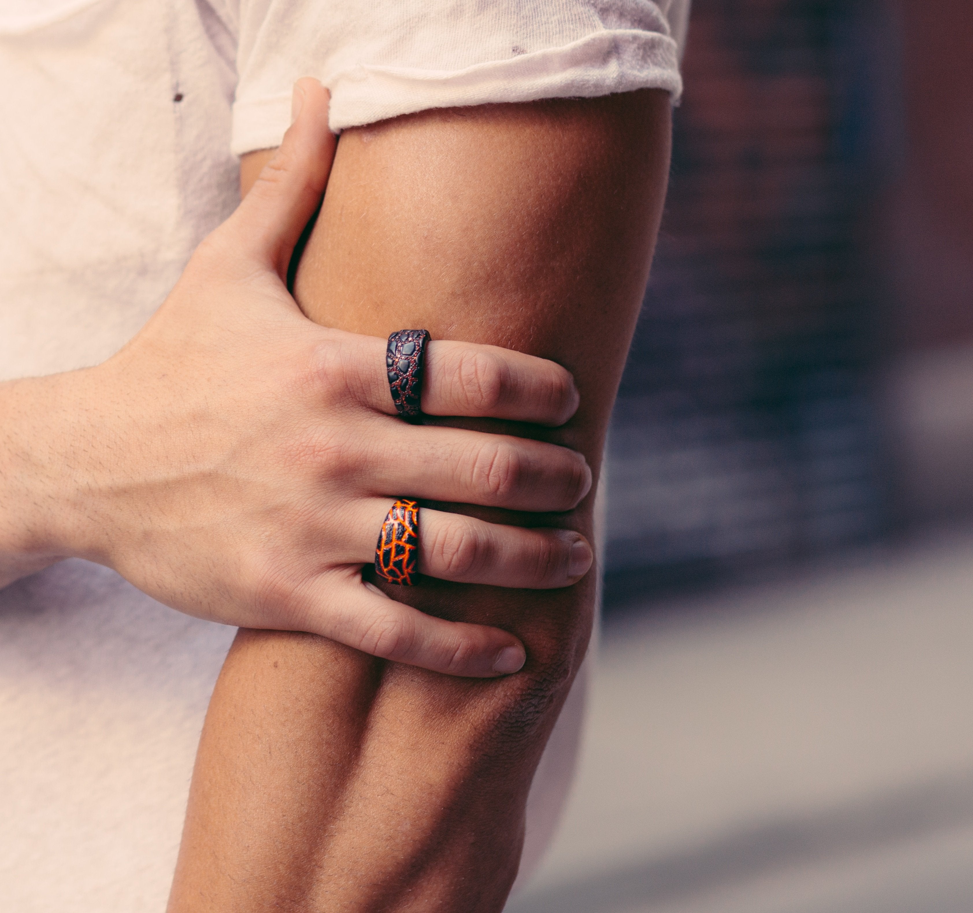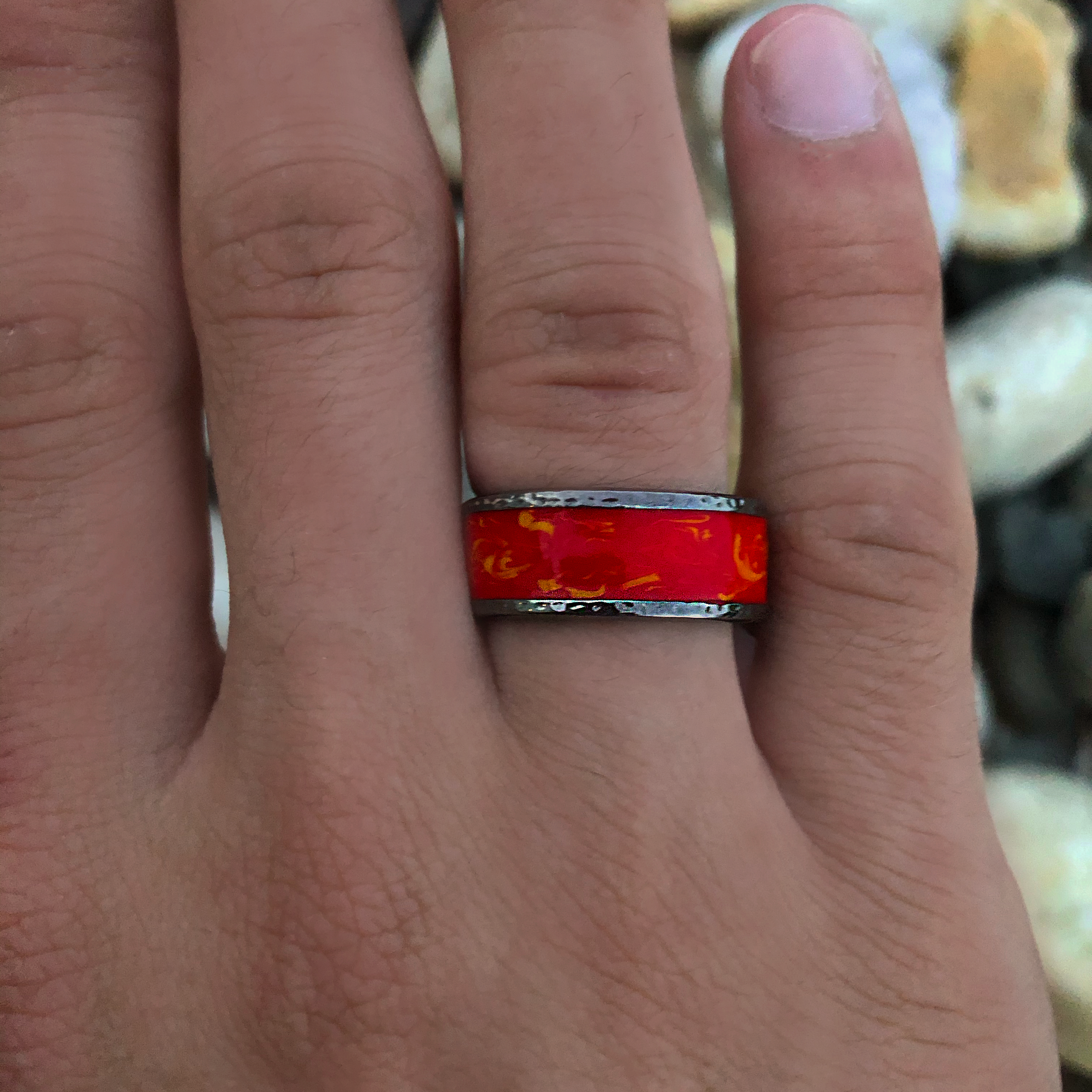 Fire in My Soul Black Rhodium Plated Sterling Silver Textured Red Orange Enamel Band Ring