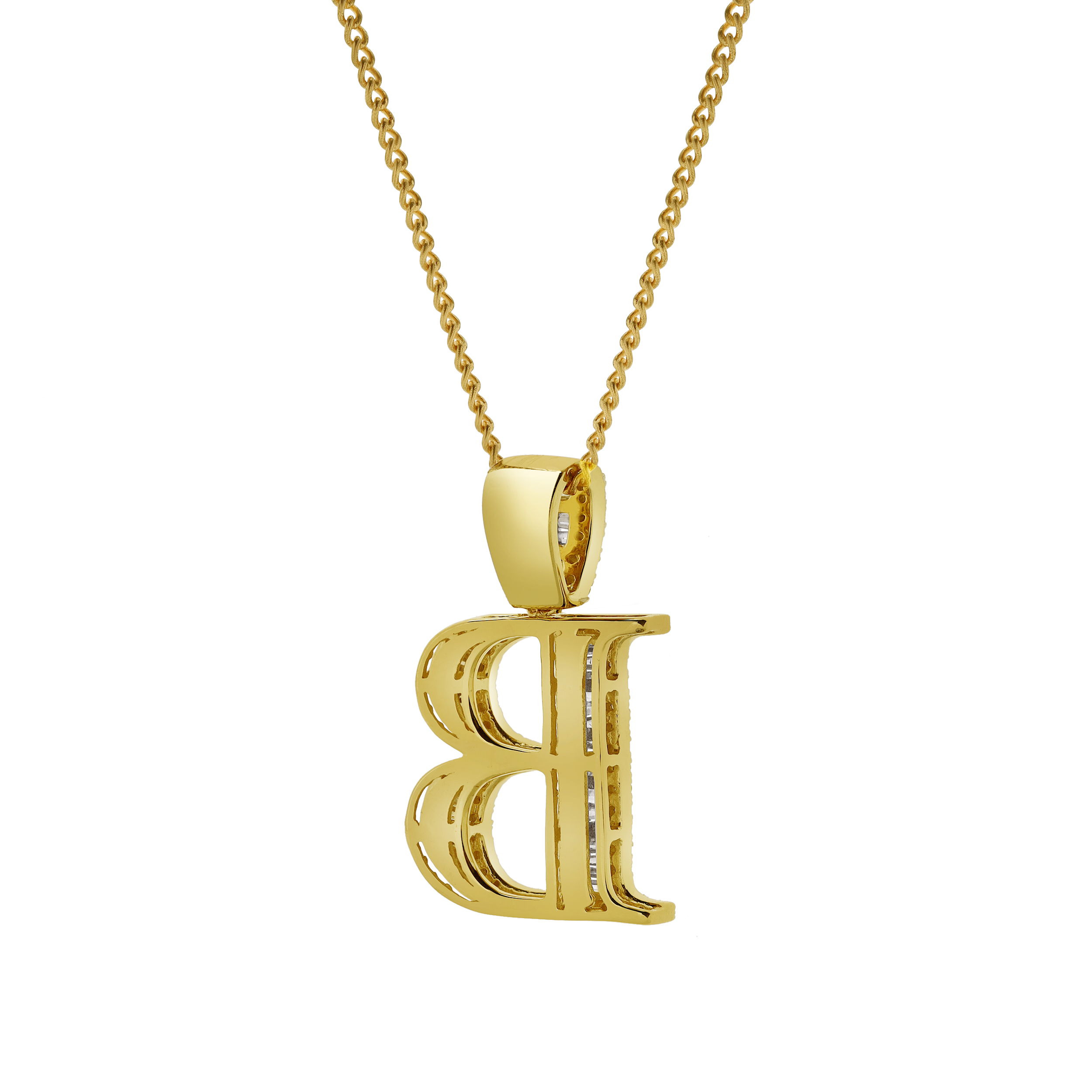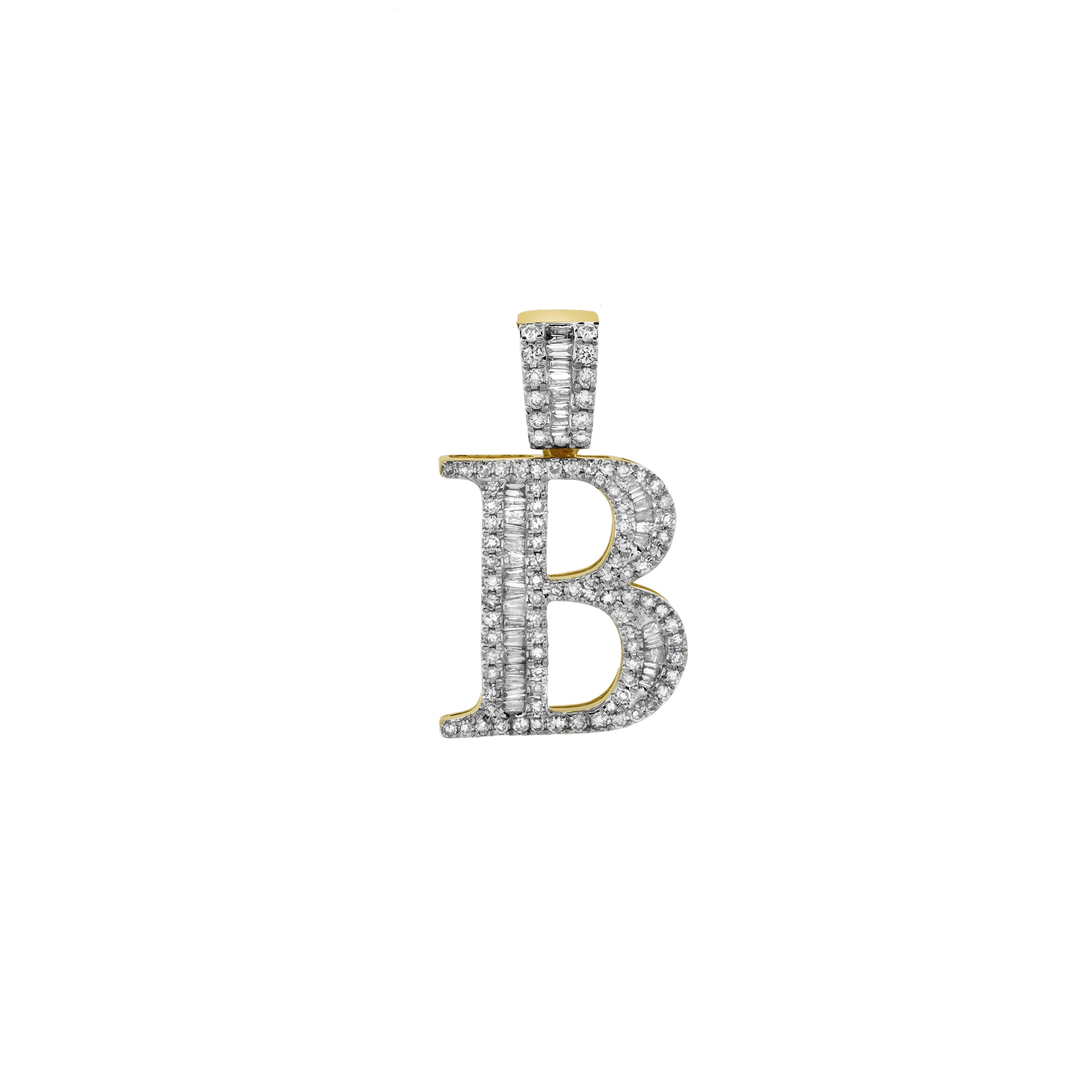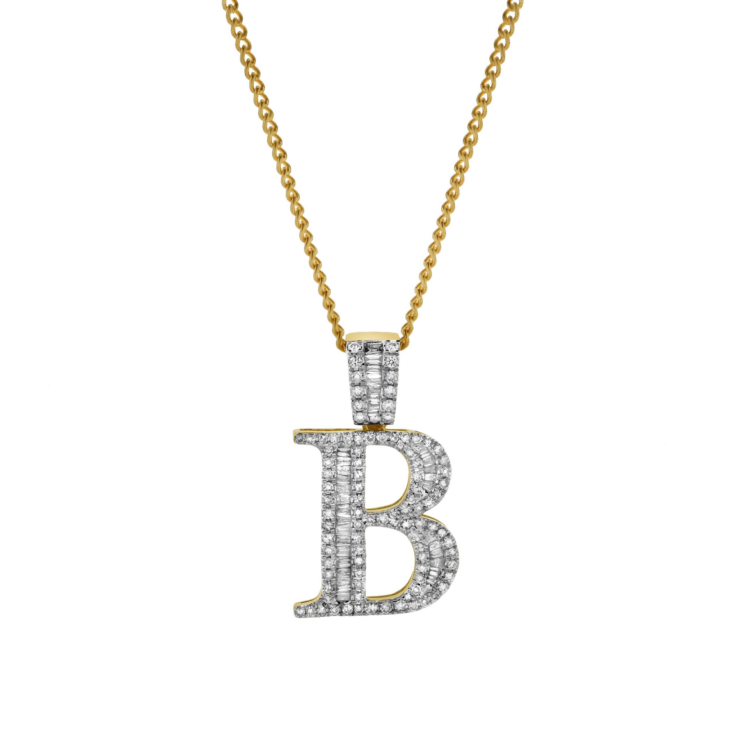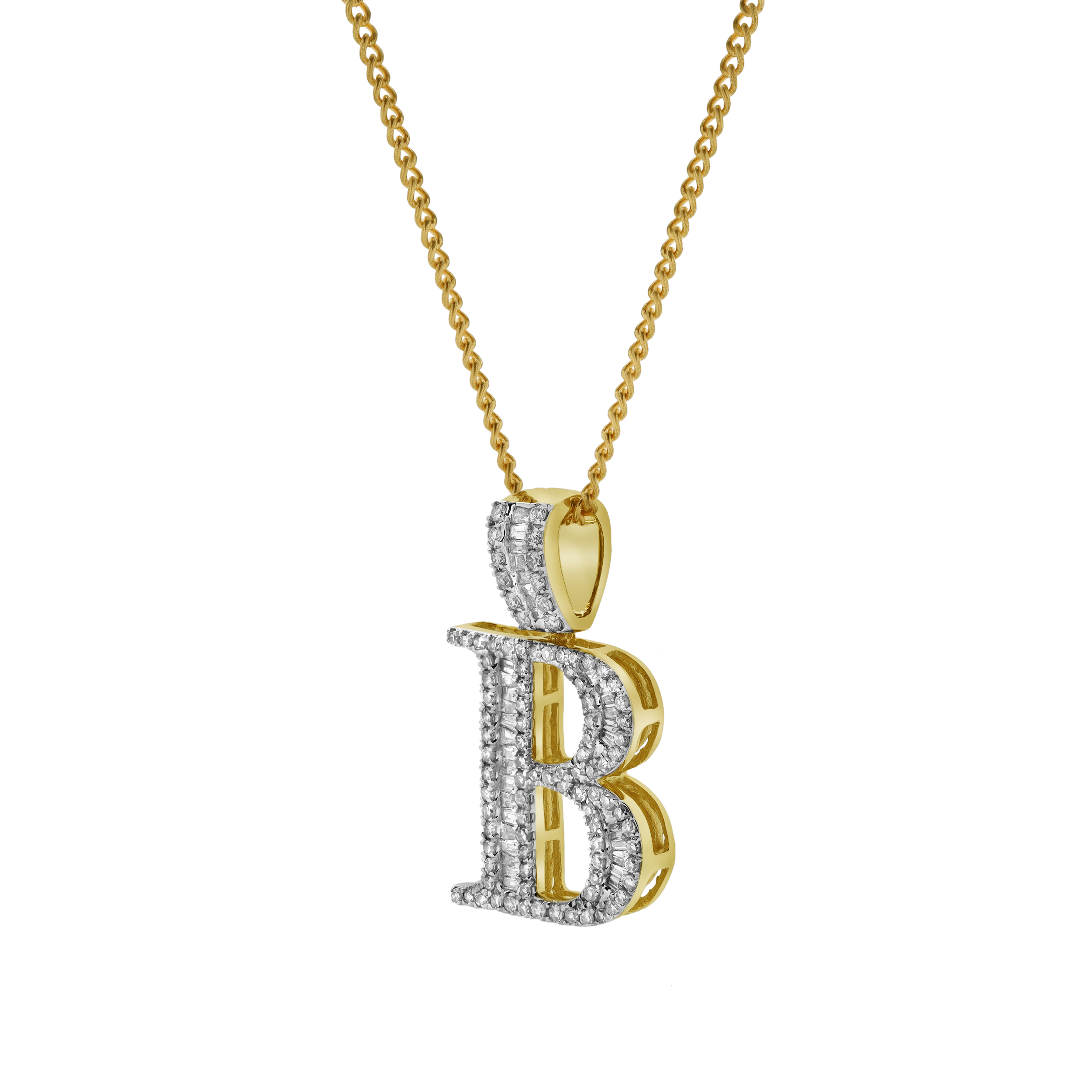 This B initial pendant is crafted in 10K Yellow Gold and features 0.75 carats of G SI1 diamonds. It includes a mix of natural round and baguette diamonds that add dimension texture and brilliance to the design. With expert craftsmanship and an elegant profile this pendant brings a personal and refined touch to any look. CHAIN NOT INCLUDED.