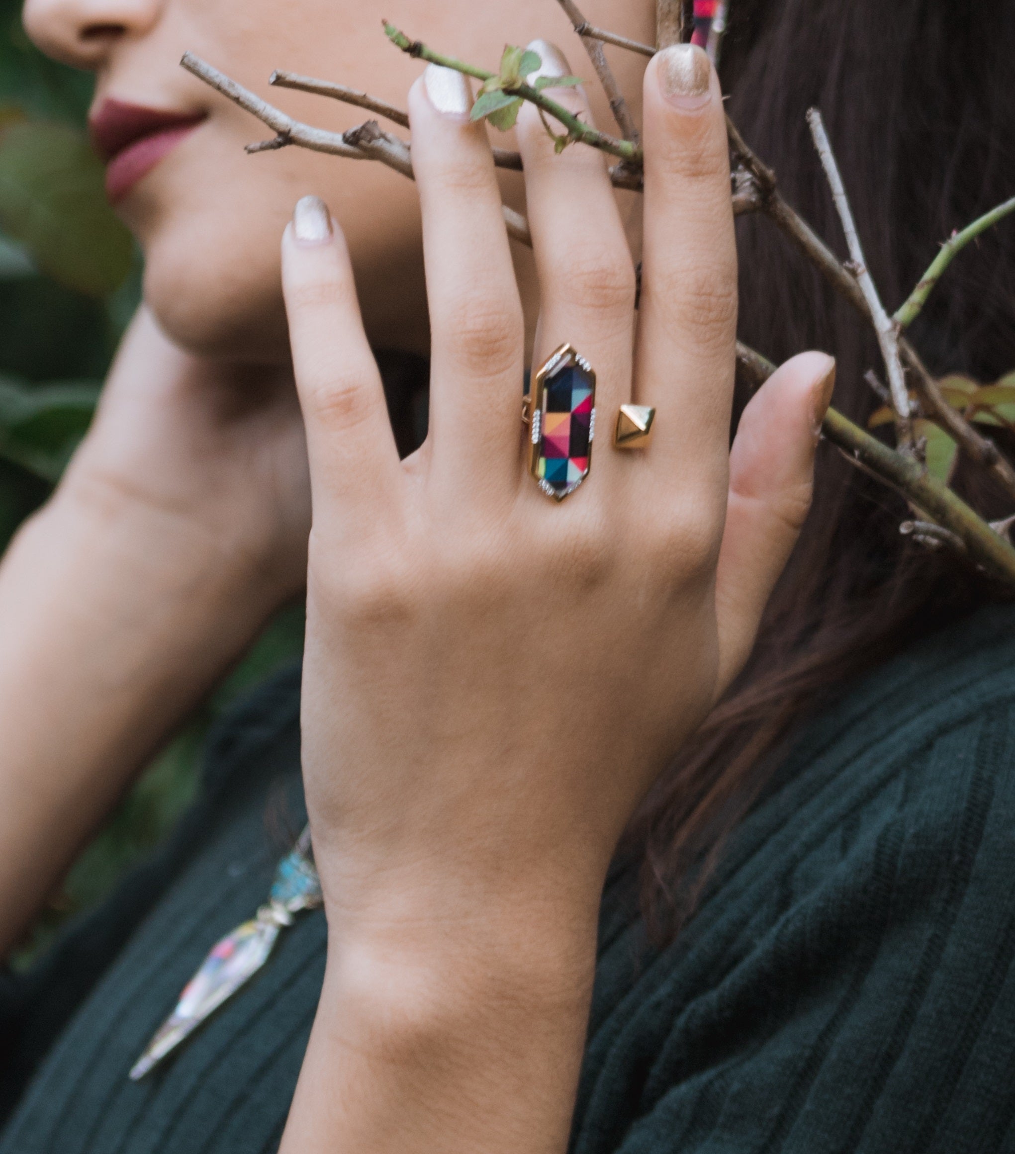 Crafted in 925 Sterling Silver this cocktail ring features a geometric colorful motif encased by crystal with 1/10 carats of diamonds in a plate prong setting. The open ring concept allows you to tighten or loosen the ring for a snug fit. This ring is plated in 14 KT Yellow Gold.