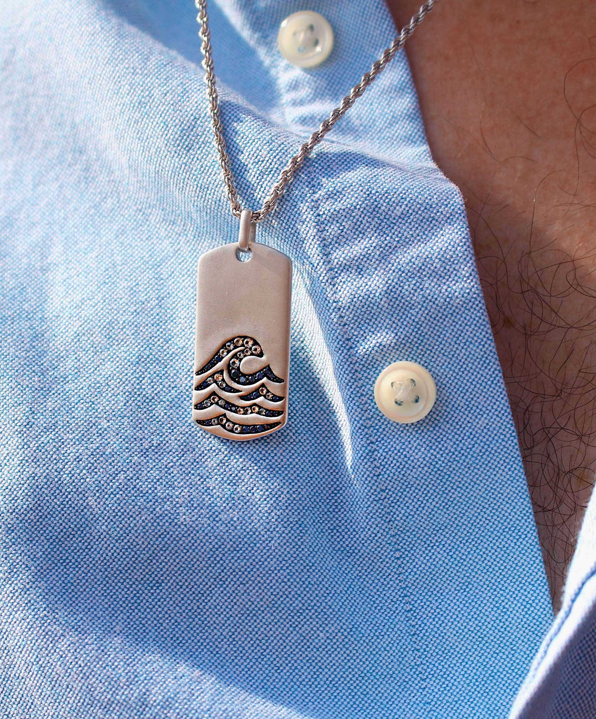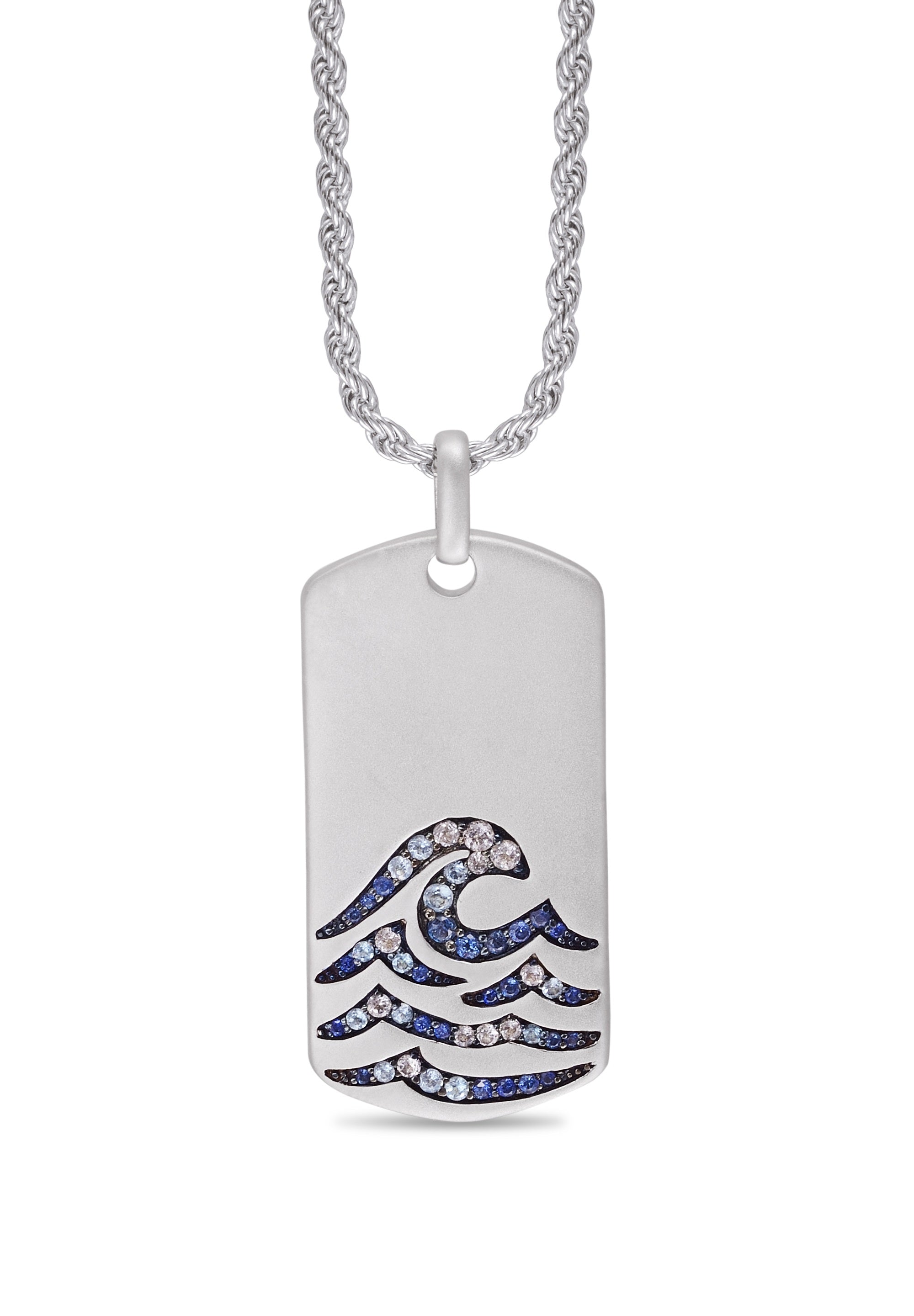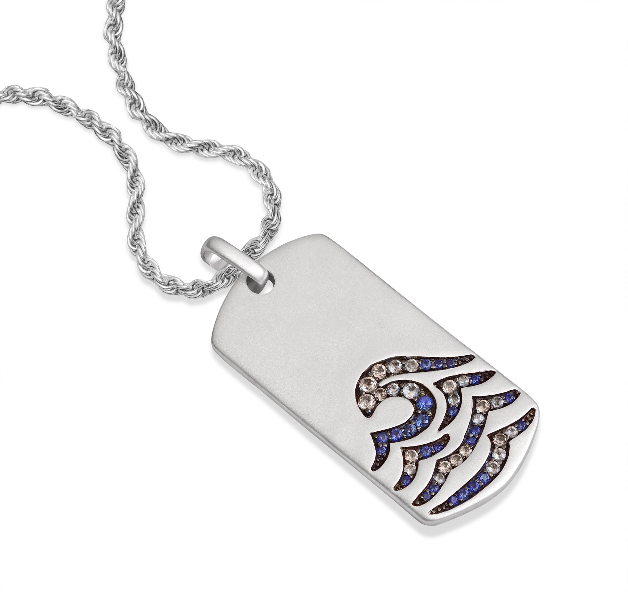 Our Breaking Waves Sapphire & Topaz Silver Tag Necklace offers a striking and aquatic inspired design. Ideal for the man who loves the ocean and desires a touch of refined elegance.