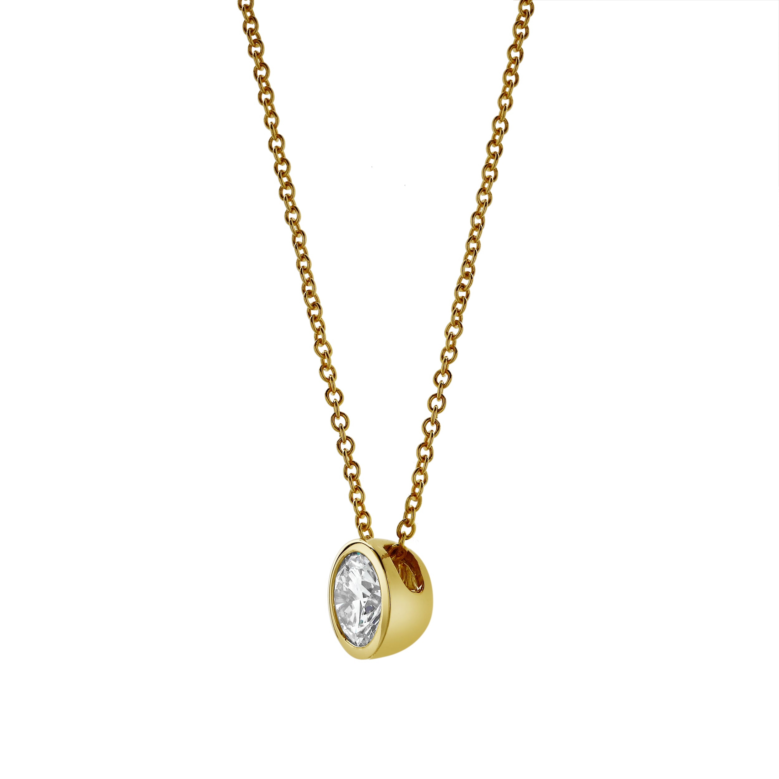 This elegant lab grown round diamond necklace features a 0.50 carat diamond bezel set in 14K yellow gold. It comes with a matching gold chain that complements the clean modern silhouette. The bezel setting offers a smooth and secure frame that enhances the diamond brilliance while providing a minimalist and timeless look. Ideal for everyday wear this necklace adds a refined touch to both casual outfits and dressier occasions. A perfect choice for those who value sustainable fine jewelry with classic appeal. Each necklace includes an IGI certificate for guaranteed authenticity. Diamond carat weight may vary up to 0.05 carats above the stated value.
