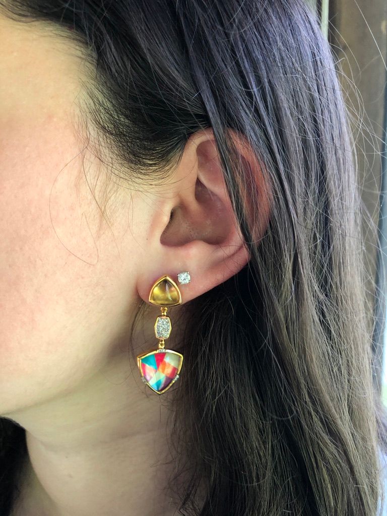 Crafted in 925 Sterling Silver these elegant earrings feature trillion shaped citrine stones triangular colorful motifs encased by crystal and 1/4 carats of diamonds in a pre pave setting. These earrings are plated in 14 KT Yellow Gold.