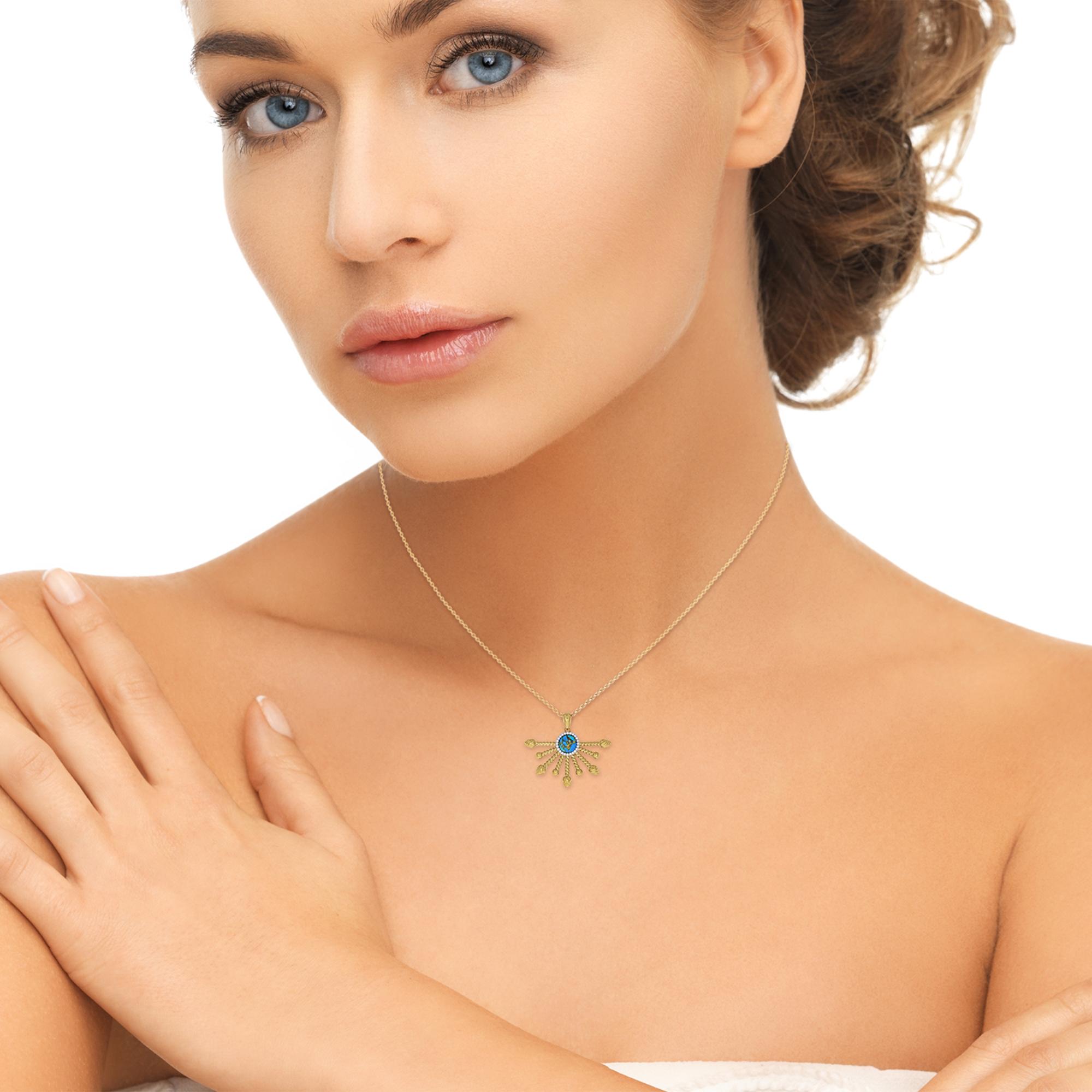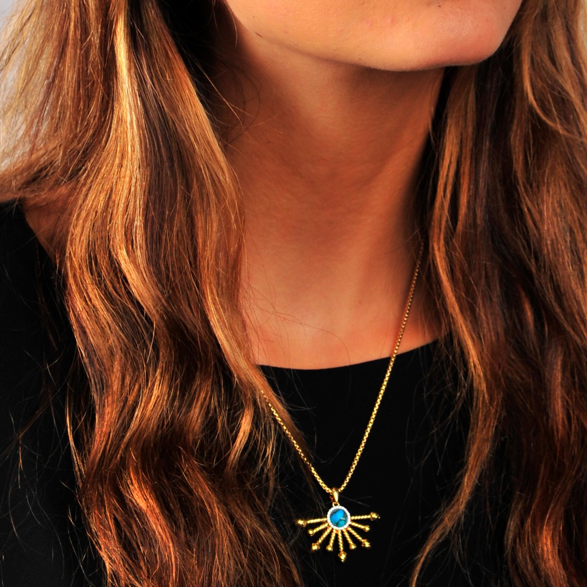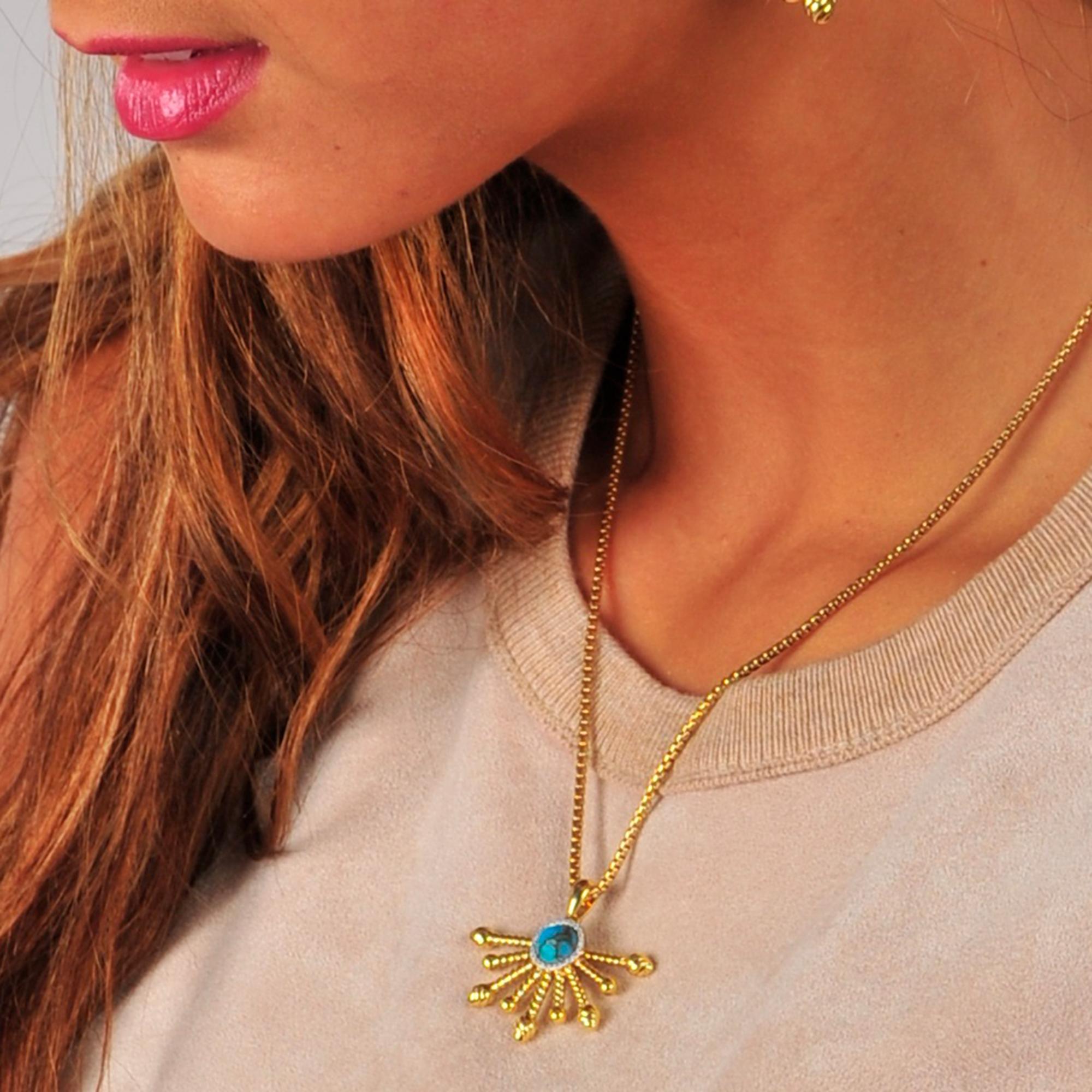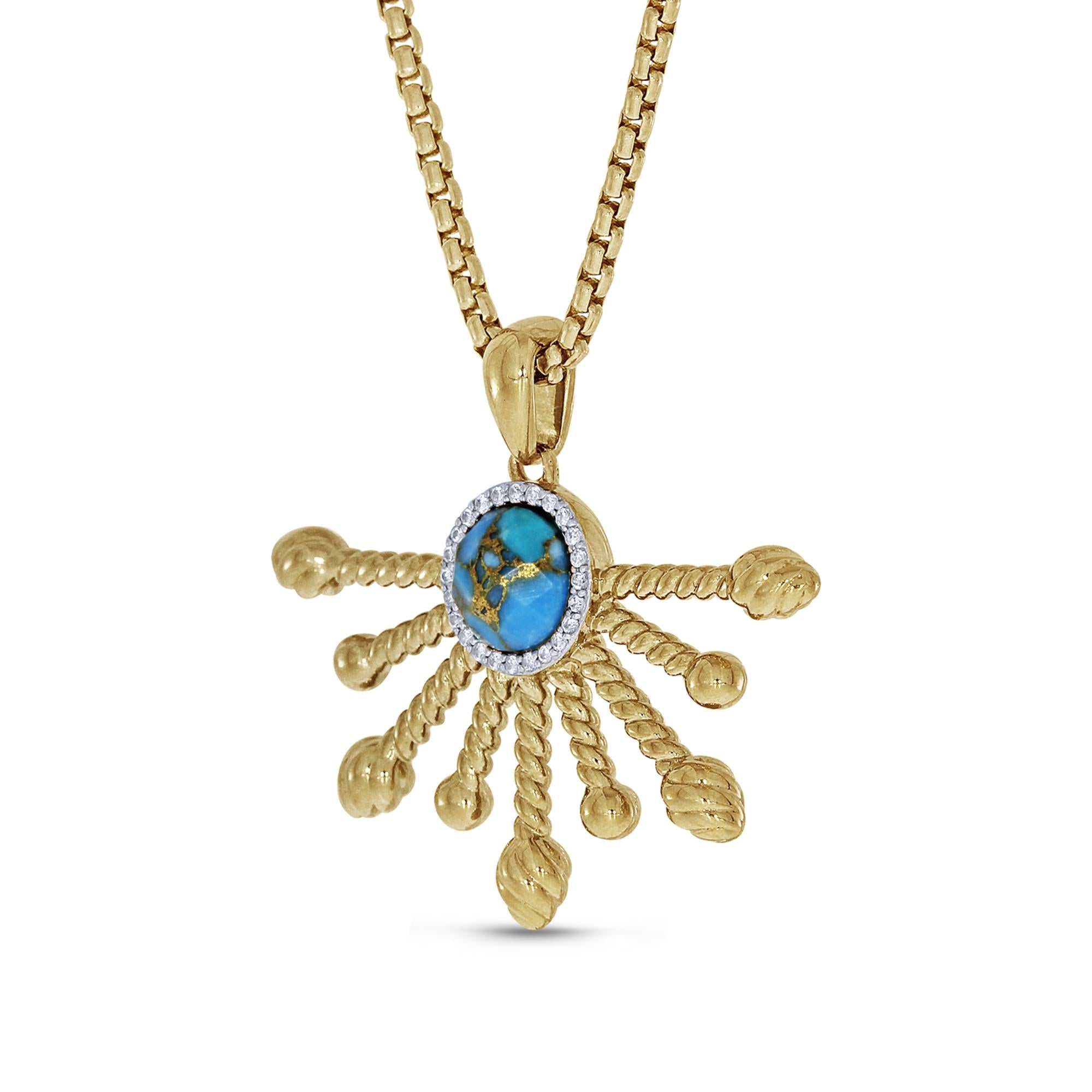 Inspired by the sun this halfsun turquoise Pendant from the LMJ Sunshine Twist Collection features 1/10 carats of genuine diamonds used in a plate prong setting. Crafted in 925 Sterling Silver plated in 14K Yellow Gold. This pendant comes with an 18" classic round box chain with a lobster clasp.