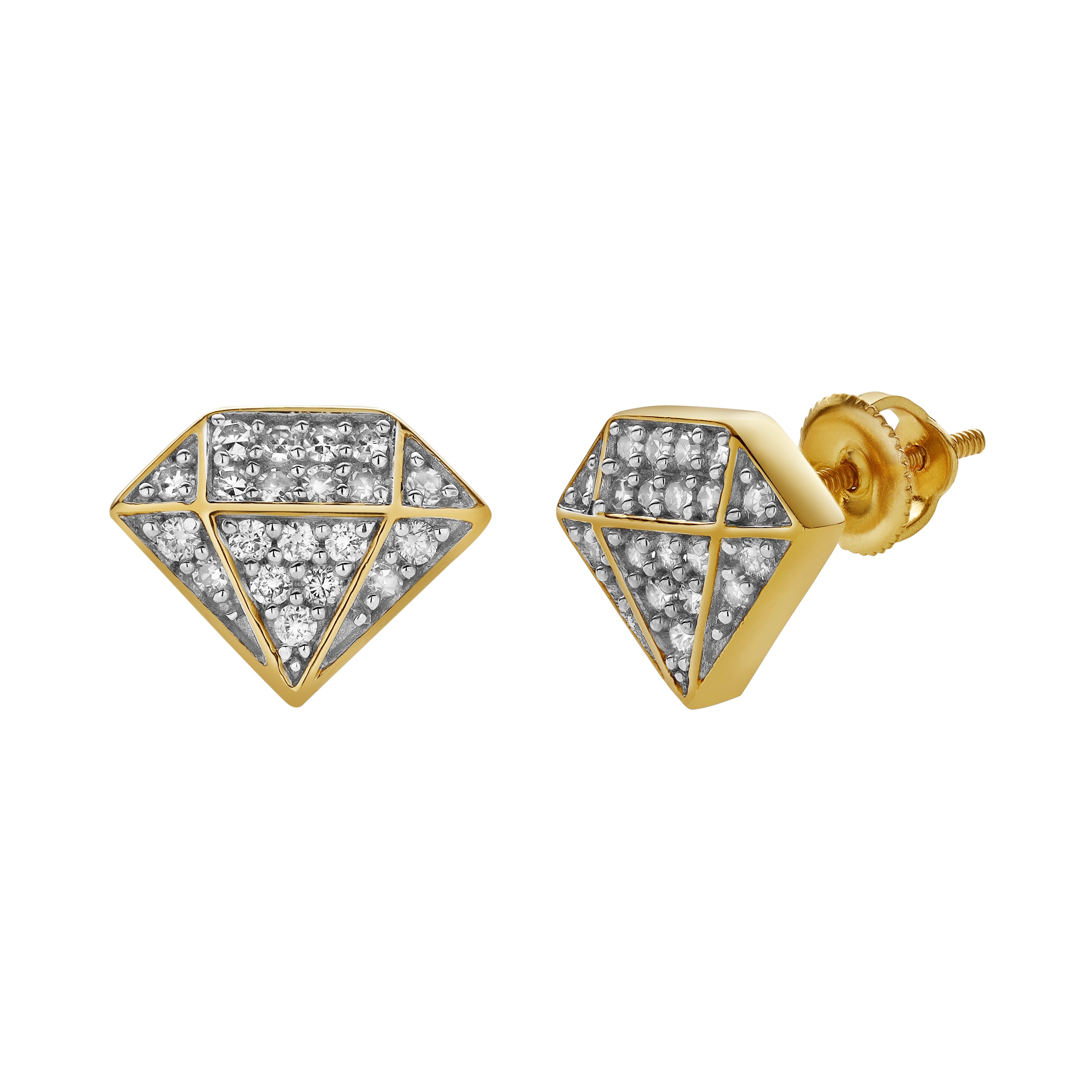 These gorgeous 0.33 carat diamond earrings feature a delicate cluster design meticulously set in 10k yellow gold frame shaped like a diamond and a screwback setting. Their elegant arrangement highlights the timeless brilliance of the diamonds.