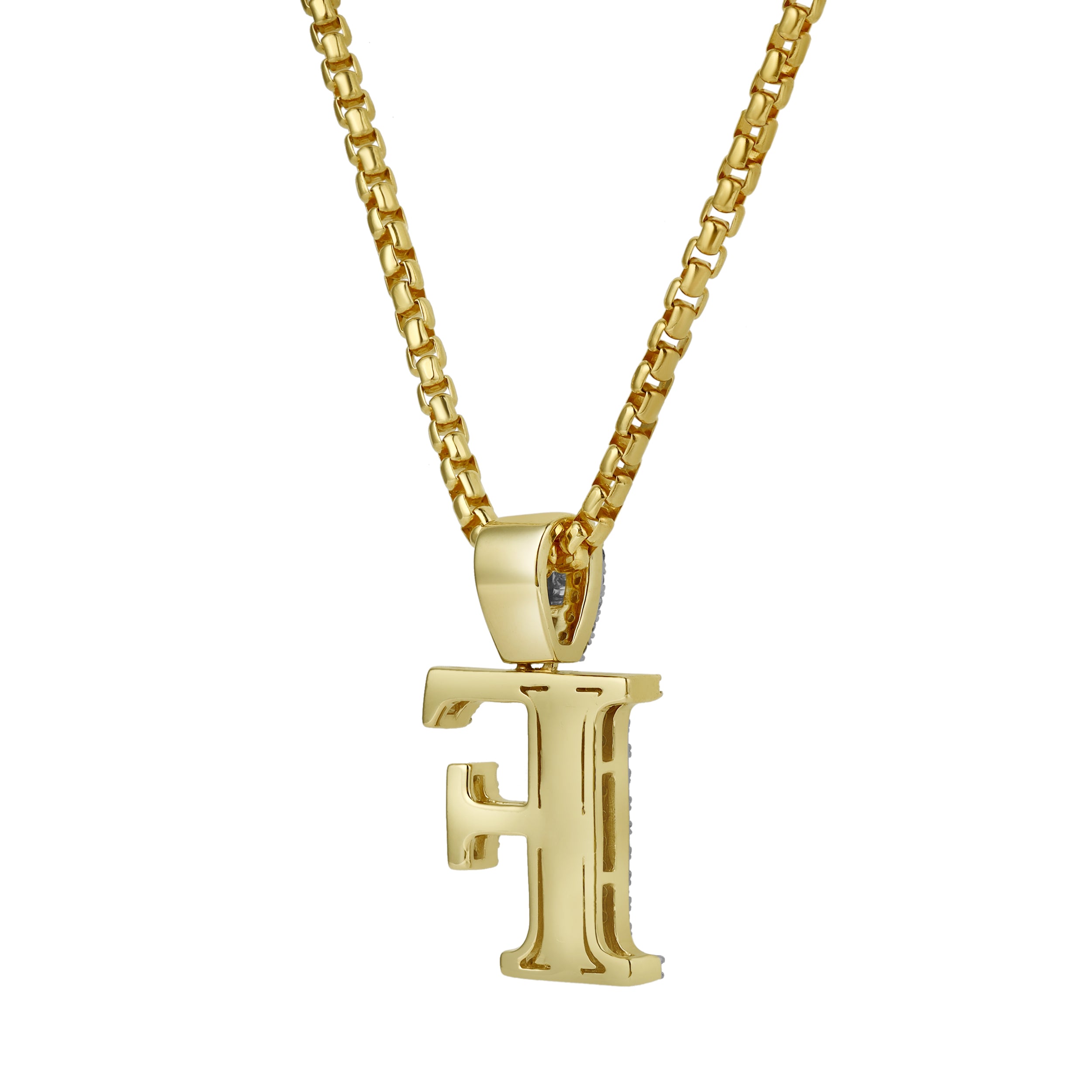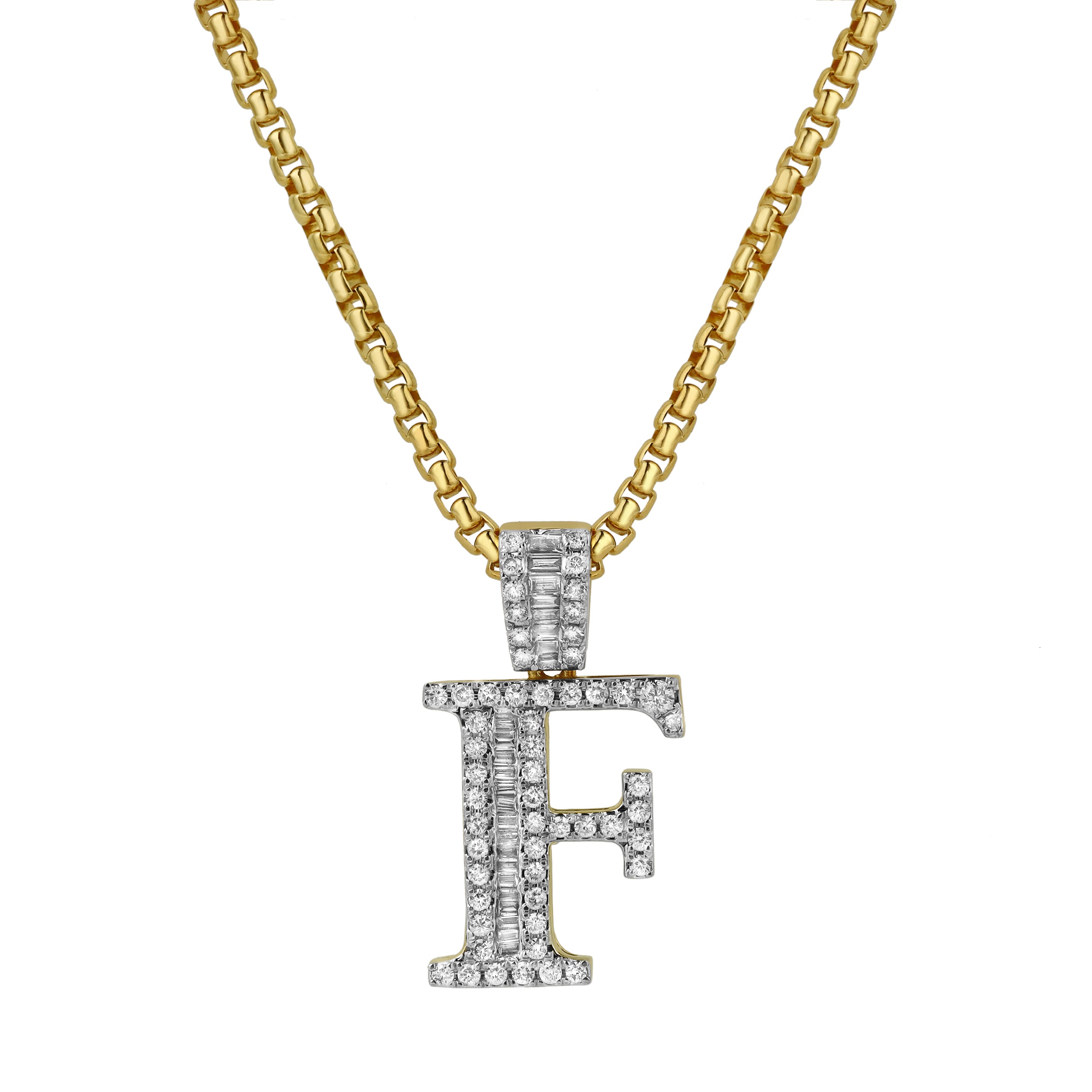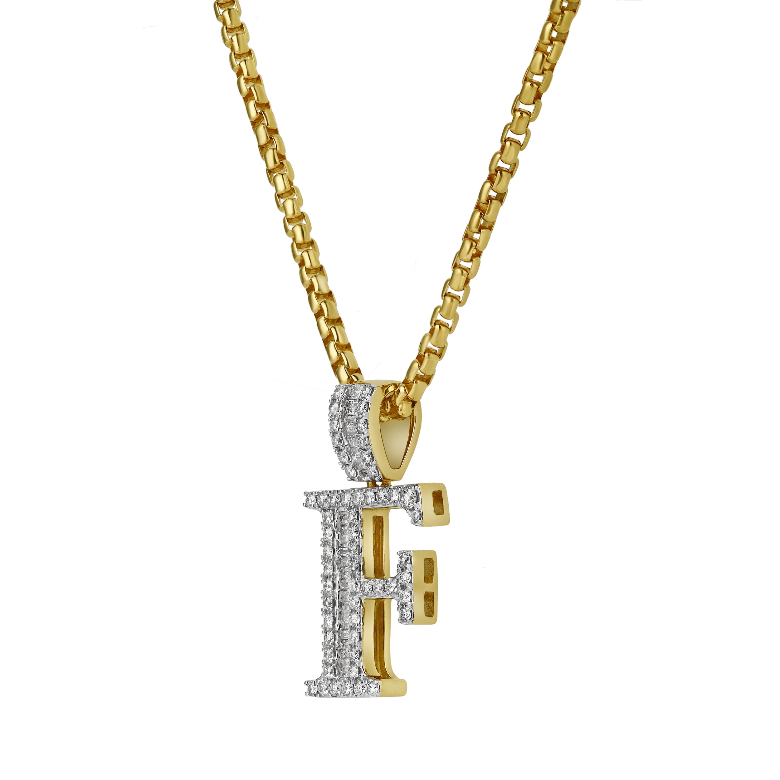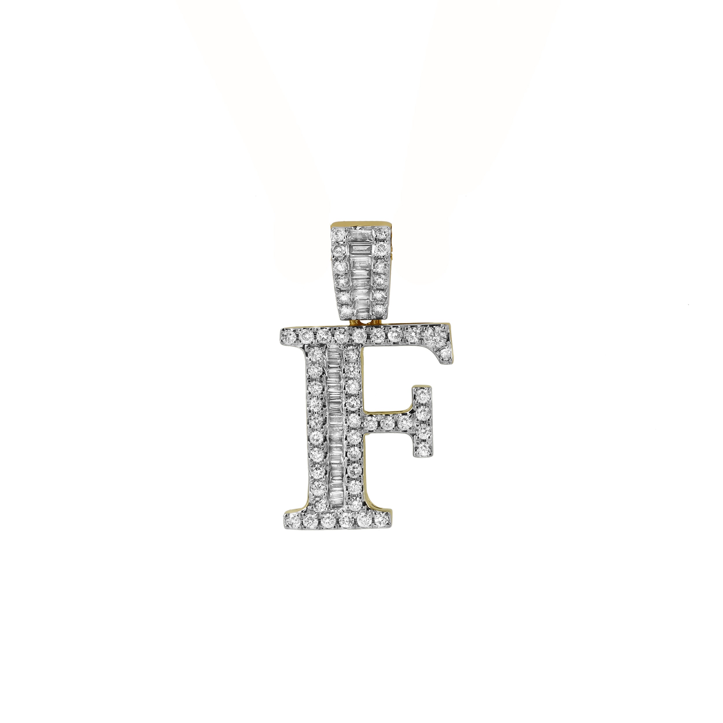 This F initial pendant is crafted in 10K Yellow Gold and features 0.71 carats of GH SI1 SI2 diamonds. The design includes a mix of natural round and baguette diamonds adding brilliance depth and texture. With expert craftsmanship and a graceful profile this pendant brings a personal and polished touch to any style. CHAIN NOT INCLUDED.