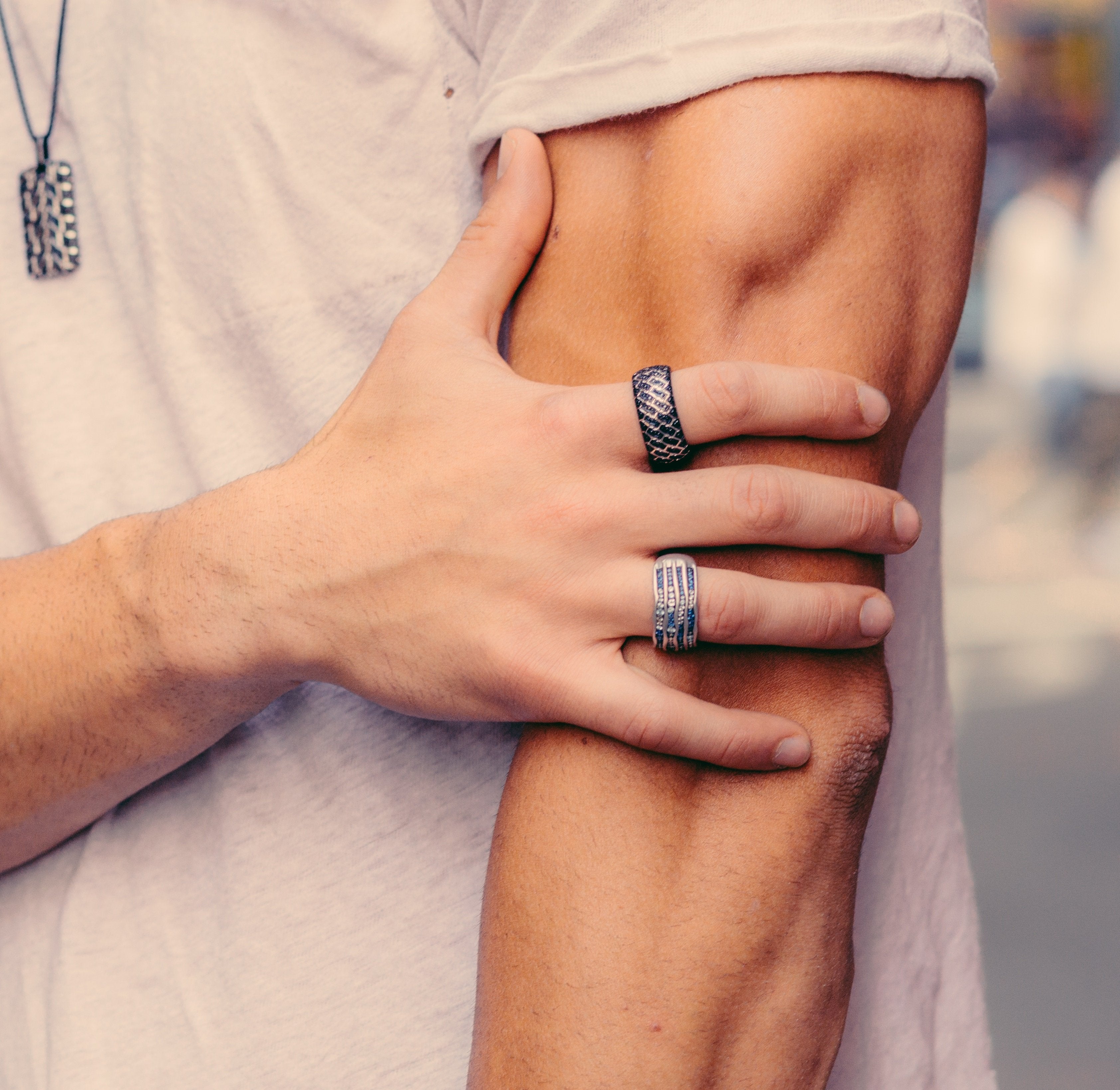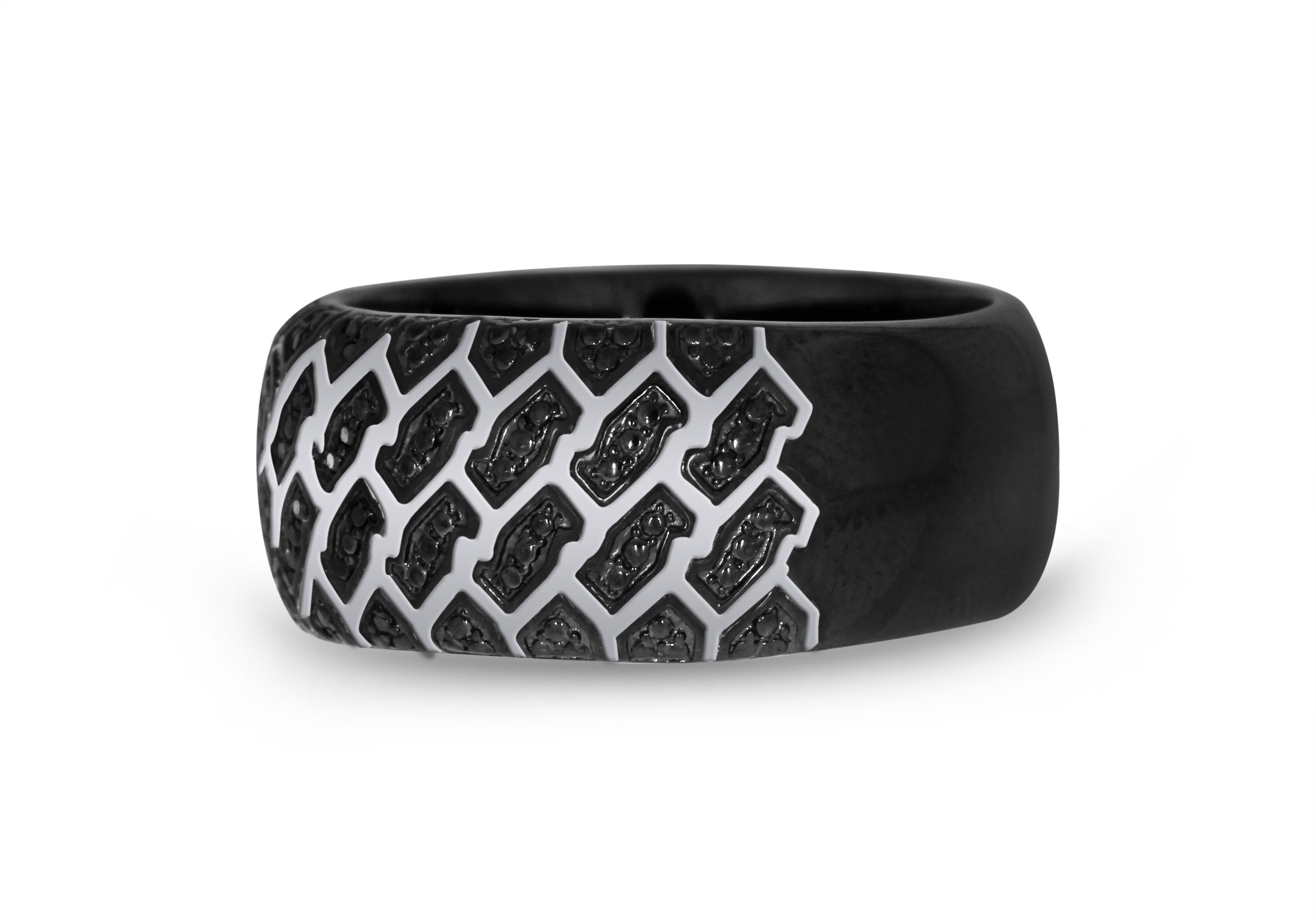 The Fast Track Tire Tread Sterling Silver & Black Diamond Ring offers a bold and innovative design. Perfect for the man who appreciates a touch of speed and style with a rugged edge.