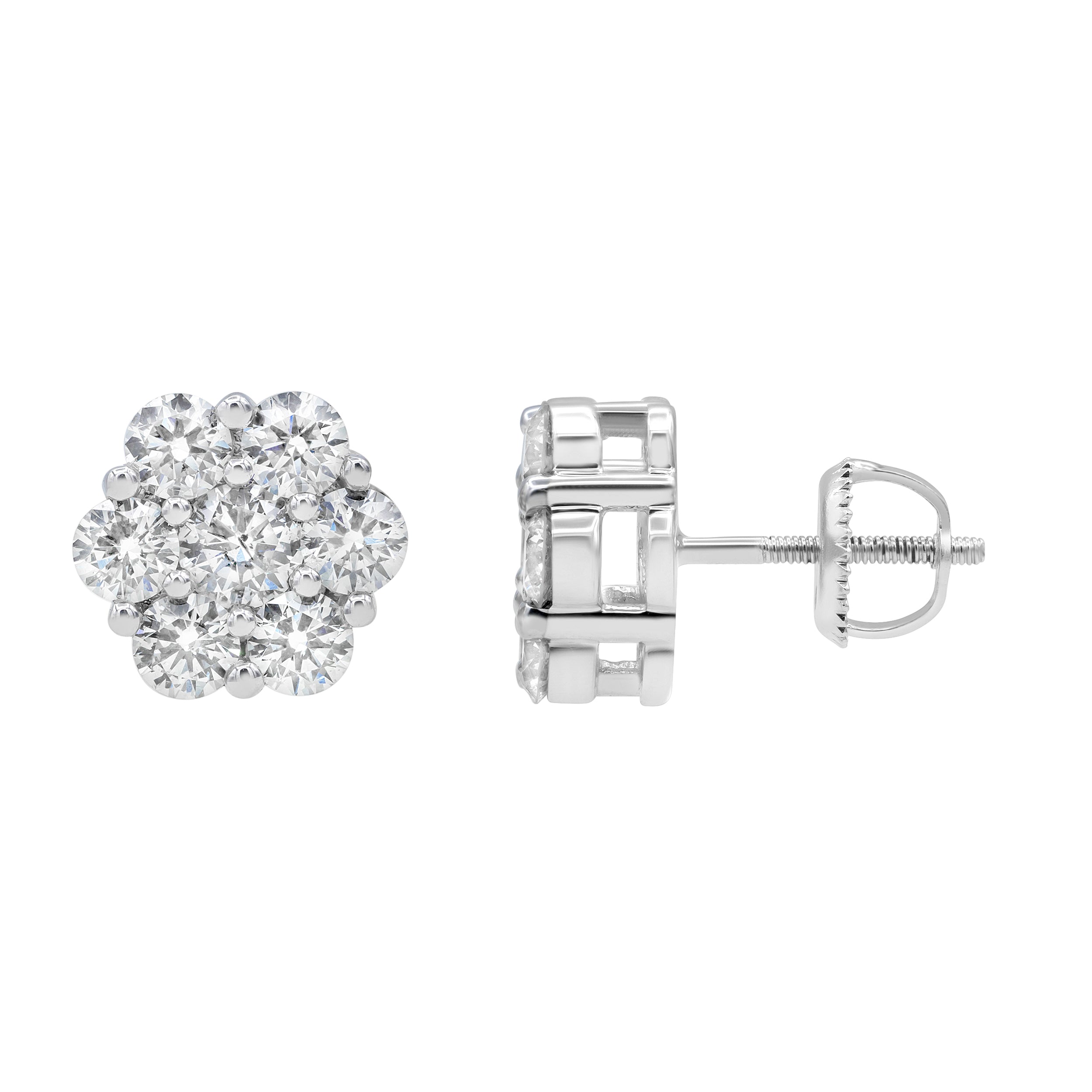 These 2.53 carat diamond earrings feature a delicate flower cluster design meticulously set in 14k white gold with a screwback setting. Their elegant arrangement highlights the timeless brilliance of the diamonds.