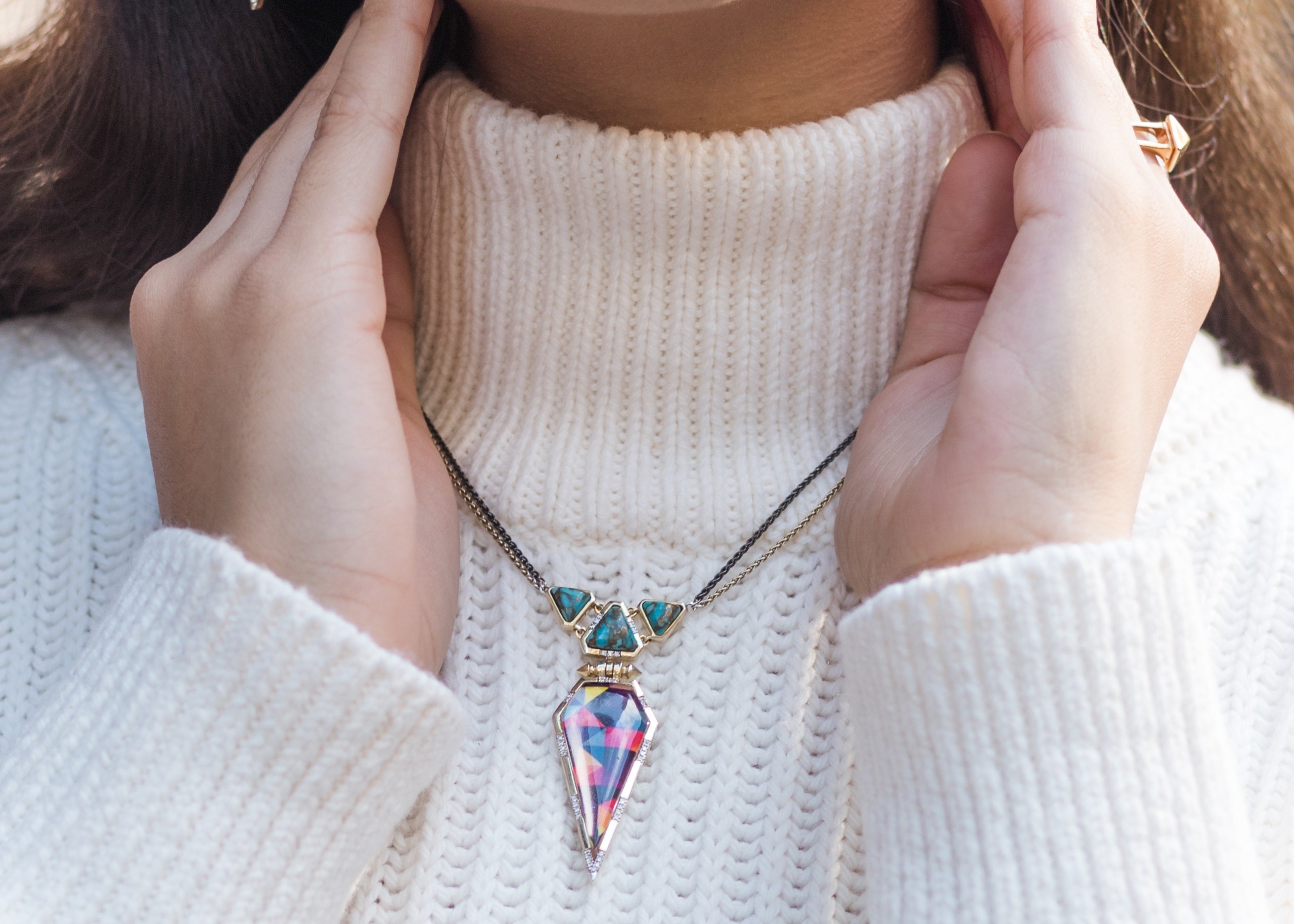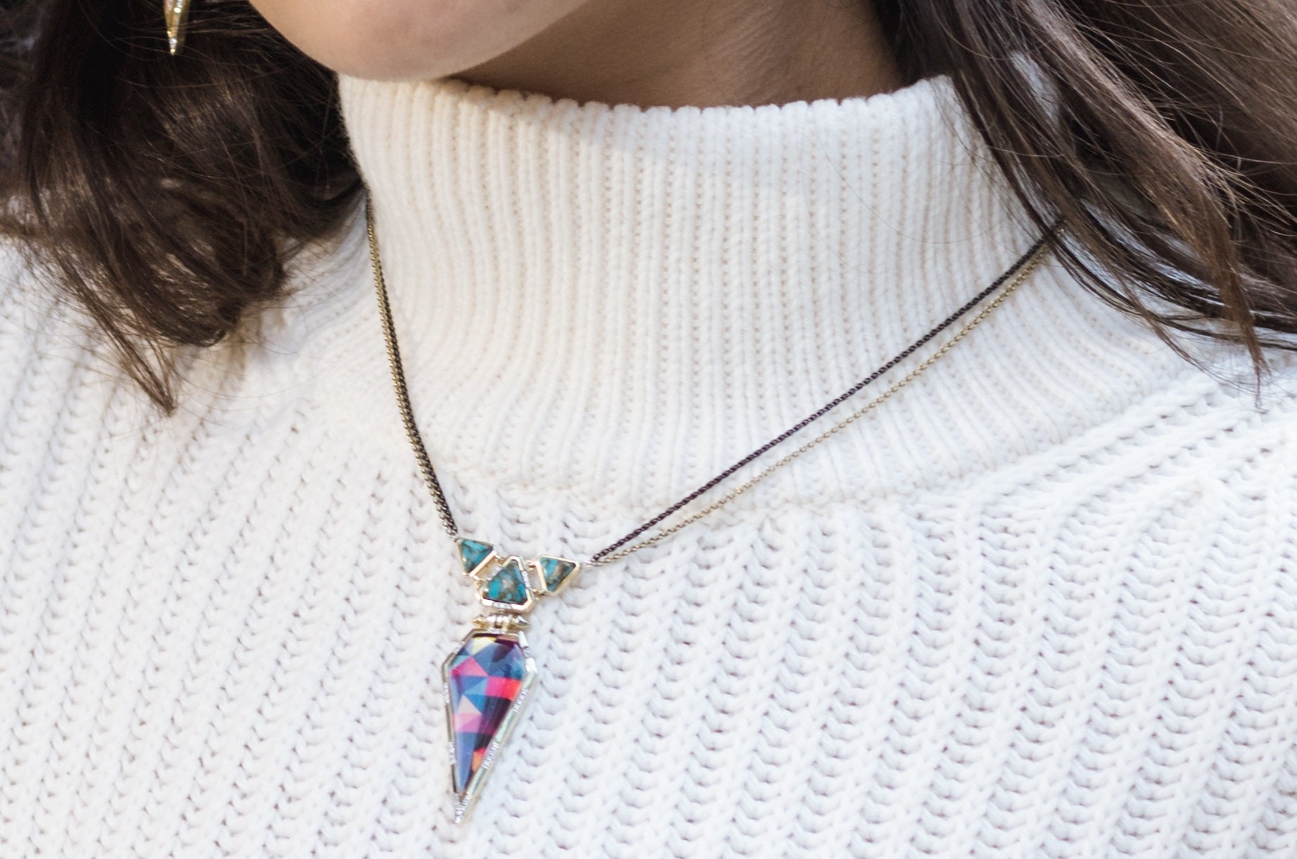 Crafted in 925 Sterling Silver this stunning necklace features 3 trillion shaped turquoise stones and a geometric colorful motif encased by crystal set alongside 1/6 carats of diamonds. This 18" long necklace has 2 wheat chains with a lobster clasp.