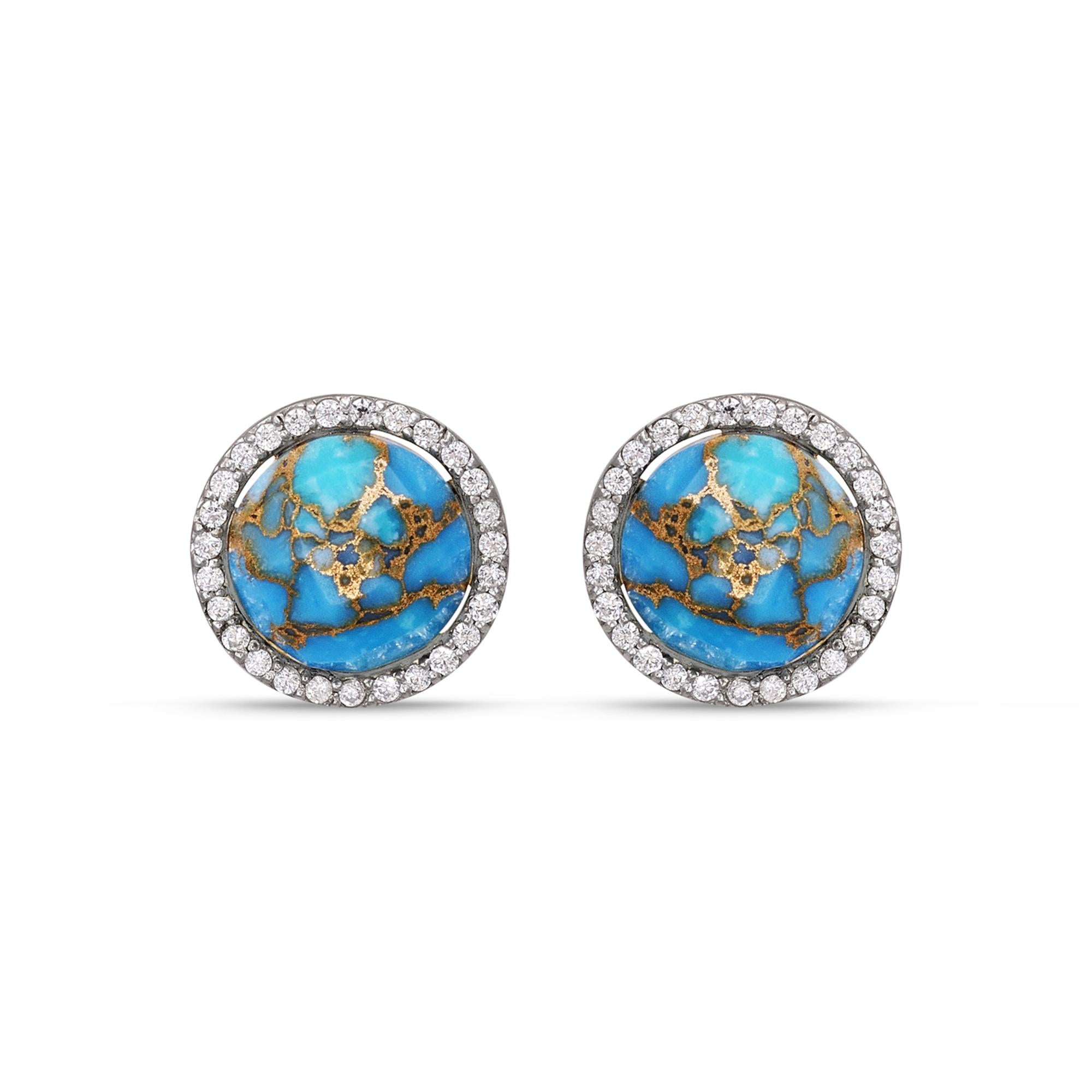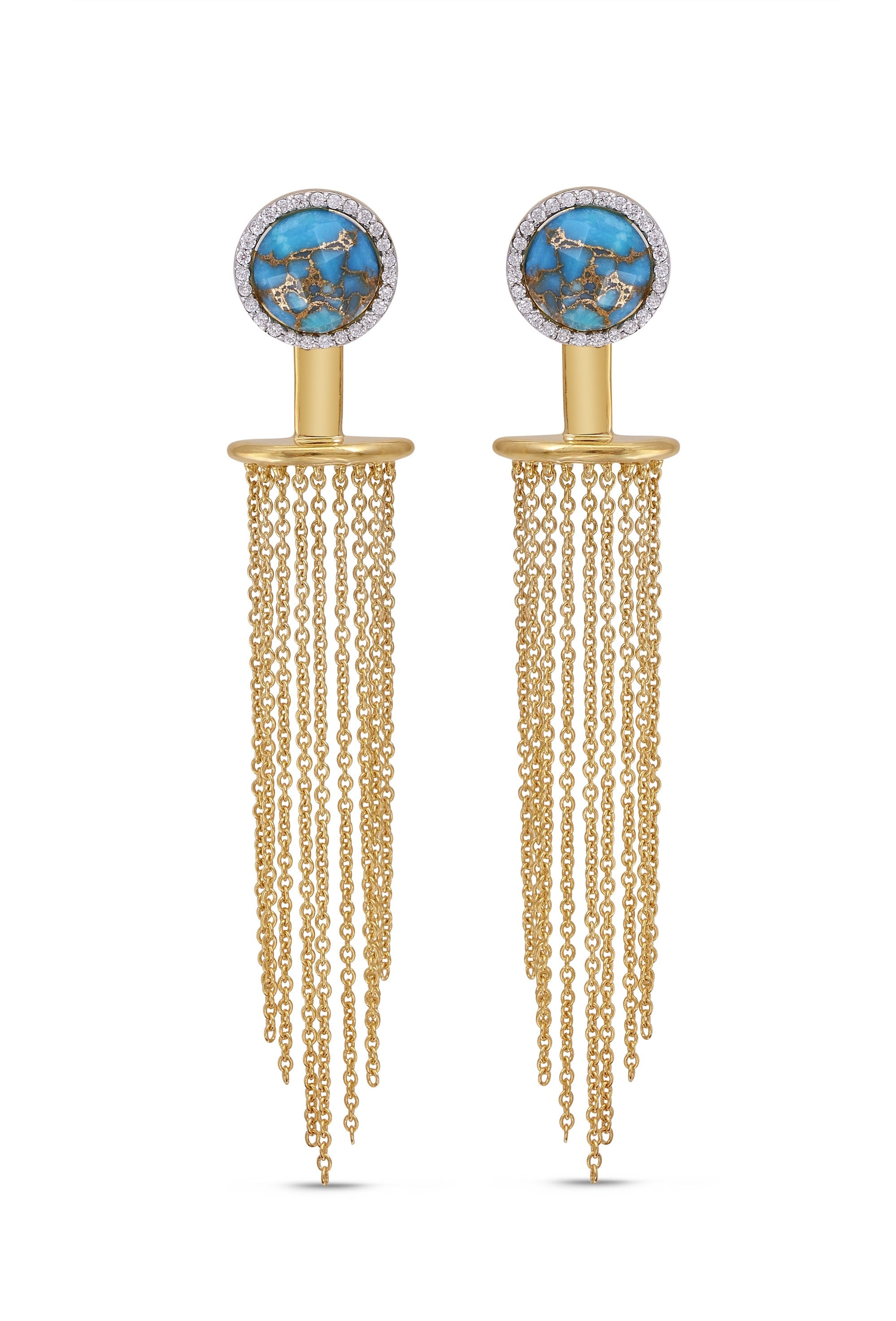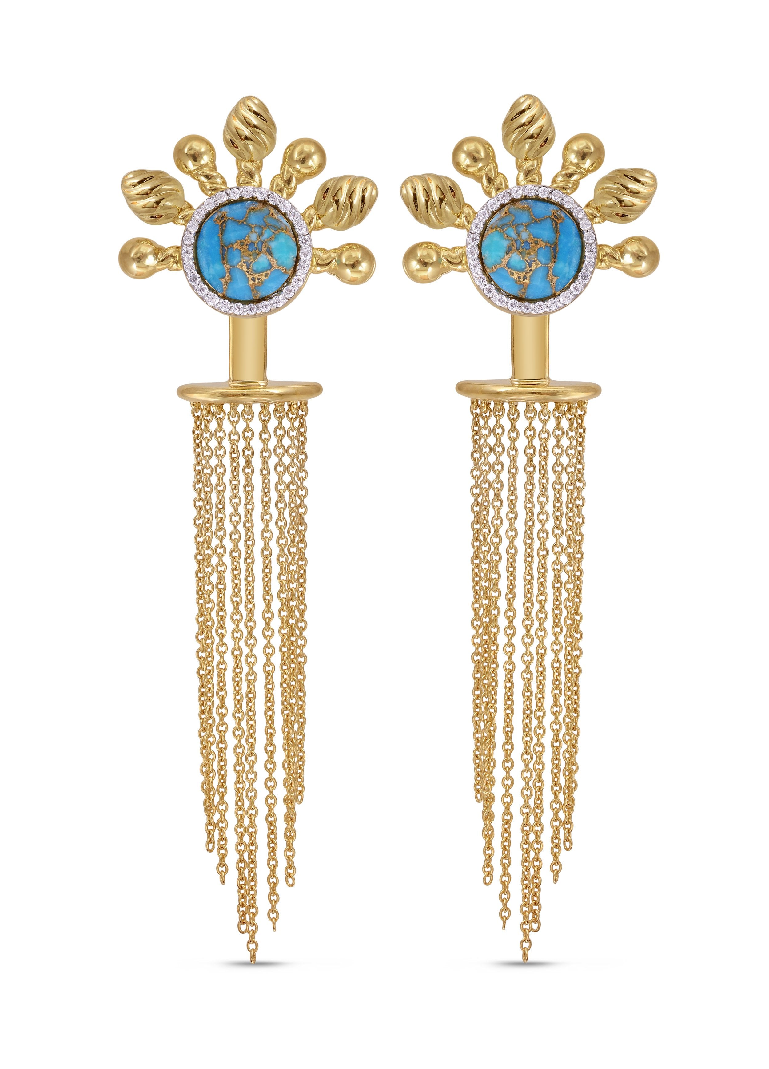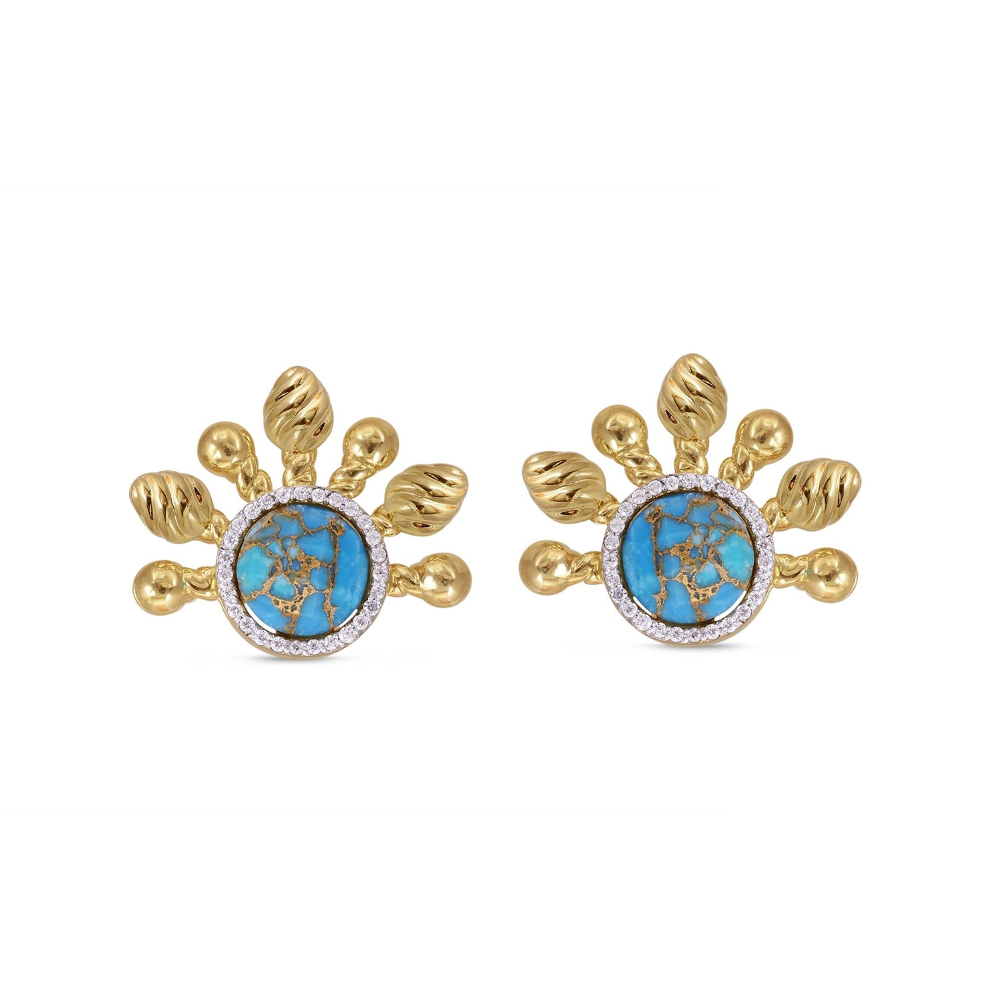 1/5 carats of certified diamonds used in a plate prong setting and can be worn 4 different ways (turquoise stud earrings turquoise studs with twisted metal halfsun backplates turquoise studs with chandeliers and all the parts together). Crafted in 925 Sterling Silver plated in 14K Yellow Gold.