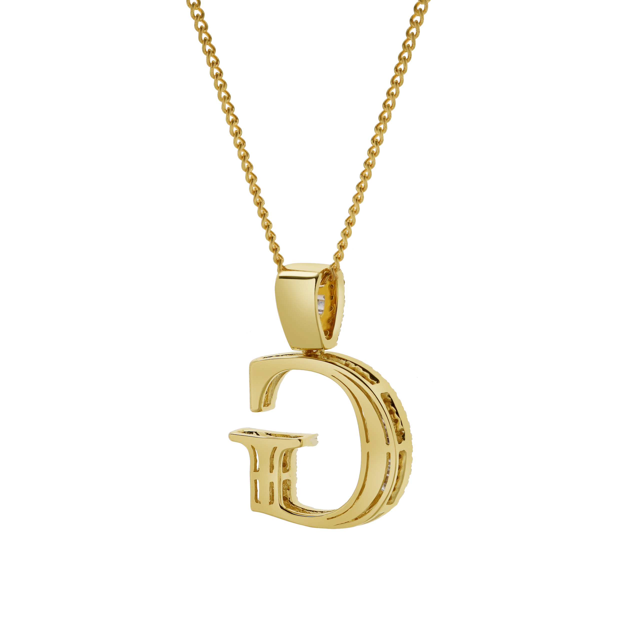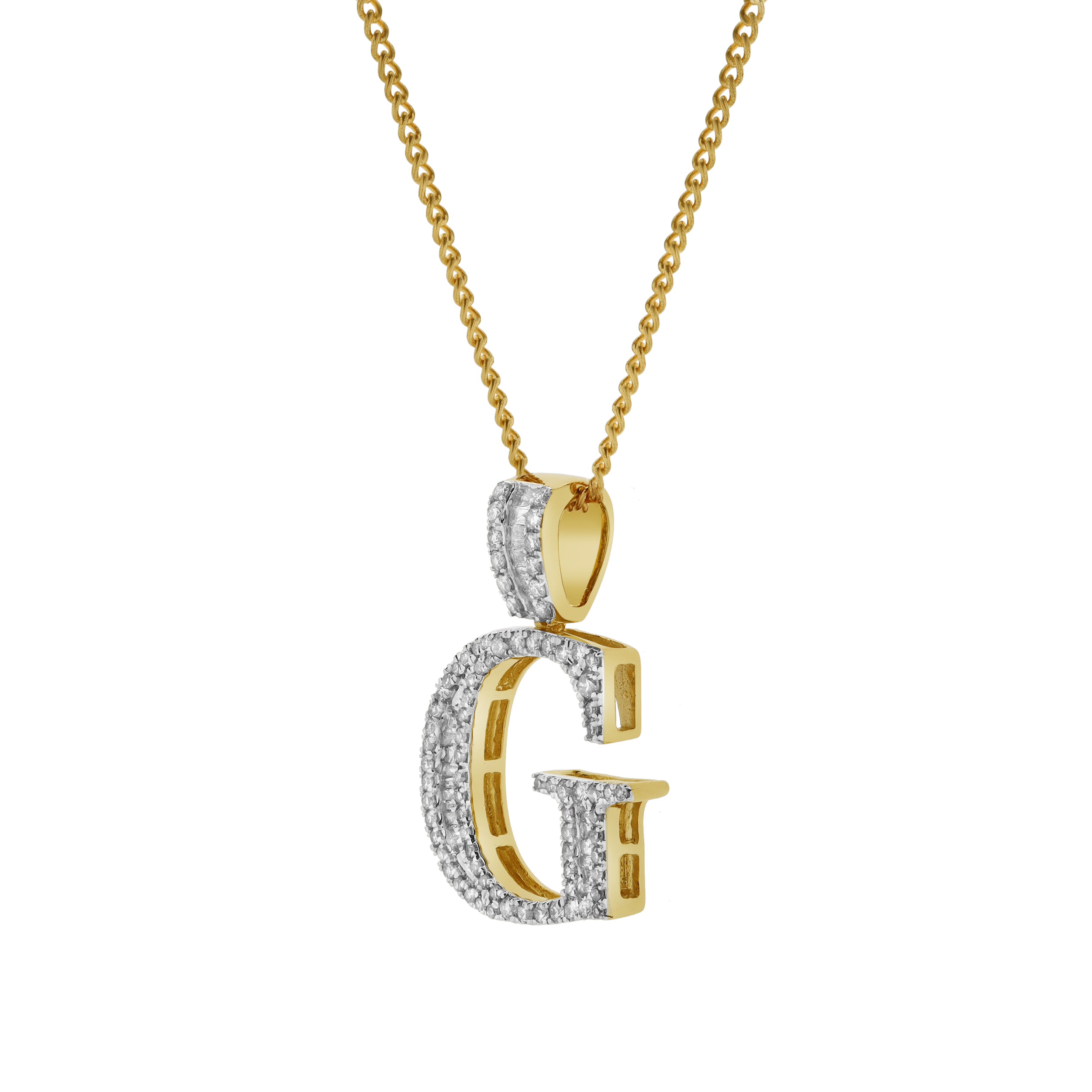Crafted in 10K Yellow Gold this G initial pendant showcases 0.64 carats of G SI1 diamonds with an elegant profile and expert craftsmanship. CHAIN NOT INCLUDED.