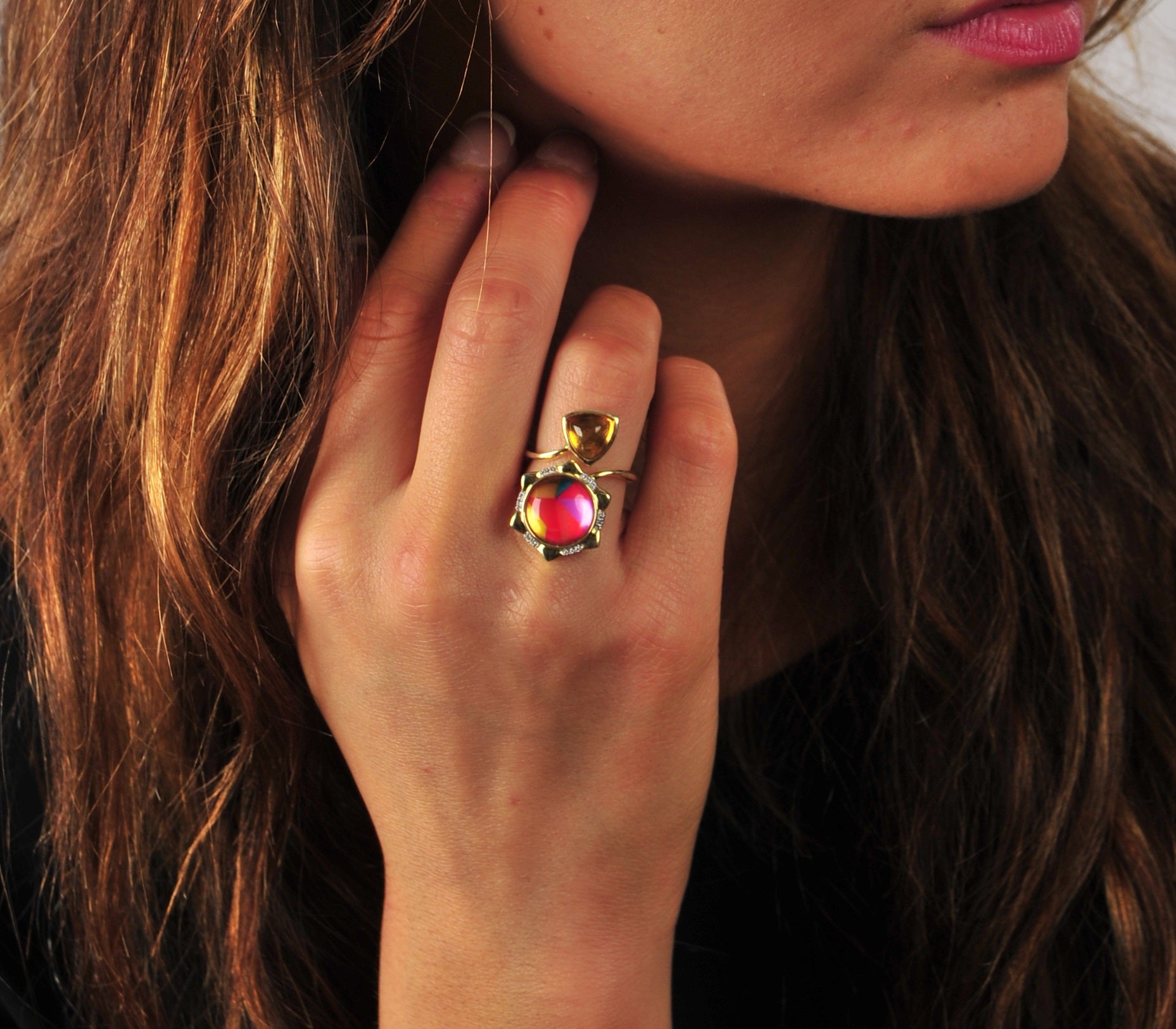 Crafted in 925 Sterling Silver this ring features a trillion shaped citrine stone and a geometric colorful motif encased by crystal set alongside 1/20 carats of certified diamonds in a plate prong setting. This Ring Plated in 14 KT Yellow Gold.