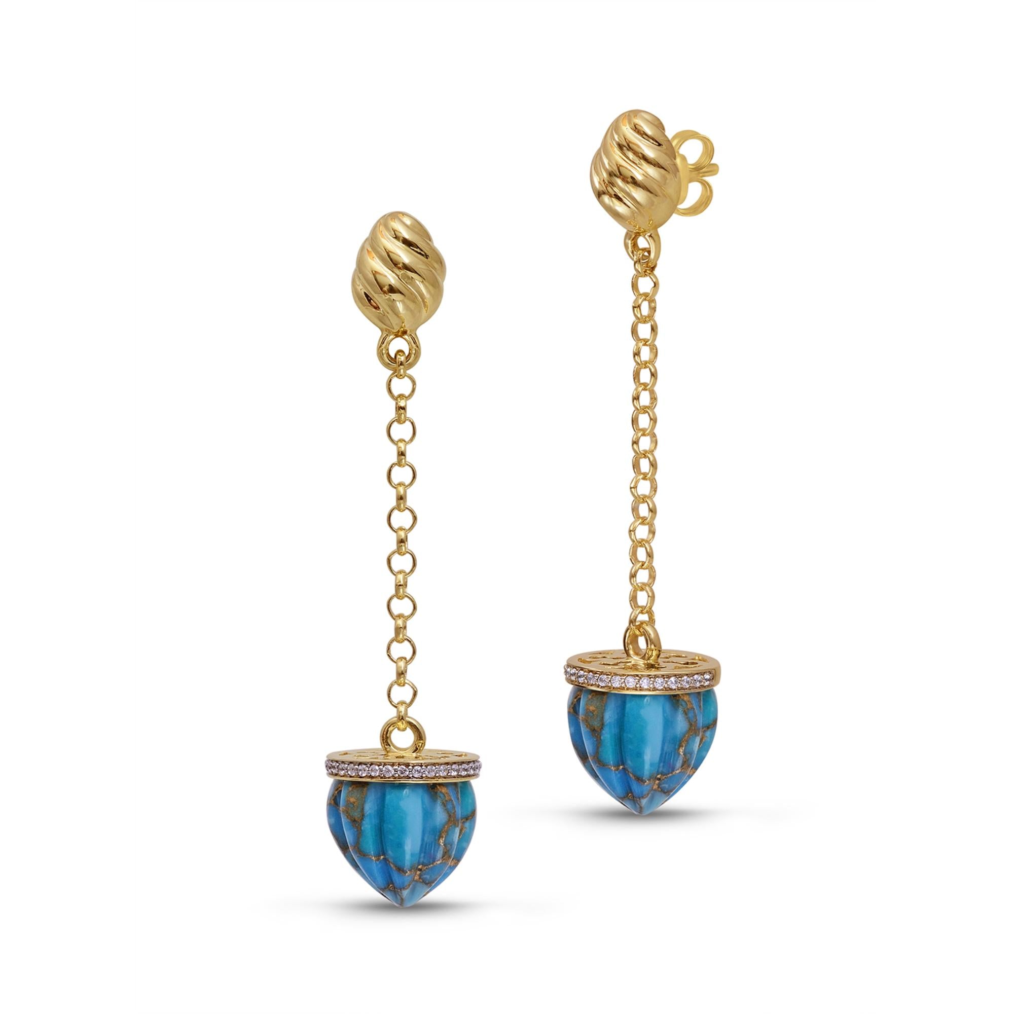 Inspired by the sun these dangle Earrings from the LMJ Sunshine Twist Collection feature 1/6 carats of certified diamonds used in a pre pave setting alongside carved turquoise stone drops. Crafted in 925 Sterling Silver and plated in 14K Yellow Gold.