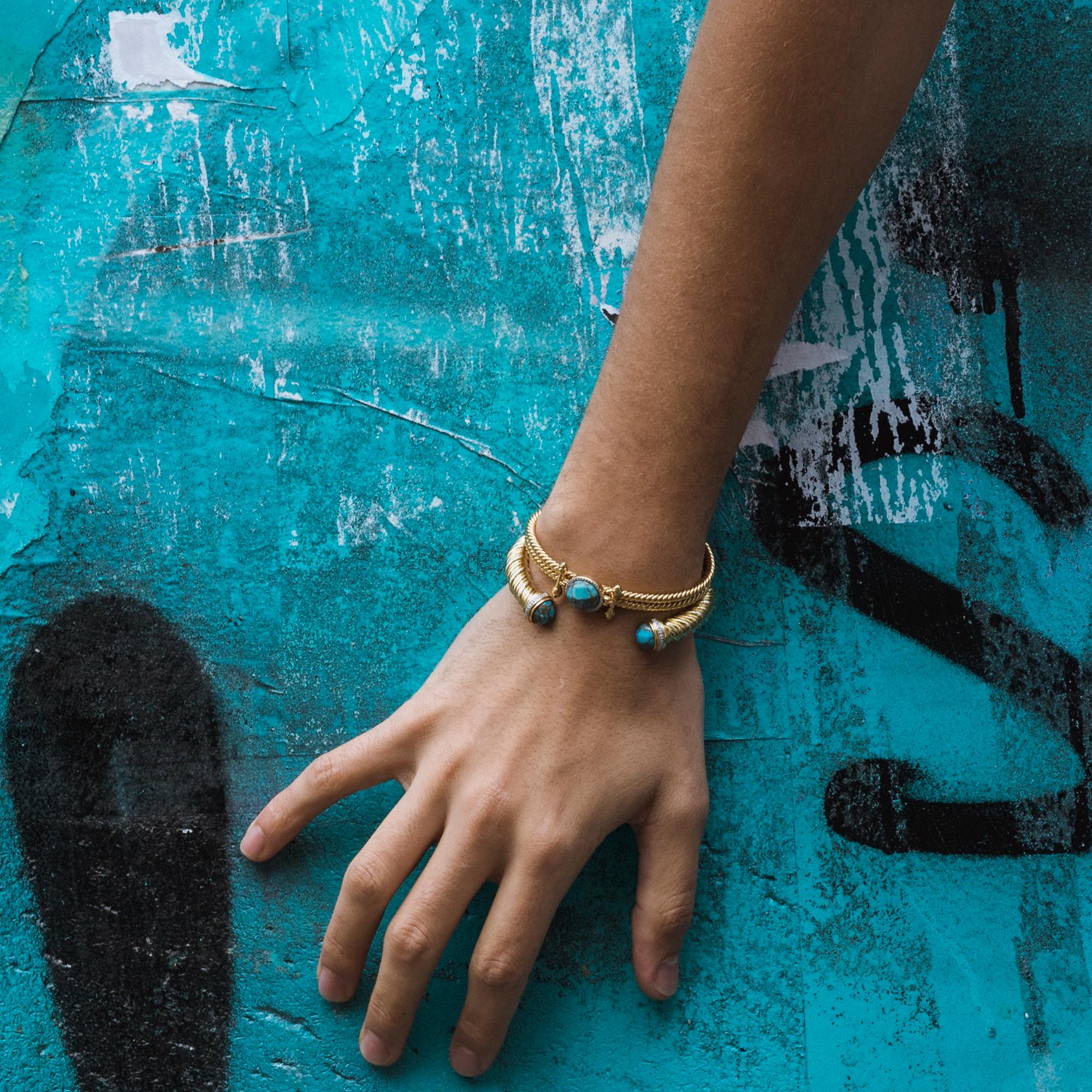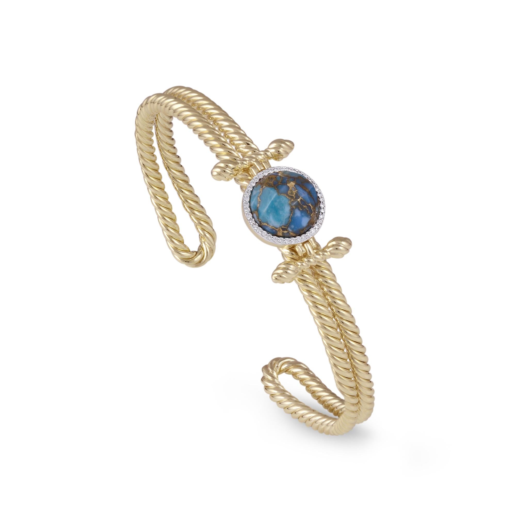 Inspired by the sun this elegant Cuff from the LMJ Sunshine Twist Collection features 1/6 carats of genuine diamonds used in a plate prong setting alongside carved turquoise stones. Crafted in 925 Sterling Silver and plated in 14K Yellow Gold. This cuff is offered in Small Medium and Large Sizes.