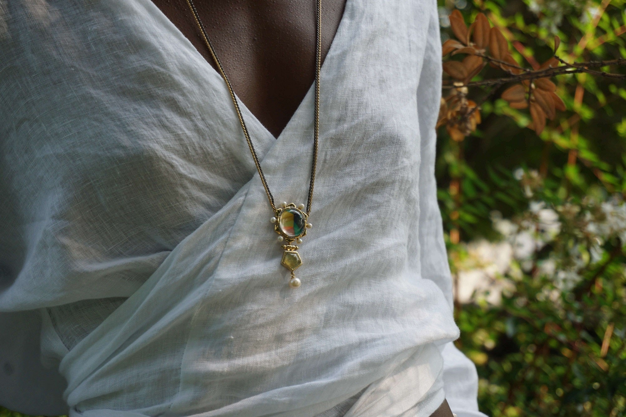 Gypsy Soul Prehnite & Pearl Diamond Necklace in 14K Yellow Gold Plated Sterling Silver