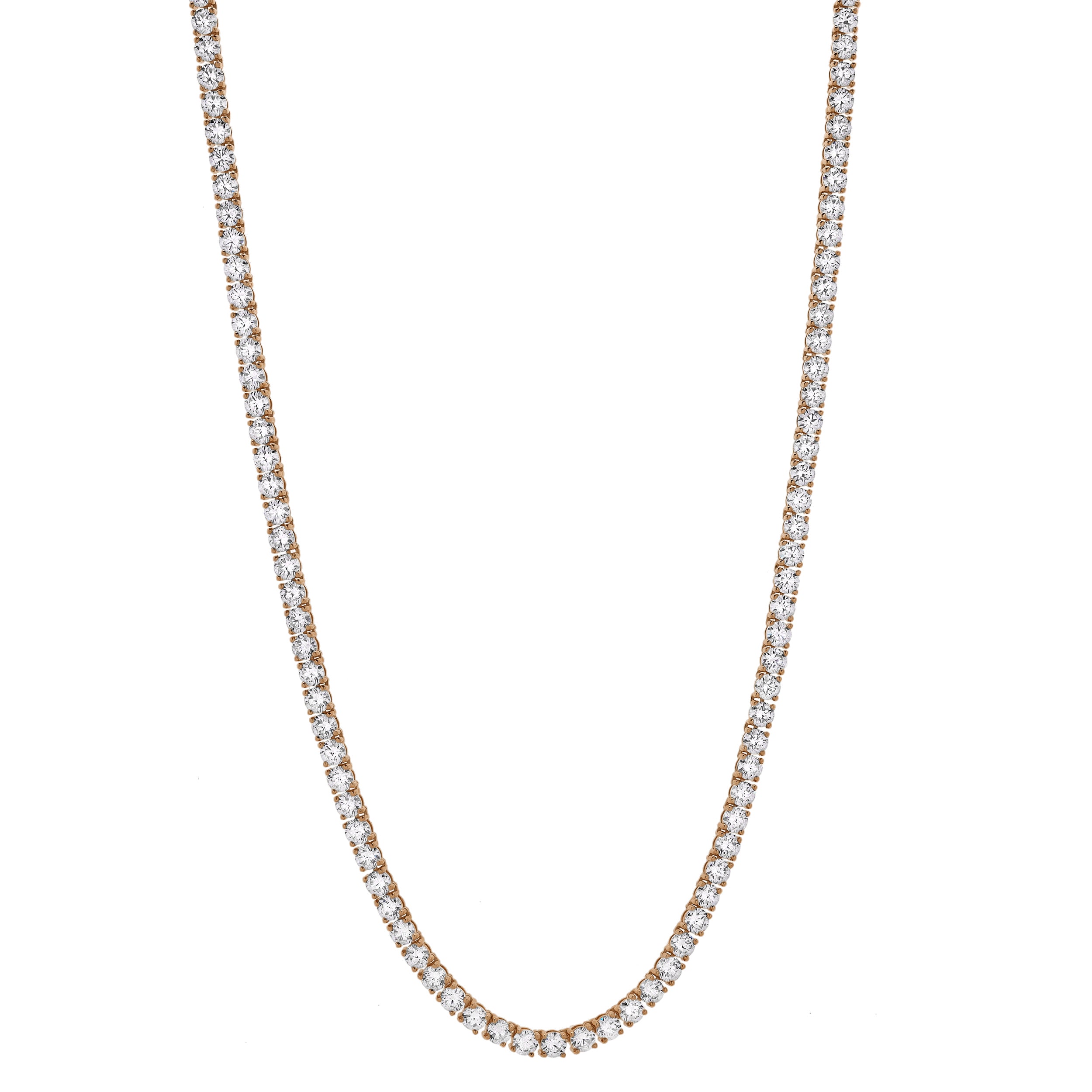 Crafted in 10K Rose Gold this 18 inch tennis chain showcases 18.85 carats of H VS1 diamonds with an elegant profile radiating timeless brilliance. Stated carat weights may fluctuate by 0.05 carats.