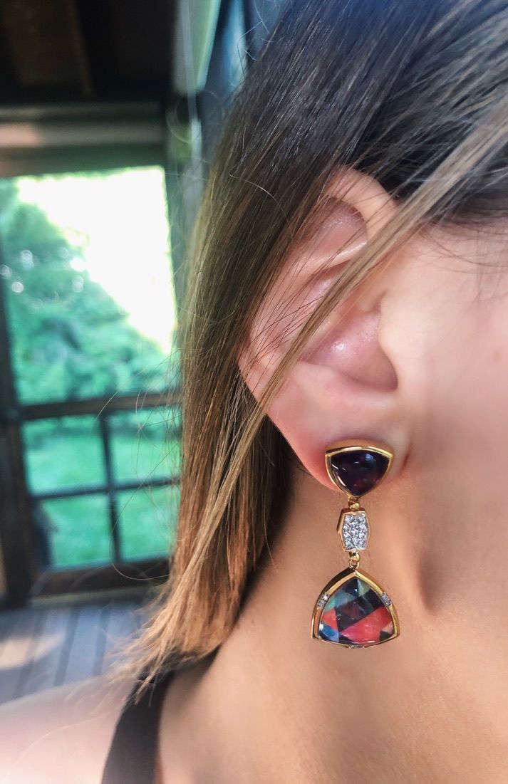 Crafted in 925 Sterling Silver these statement earrings feature trillion shaped amethyst stones linked to triangular colorful motifs encased by crystal with 1/4 carats of diamonds in a pre pave setting. These earrings are plated in 14 KT Yellow Gold.