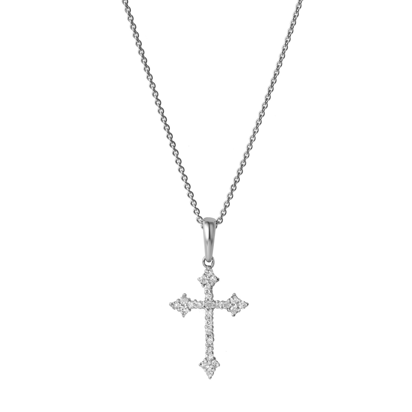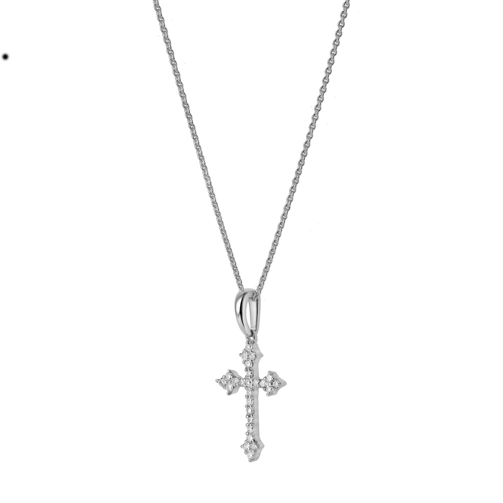 Classic faith meets contemporary style in the Lumina Cross Diamond Pendant. Delicately crafted in 14K white gold and adorned with 0.11 carats of shimmering natural diamonds. This pendant necklace offers a refined take on spiritual elegance and is a graceful everyday symbol. Perfect for layering or wearing solo. The necklace comes with a chain.