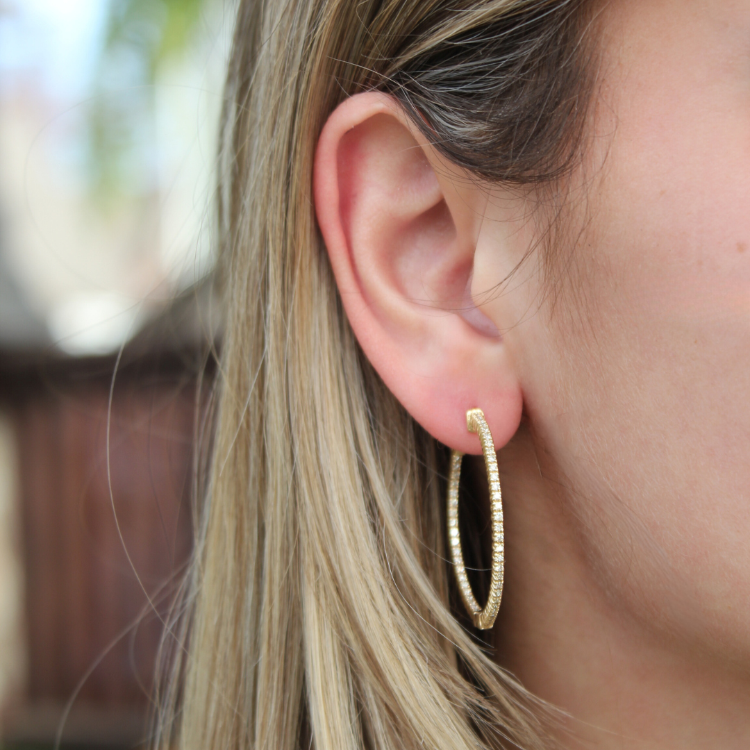 Elegant 14K Yellow Gold Hoop earrings crafted with beautiful craftsmanship and adorned with 1.9 carats of SI2 diamonds. Comfortable to wear with a diameter of 3.3 cms.