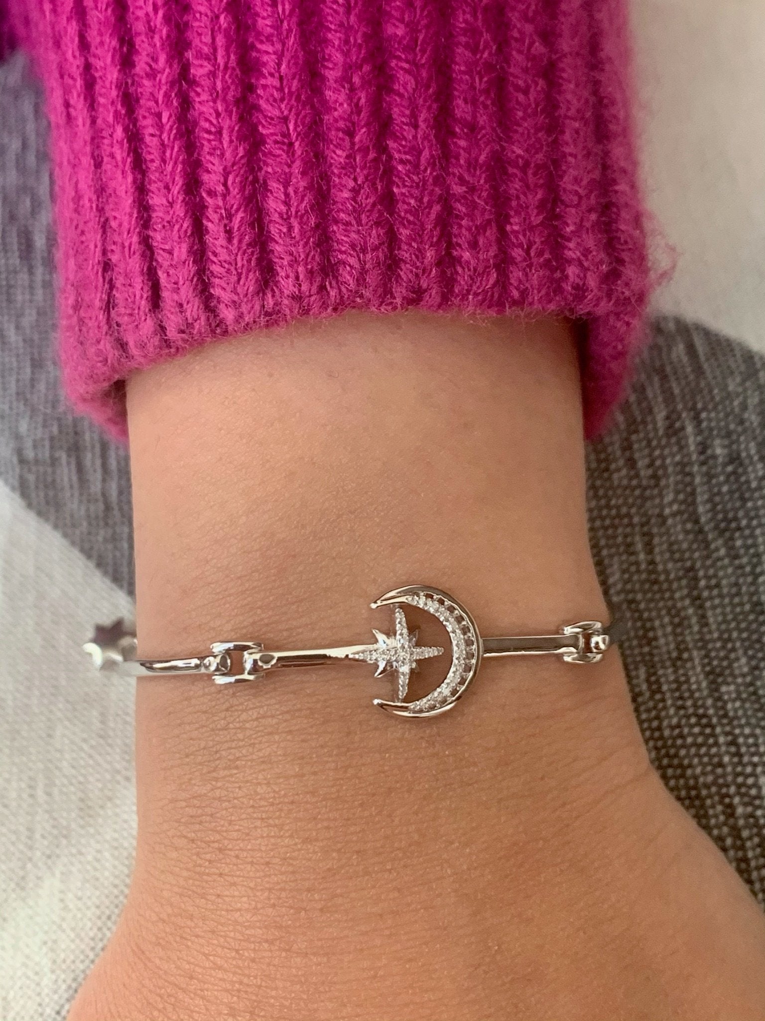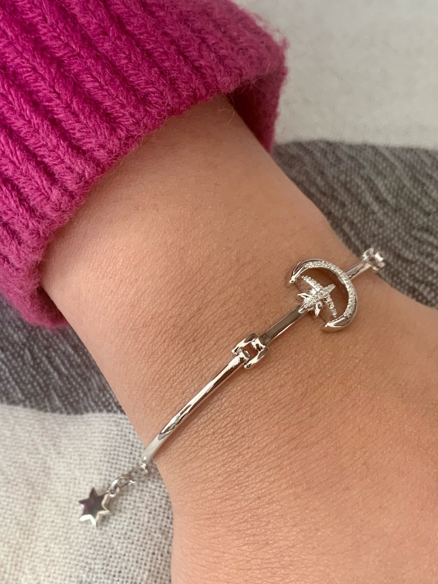 Give your wrist a taste of the moon and its sheer beauty with our Nighttime Lovers Crescent Bangle. Crafted in 14K White Gold, this bangle features 0.06 carats of 100% natural, genuine diamonds perfectly set in an individual plate prong setting.