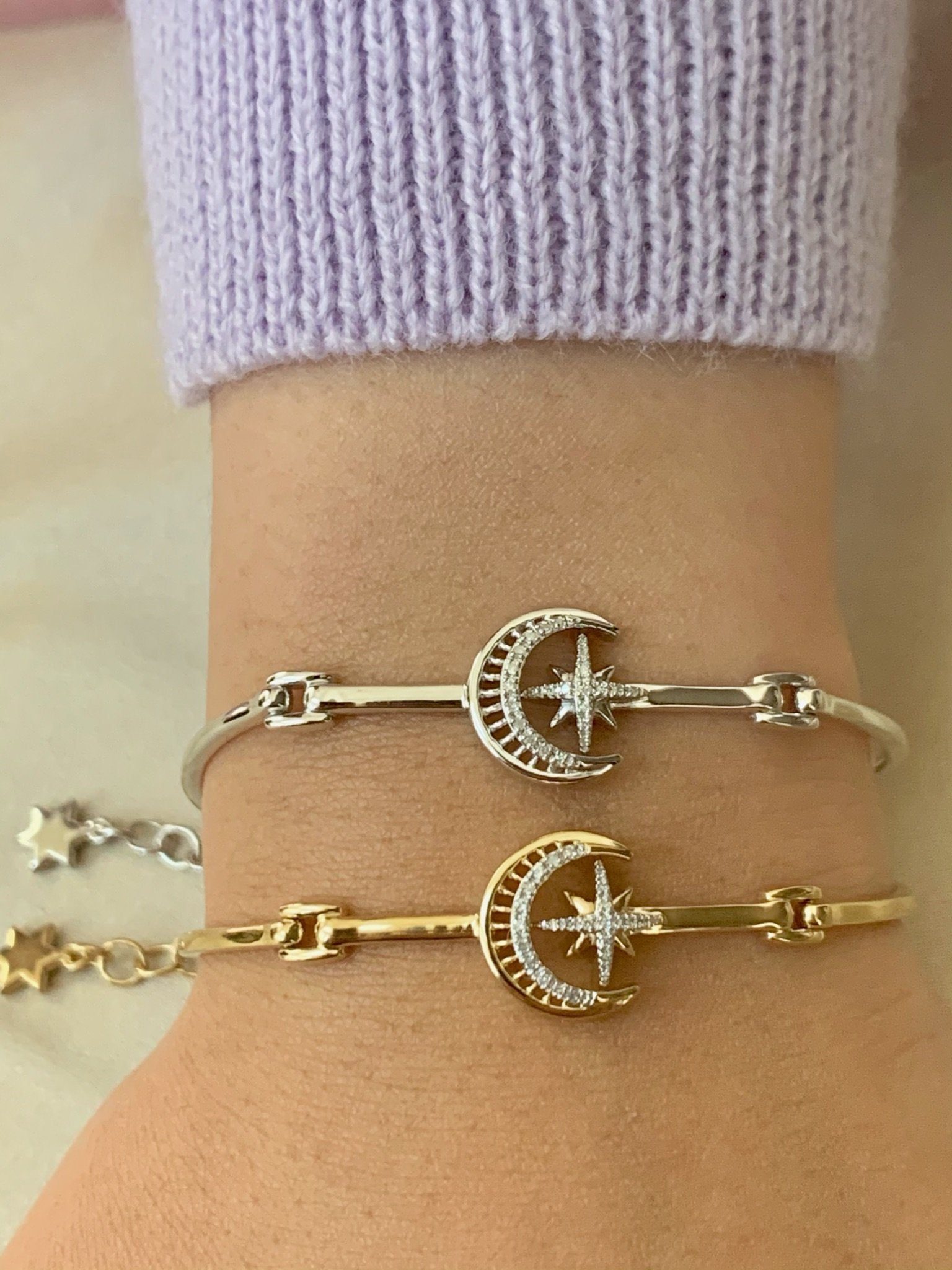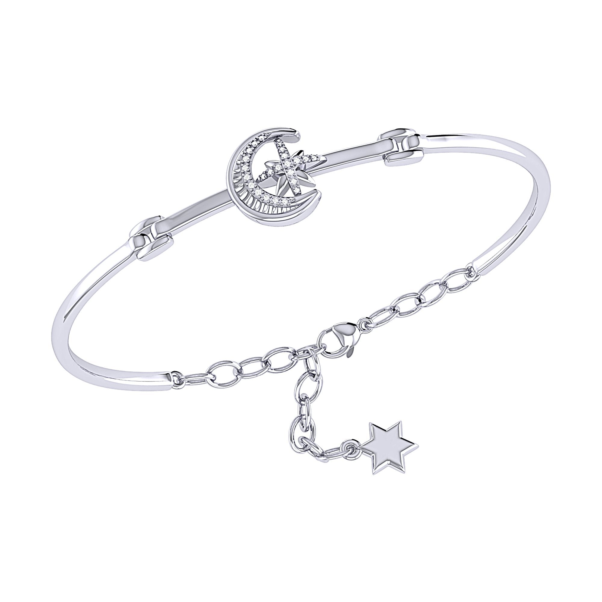 Capture the romance of the night with our Nighttime Lovers Crescent Sterling Silver Diamond Bangle. Expertly handcrafted with timeless beauty and grace.