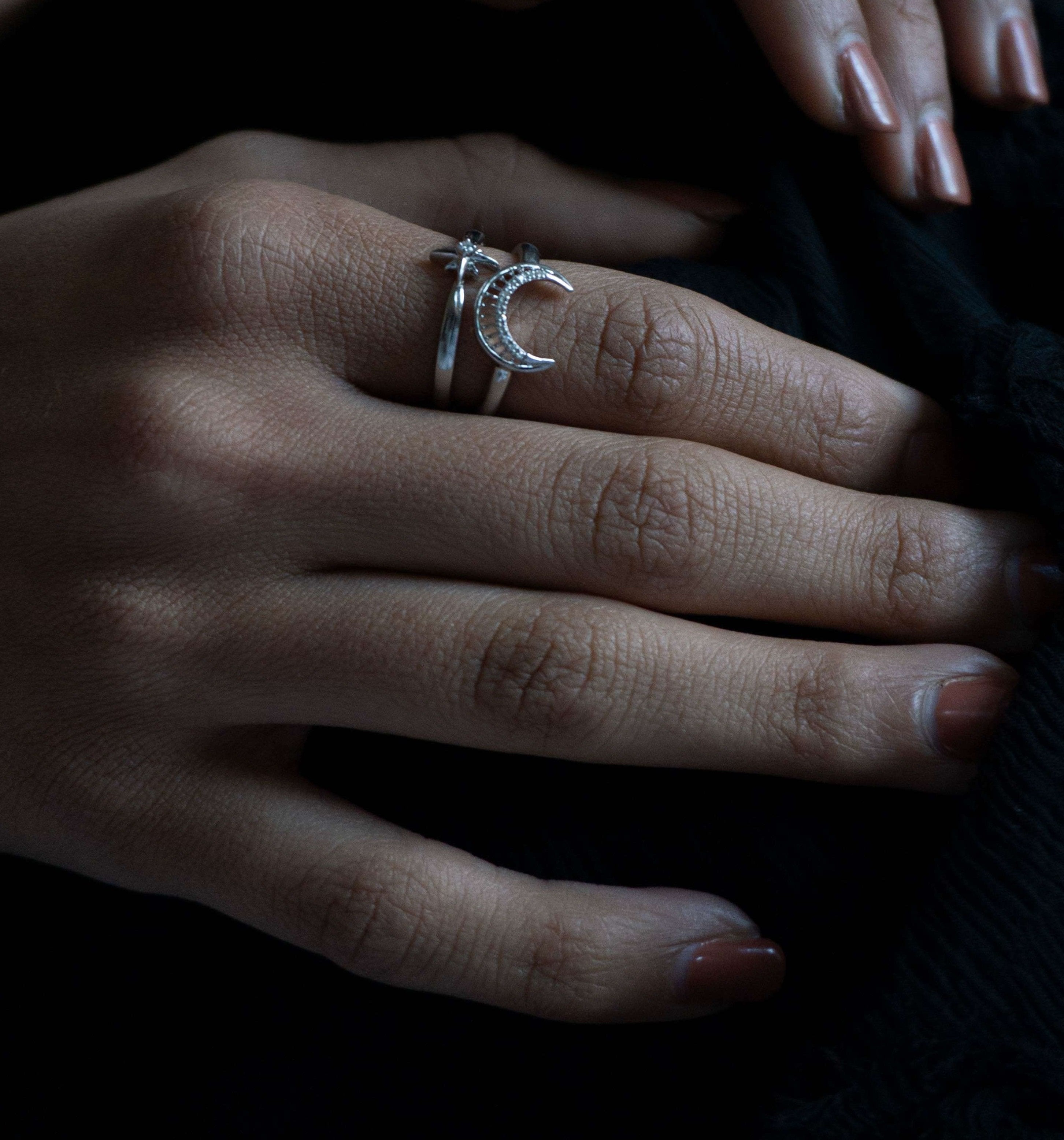 Find yourself enveloped by the evening with our Nighttime Lovers Detachable Ring. Crafted in 14K White Gold, this ring features 100% natural, genuine diamonds and comes with two separate bands. 0.04 carats of diamonds are used in individual plate prong and collet prong settings. This ring is offered in custom sizes. The combined thickness for both ring bands ranges from 5 mm to 11.7 mm.