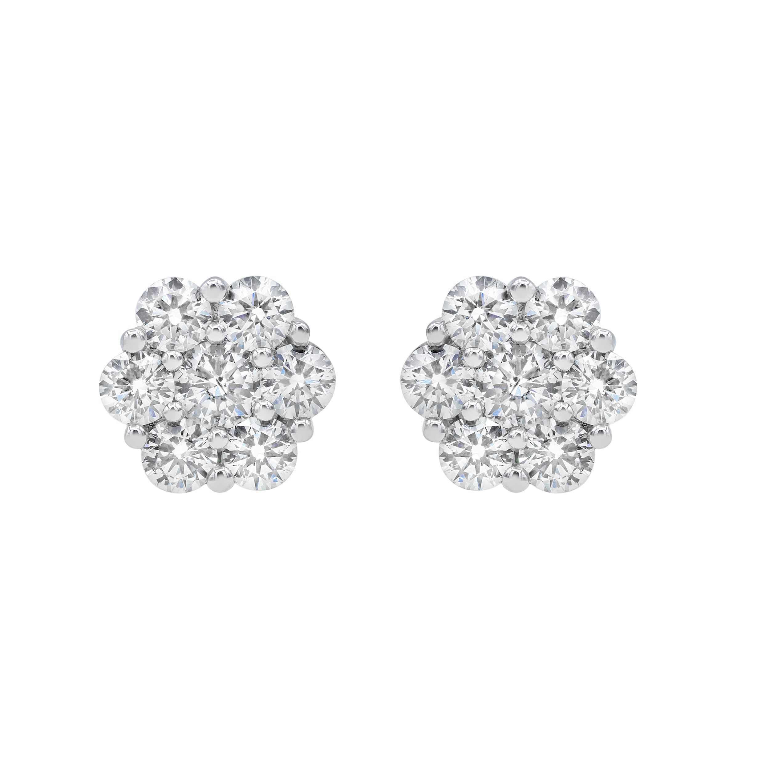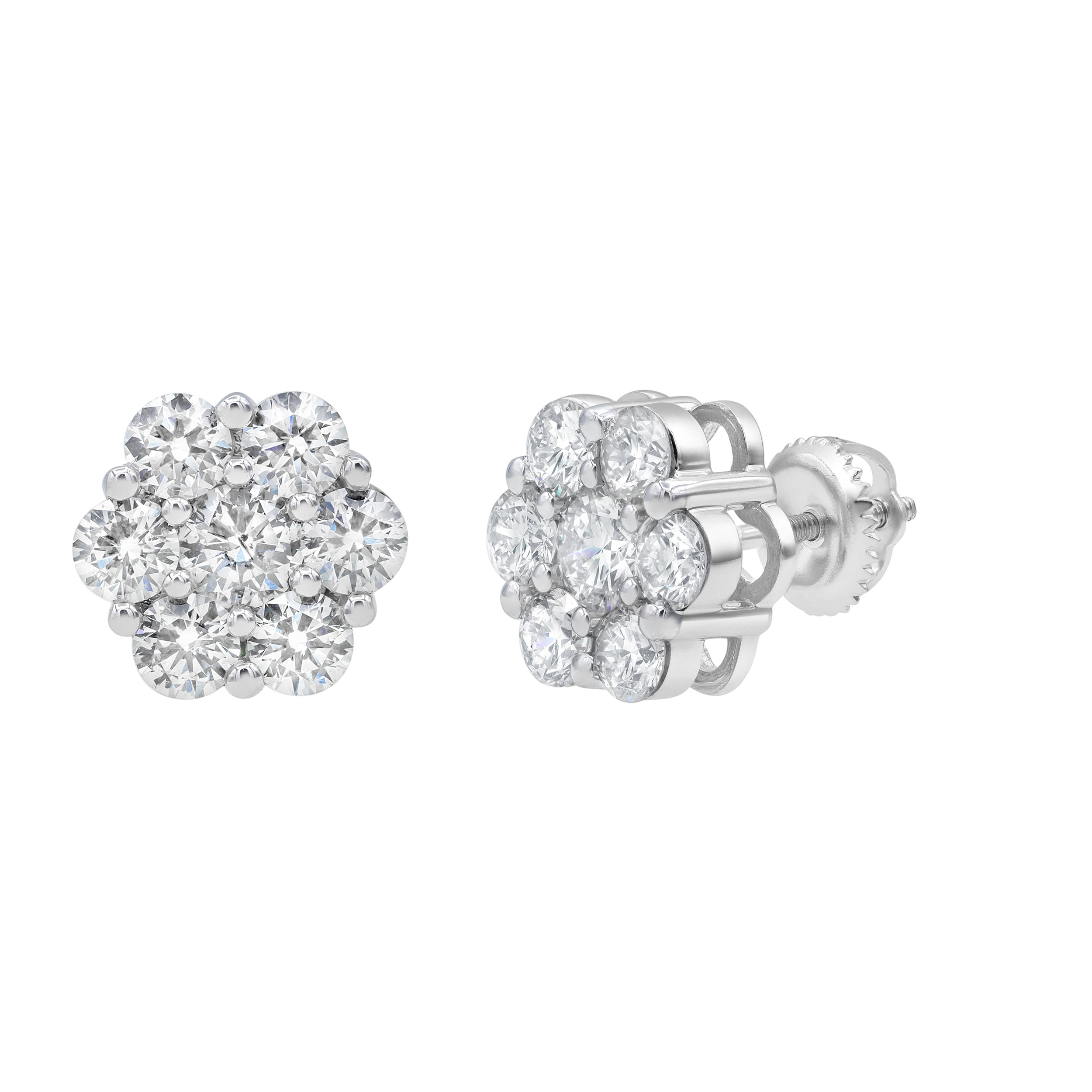 These 2.26 carat diamond earrings feature a delicate flower cluster design meticulously set in 14k white gold with a screwback setting. Their elegant arrangement highlights the timeless brilliance of the diamonds.