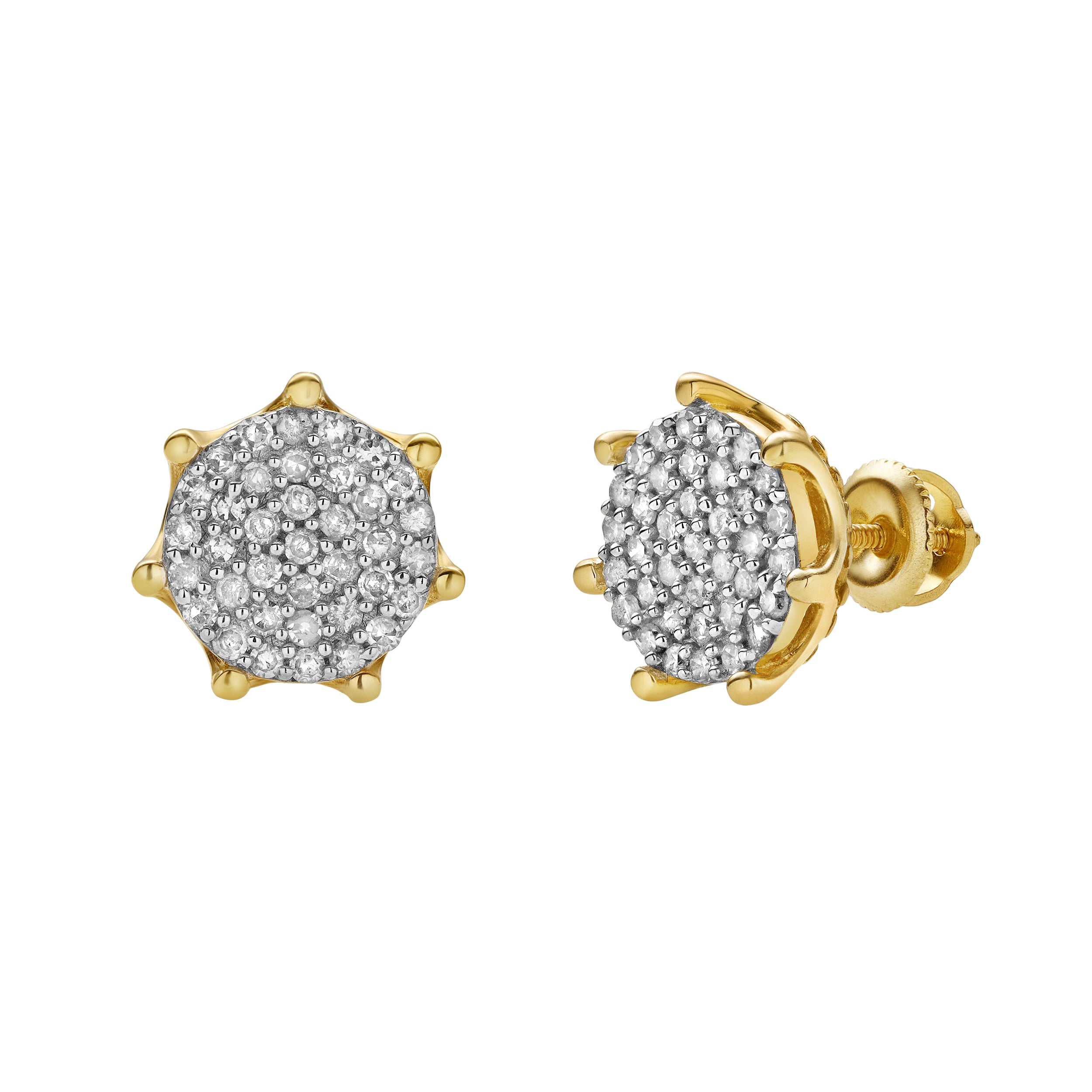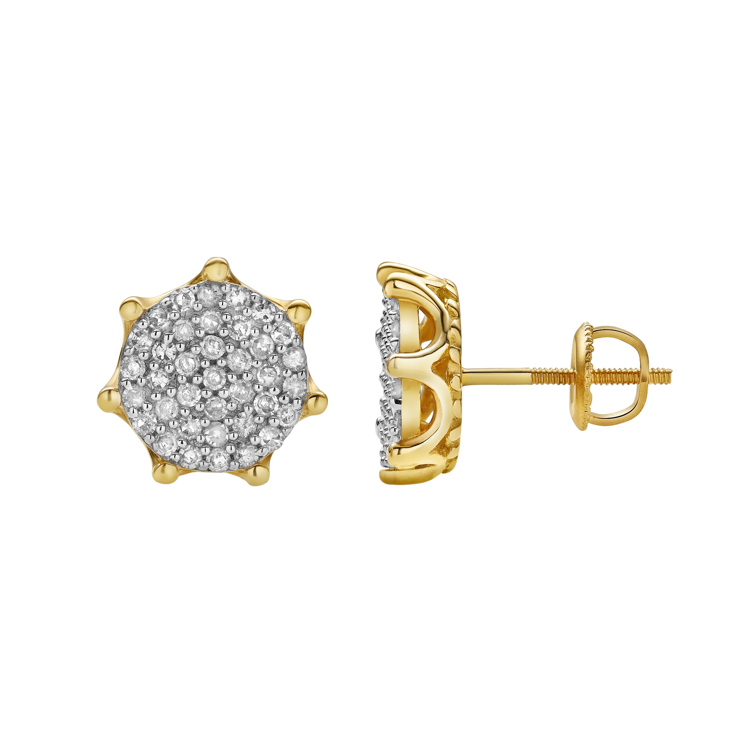 These gorgeous 0.51 carat diamond earrings feature a delicate cluster design meticulously set in 10k yellow gold frame shaped like a flower and a screwback setting. Their elegant arrangement highlights the timeless brilliance of the diamonds.