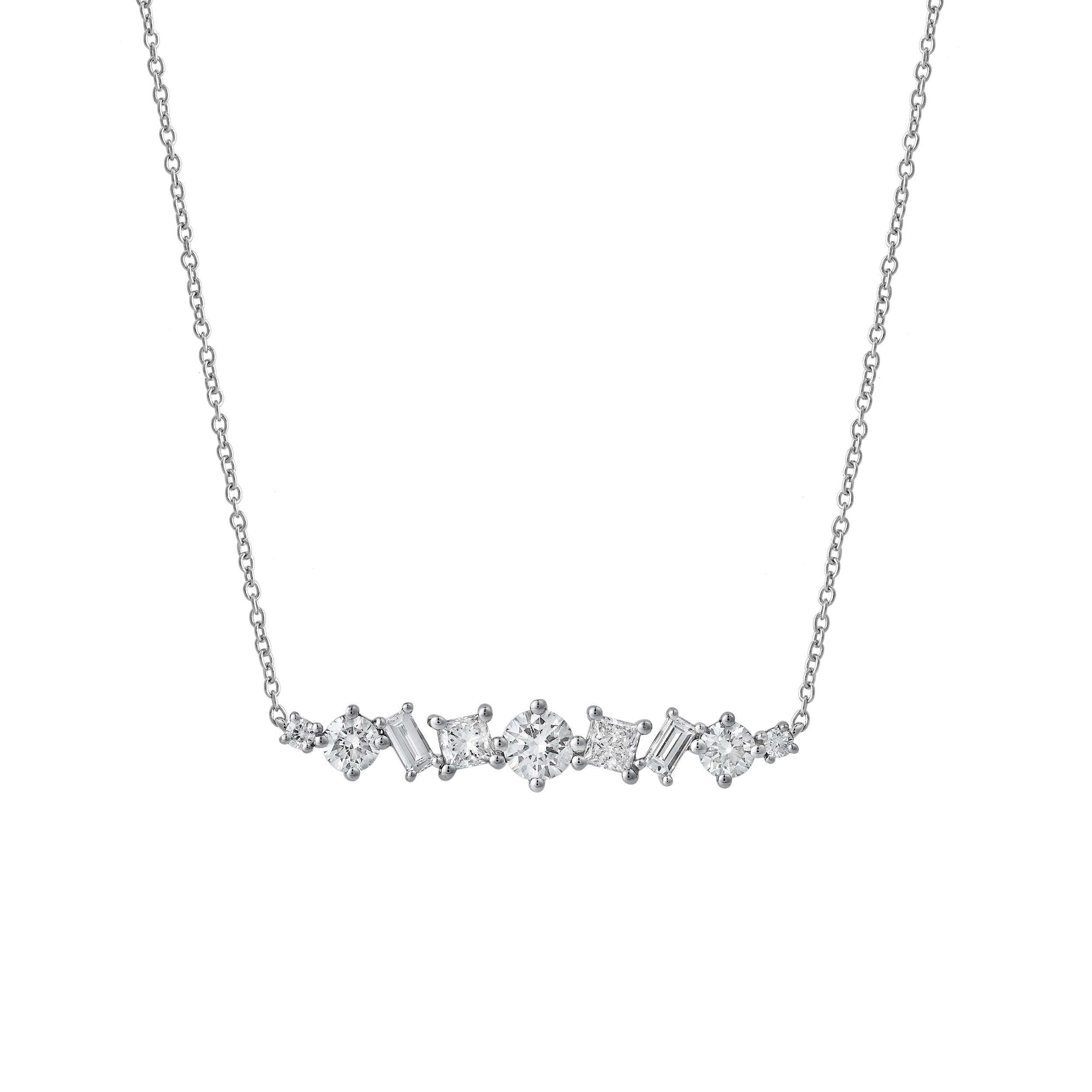 Our Oryssa diamond bar necklace blends modern symmetry with timeless sparkle. Crafted in 14K White Gold with 0.75 cts of lab grown pear round and baguette cut diamonds. The mix of shapes creates a soft mosaic effect with elegant dimension. Perfect for everyday wear or layered for a curated look. The chain is 18 inches. Each piece is handmade with care and a commitment to conscious craftsmanship. Diamond carat weight may vary up to 0.05 carats from the stated weight.