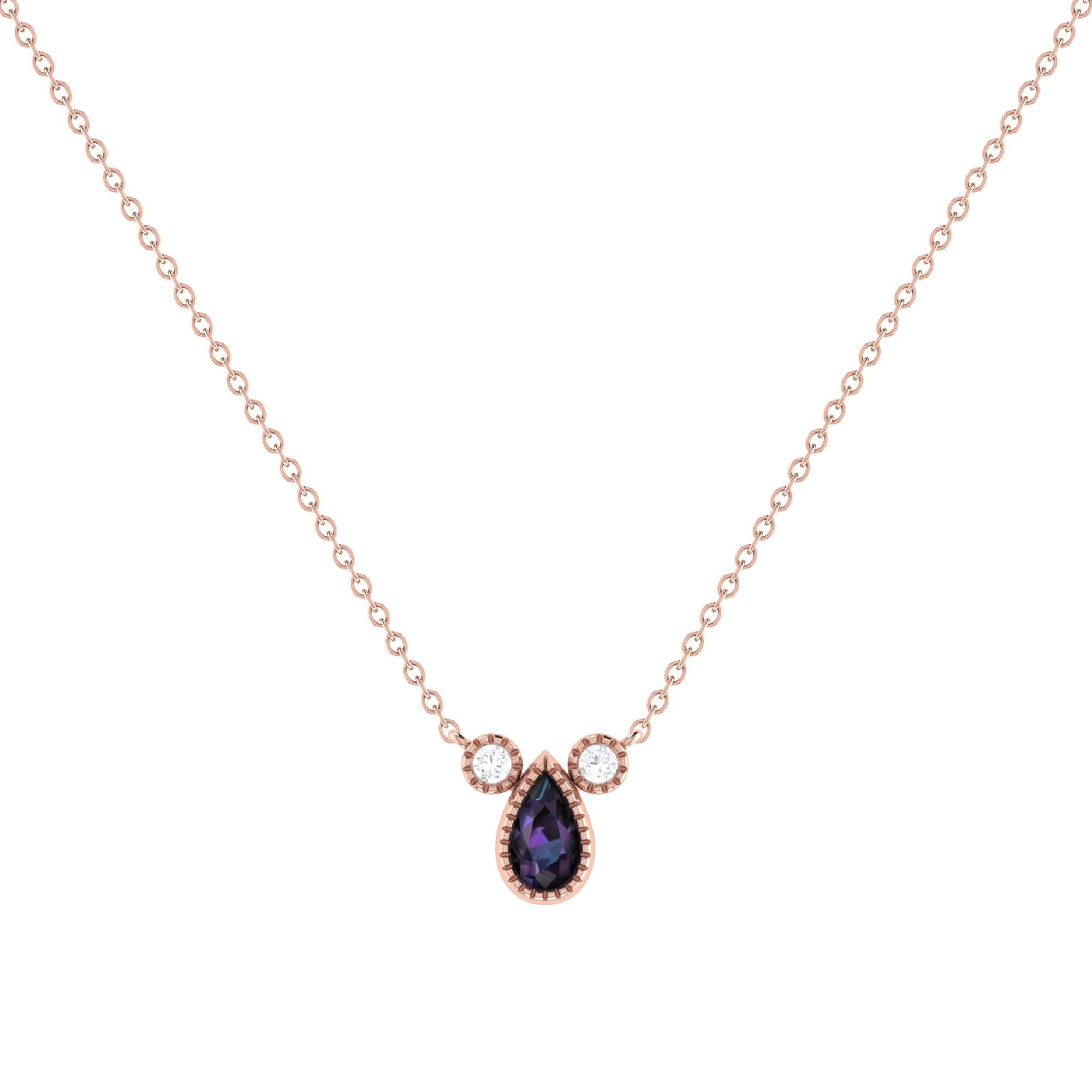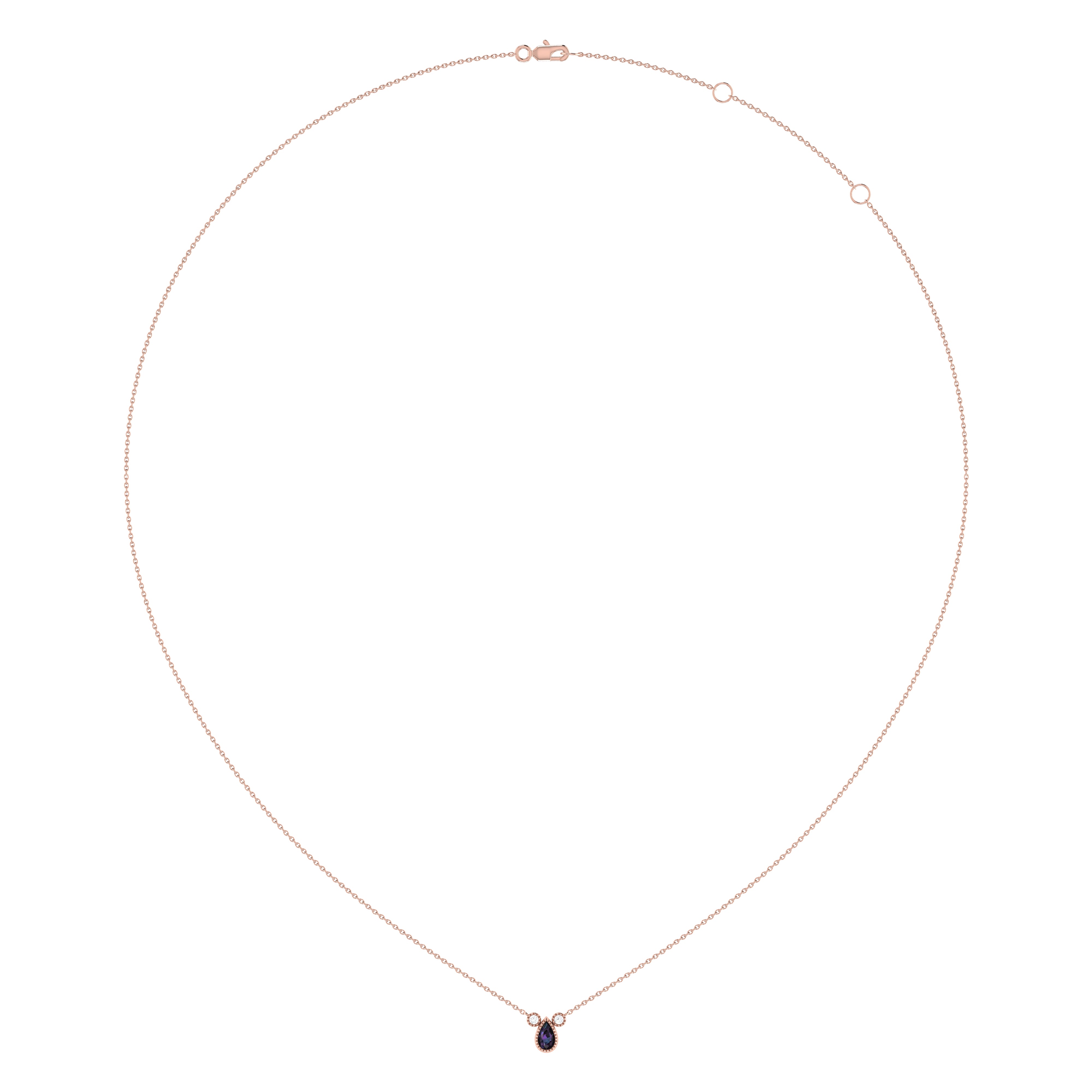 Crafted in 14K Rose Gold, this necklace features a pear shaped alexandrite gemstone (5 by 3 mm), along with 0.04 carats of genuine, natural diamonds in a bezel setting.