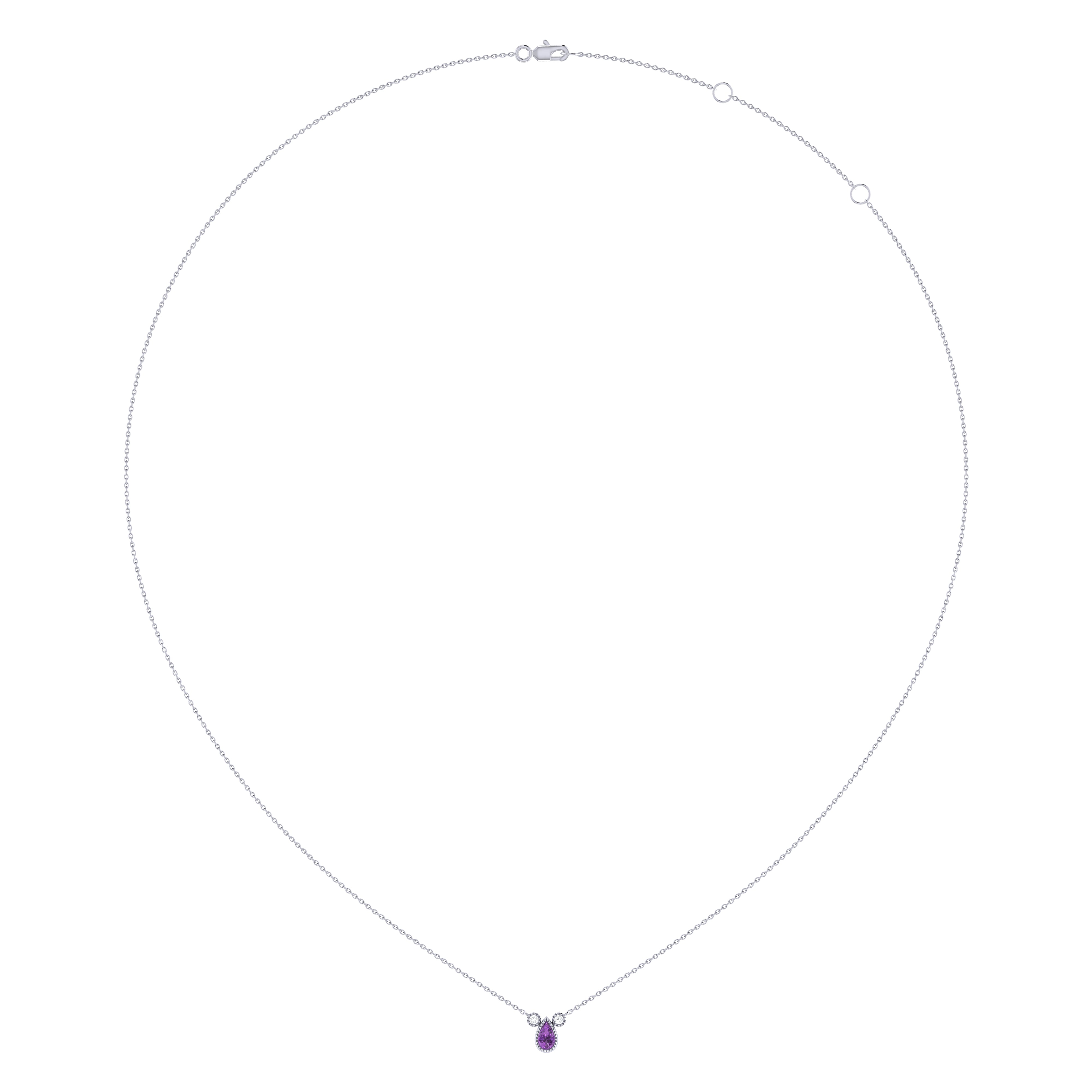 Crafted in 14K White Gold, this necklace features a pear shaped amethyst gemstone (5 by 3 mm), along with 0.04 carats of genuine, natural diamonds in a bezel setting.