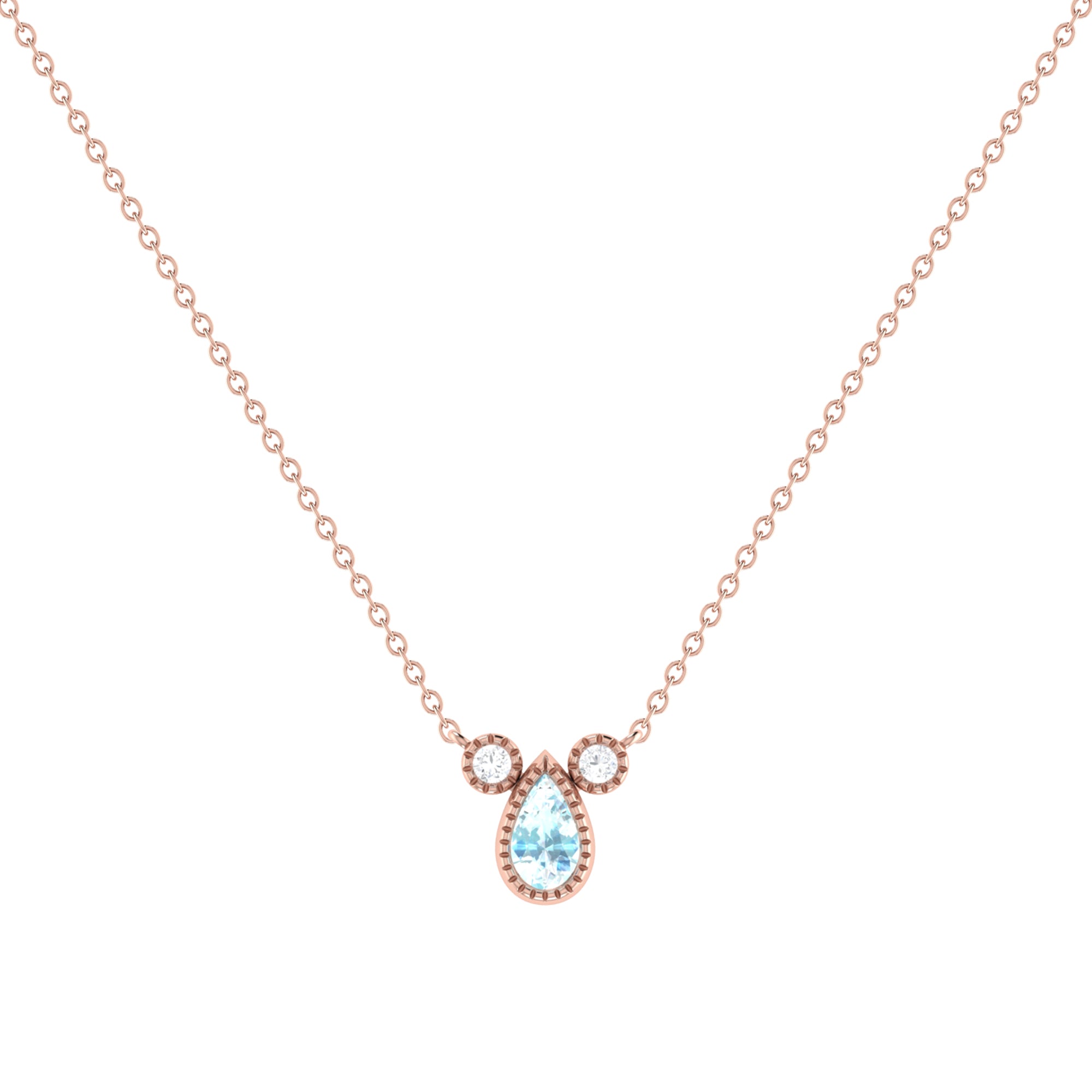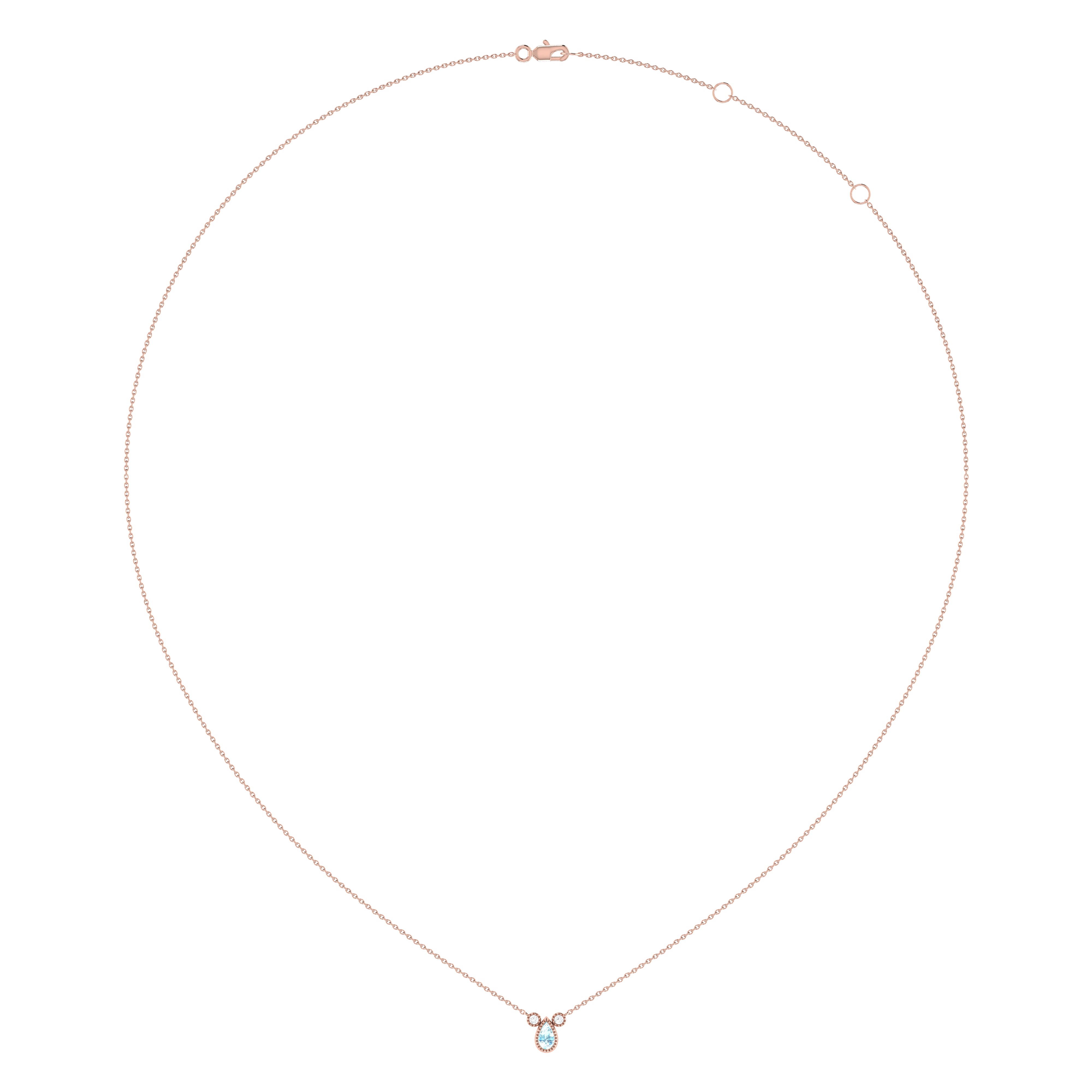 Crafted in 14K Rose Gold, this necklace features a pear shaped aquamarine gemstone (5 by 3 mm), along with 0.04 carats of genuine, natural diamonds in a bezel setting.