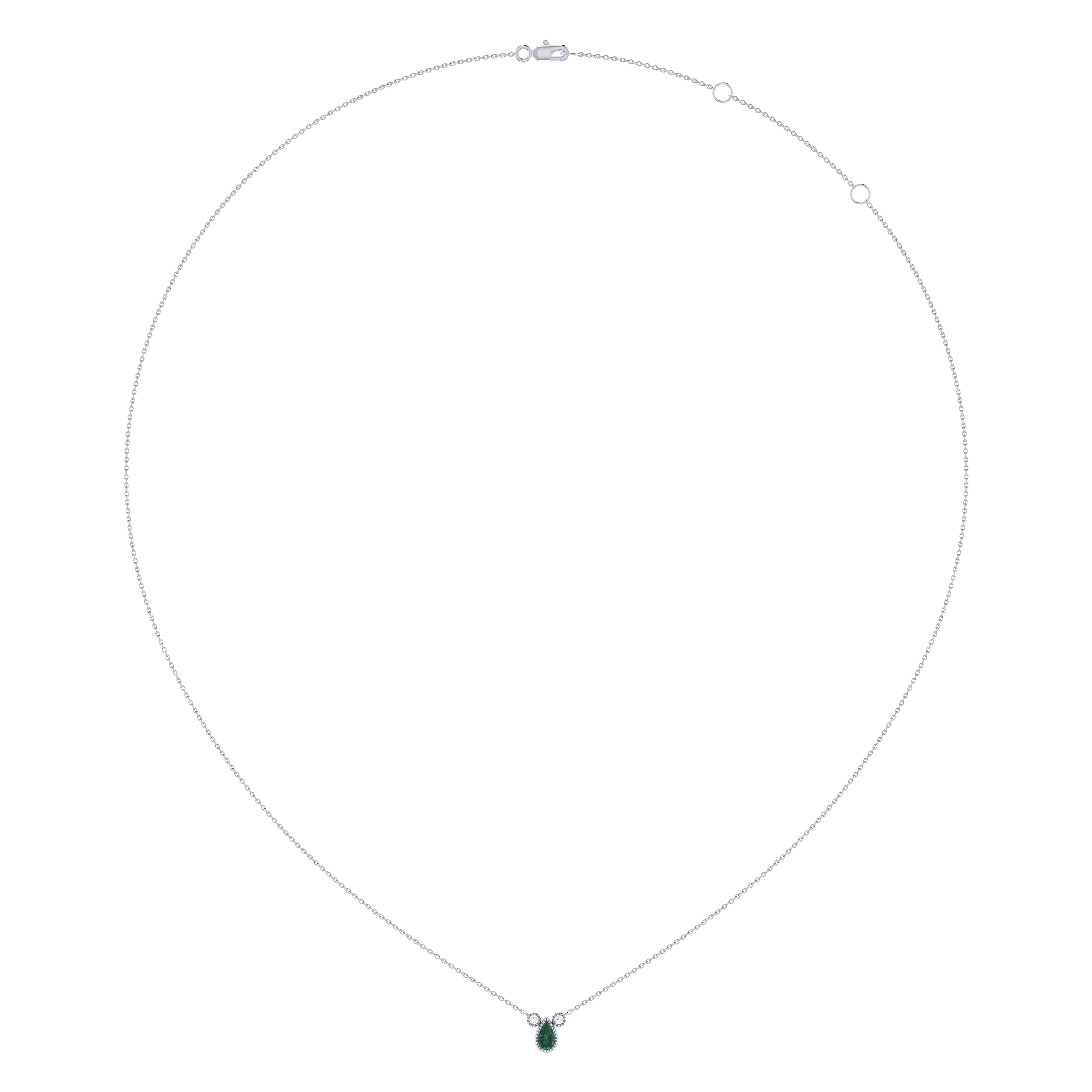 Crafted in 14K White Gold, this necklace features a pear shaped emerald gemstone (5 by 3 mm), along with 0.04 carats of genuine, natural diamonds in a bezel setting.