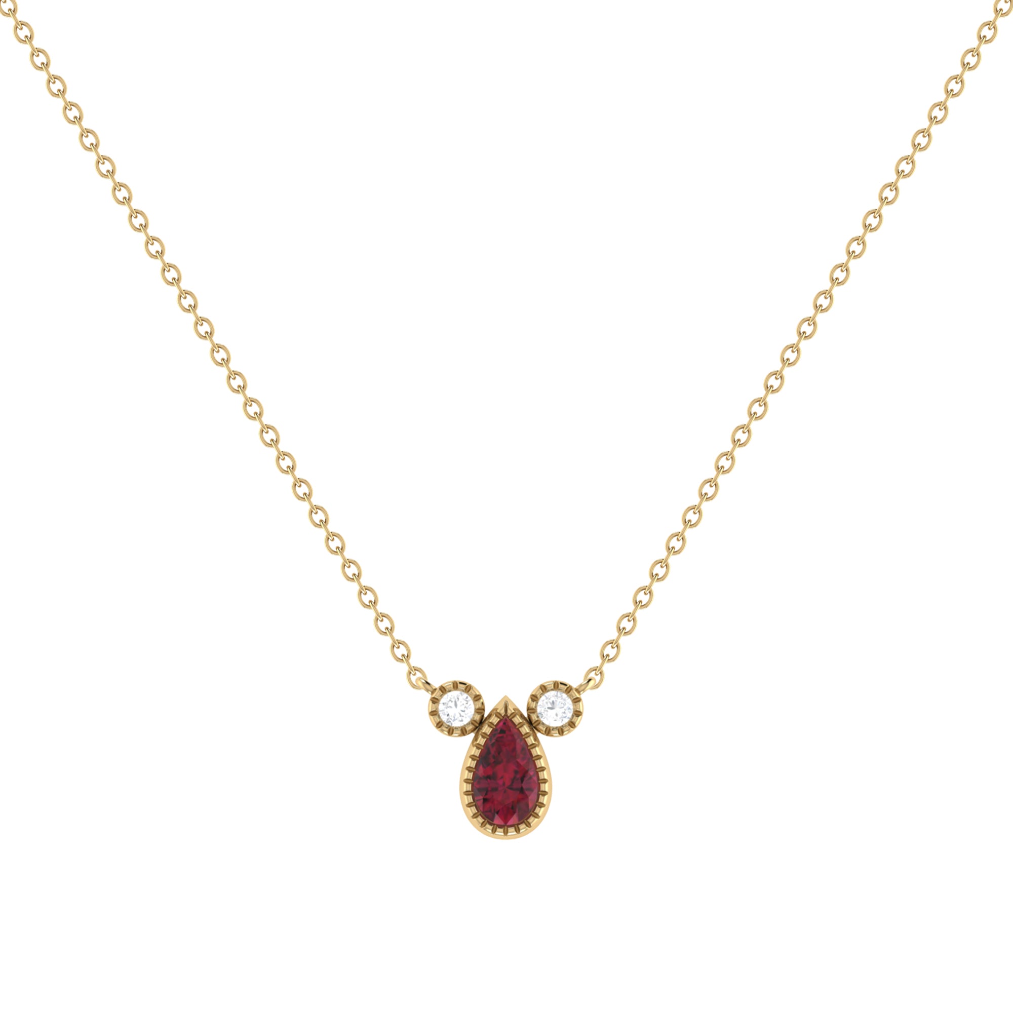 Pear Shaped Ruby & Diamond Birthstone Necklace In 14K Yellow Gold