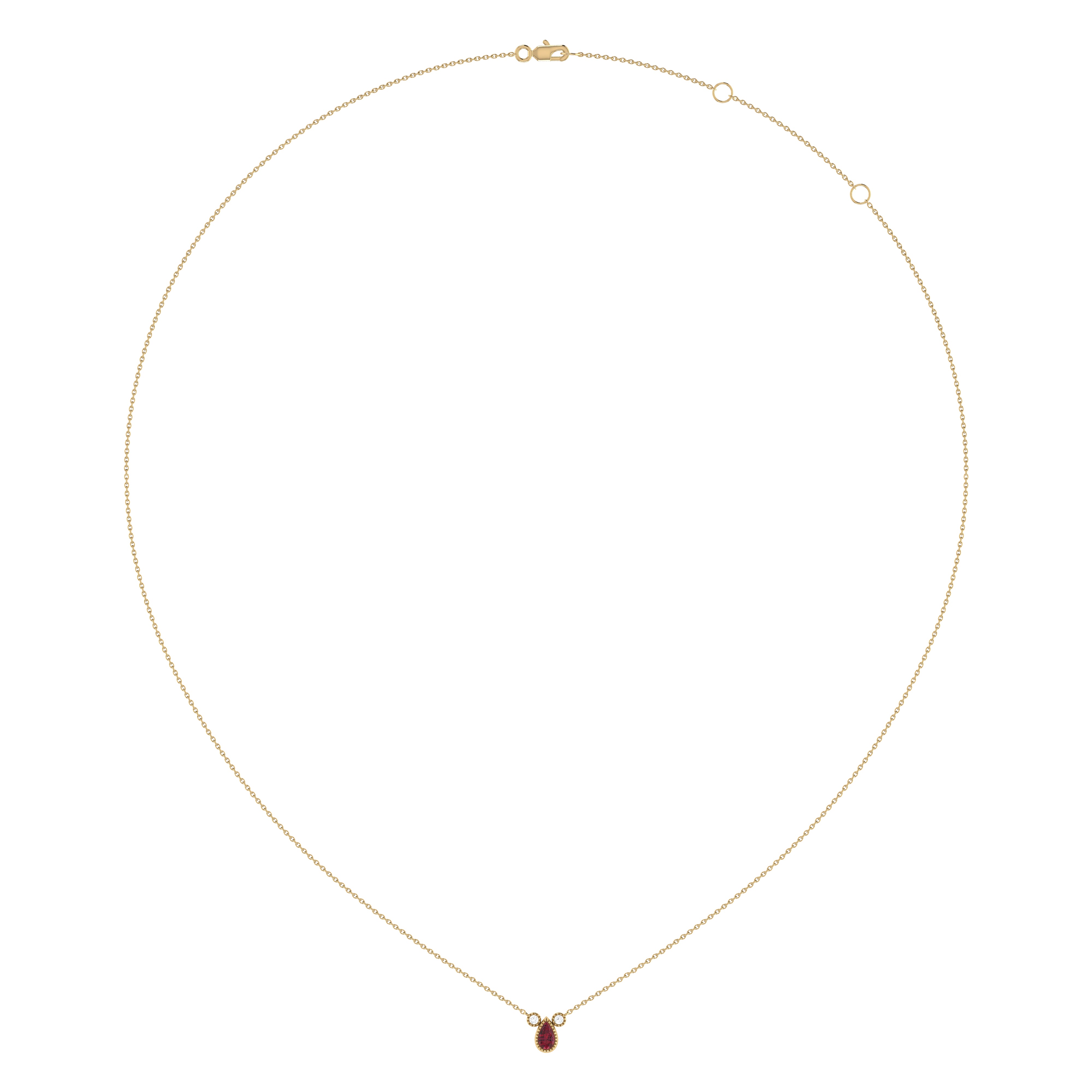 Crafted in 14K Yellow Gold, this necklace features a pear shaped ruby gemstone (5 by 3 mm), along with 0.04 carats of genuine, natural diamonds in a bezel setting.