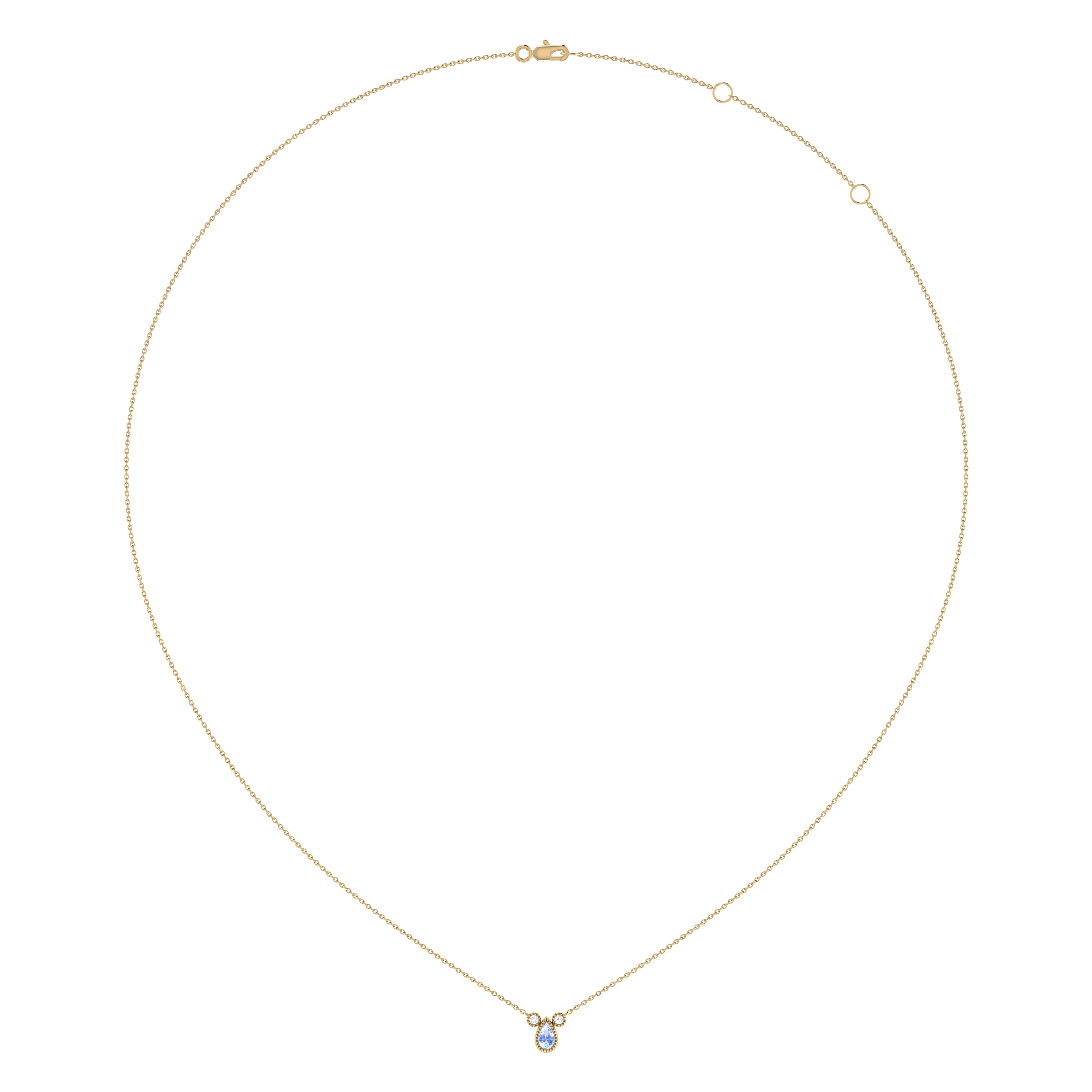 Crafted in 14K Yellow Gold, this necklace features a pear shaped tanzanite gemstone (5 by 3 mm), (5 by 3 mm), along with 0.04 carats of genuine, natural diamonds in a bezel setting.