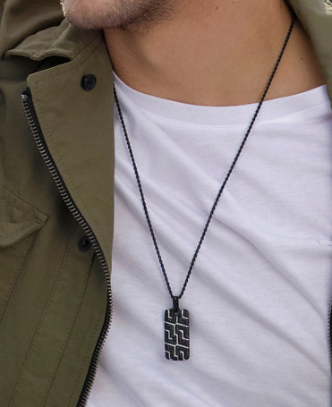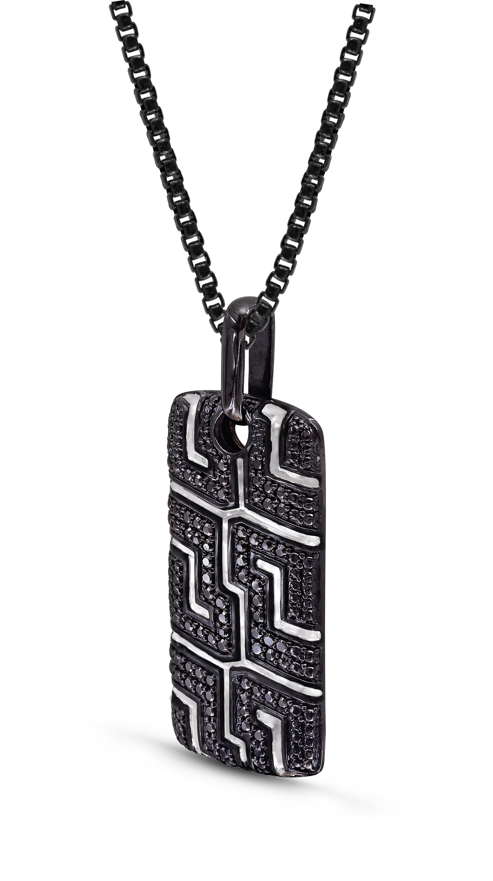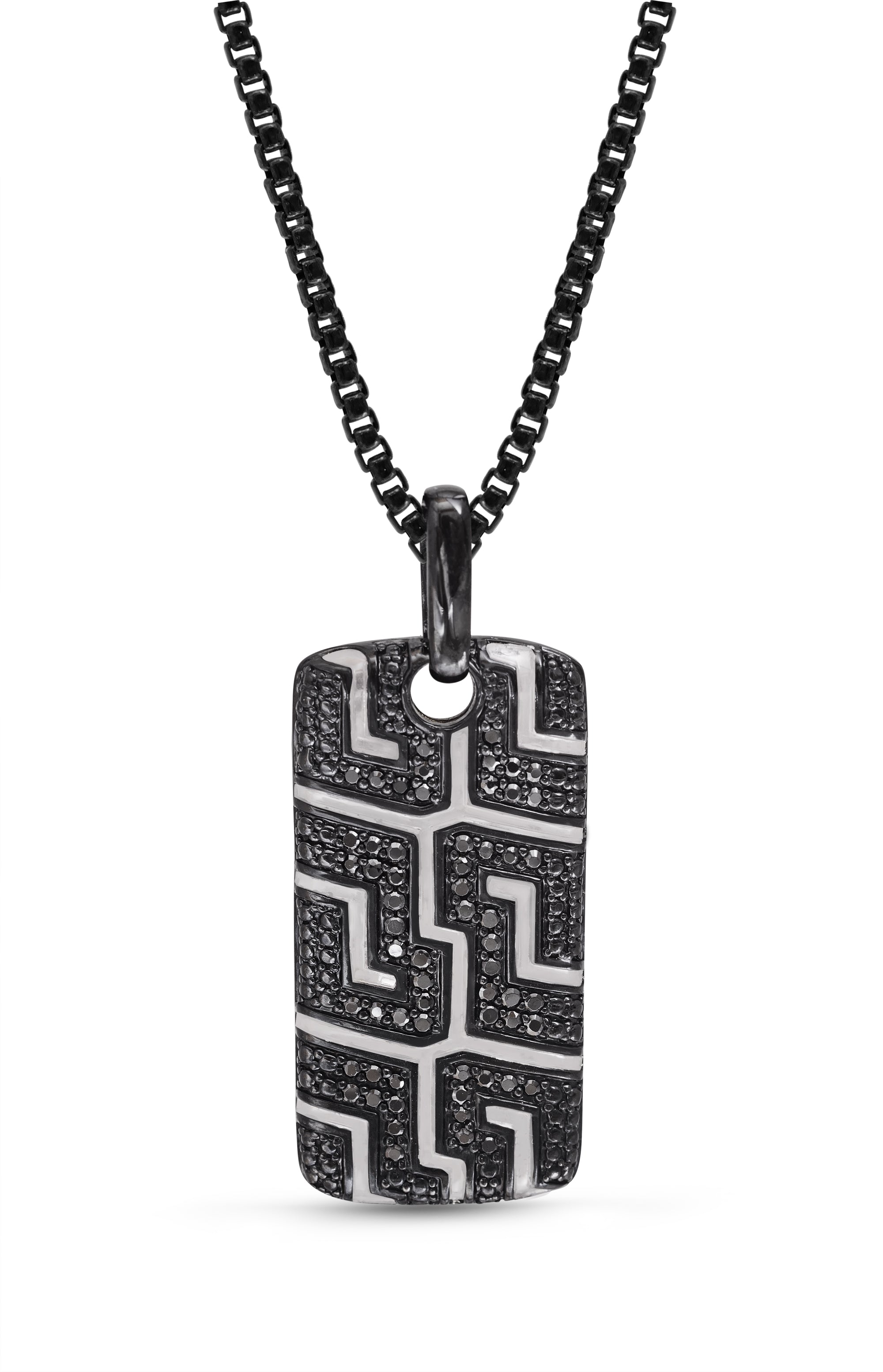 Our Pro Rider Silver & Black Diamond Tag Necklace features a bold tire tread pattern. Perfect for the man who values a sporty and stylish accessory with a touch of sophistication.