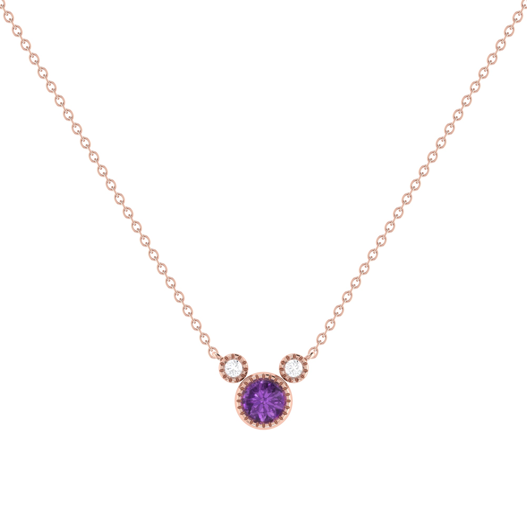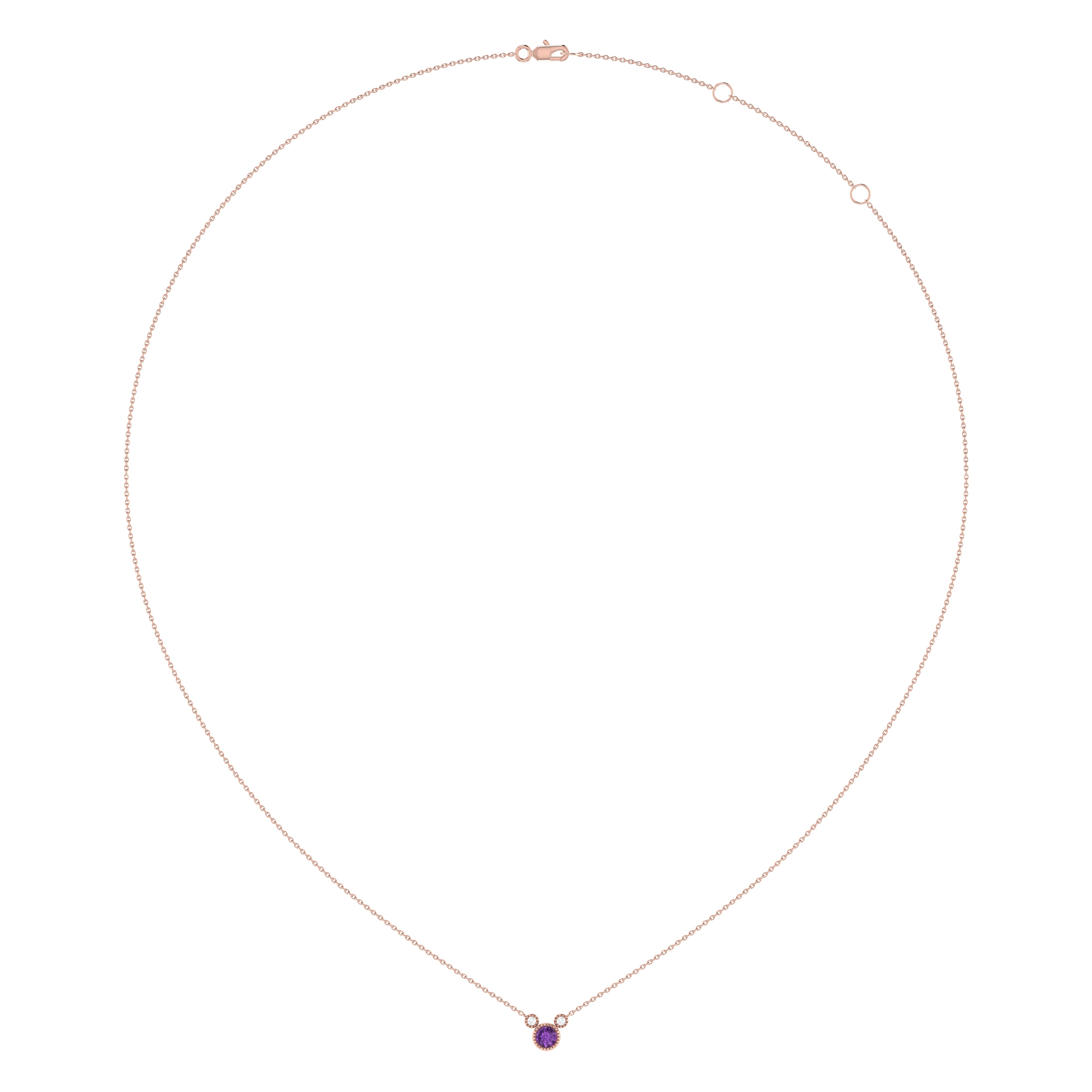Crafted in 14K Rose Gold, this necklace features a round cut amethyst gemstone (4 mm), along with 0.04 carats of genuine, natural diamonds in a bezel setting.