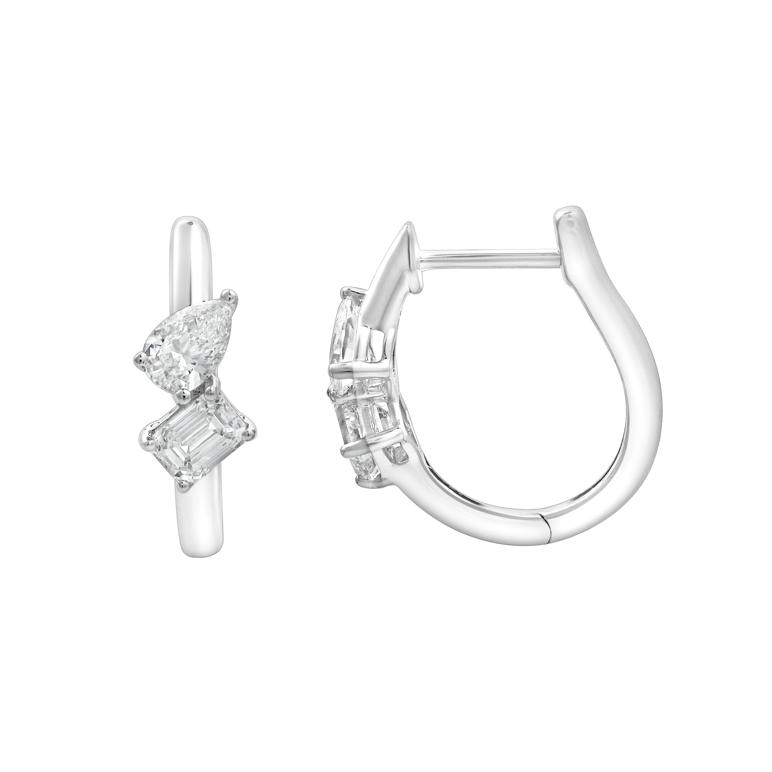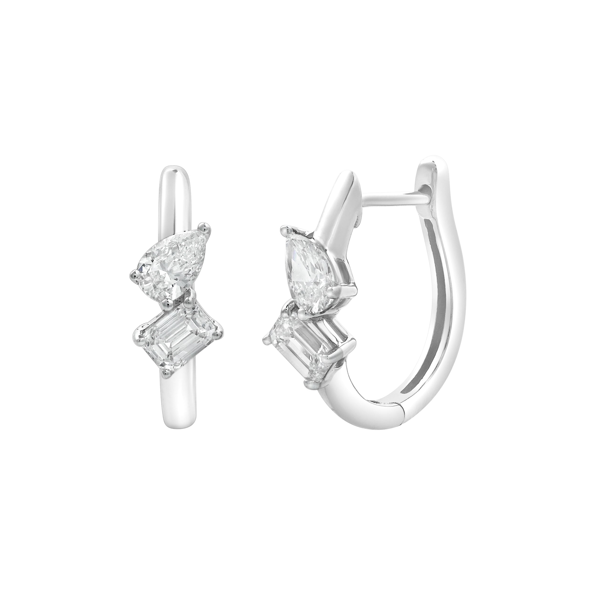 Our Saela huggie earrings are sculptural and blend modern edge with timeless elegance. Crafted in 14K White Gold with 0.5 cts of lab grown diamonds in emerald and pear cuts. The mixed diamond shapes bring a sense of movement and individuality. Perfect for daily wear or a polished accent for evening looks. Each pair is handmade with precision and a commitment to conscious luxury. Diamond carat weight may vary up to 0.05 carats from the stated weight.