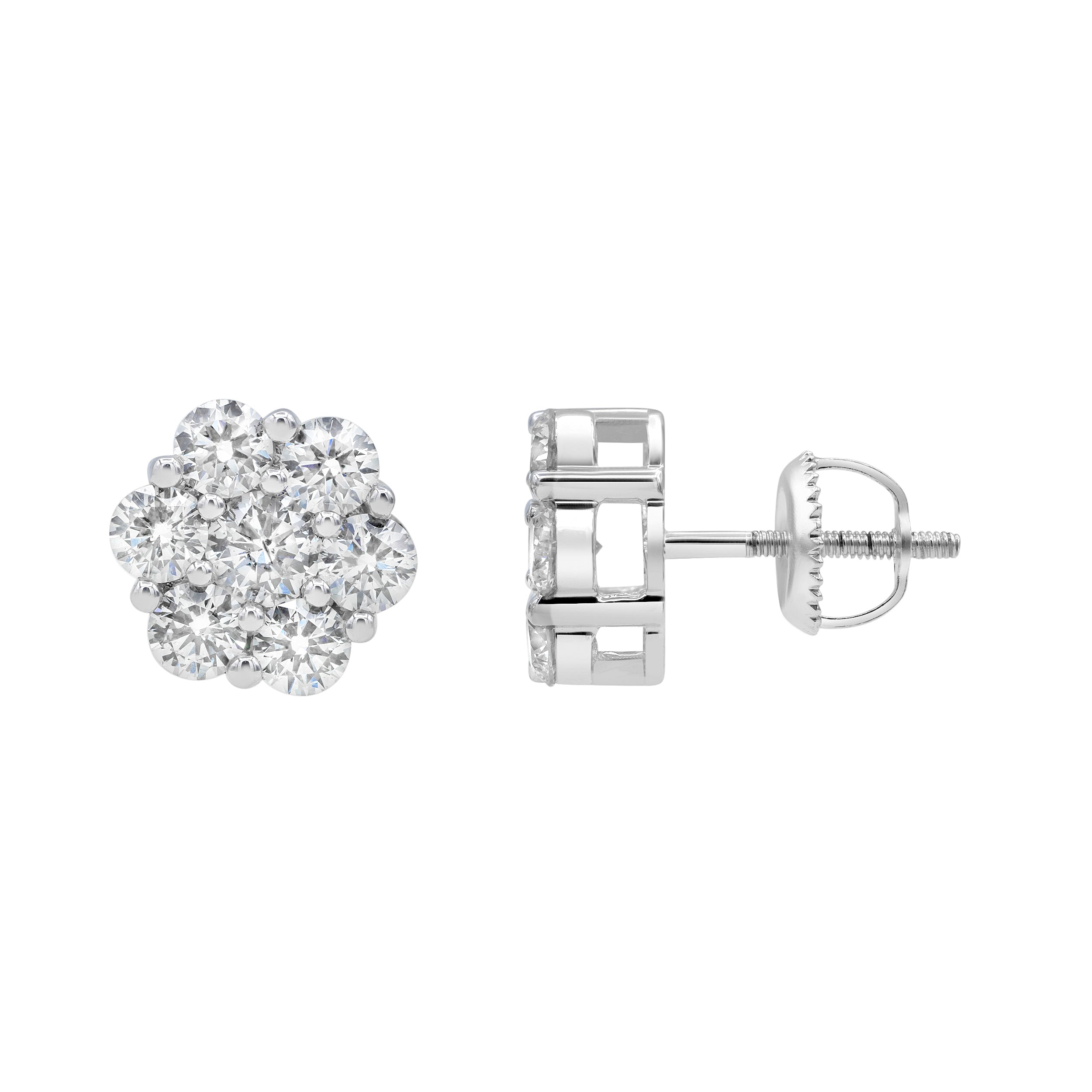 These 1.80 carat diamond earrings feature a delicate flower cluster design meticulously set in 14k white gold with a screwback setting. Their elegant arrangement highlights the timeless brilliance of the diamonds.