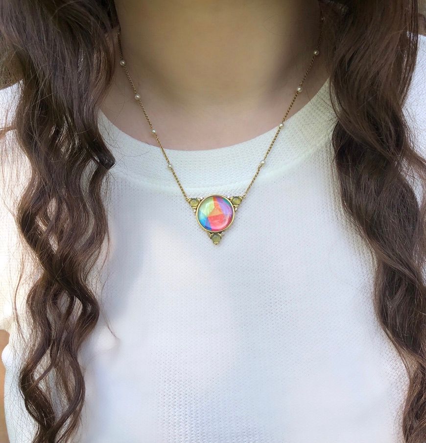 Crafted in 925 Sterling Silver this elegant necklace features 3 circular prehnite stones (5 mm) and a circular colorful motif encased by crystal set alongside 1/6 carats of diamonds used in a prong setting. This vibrant necklace is plated in 14 KT Yellow Gold.