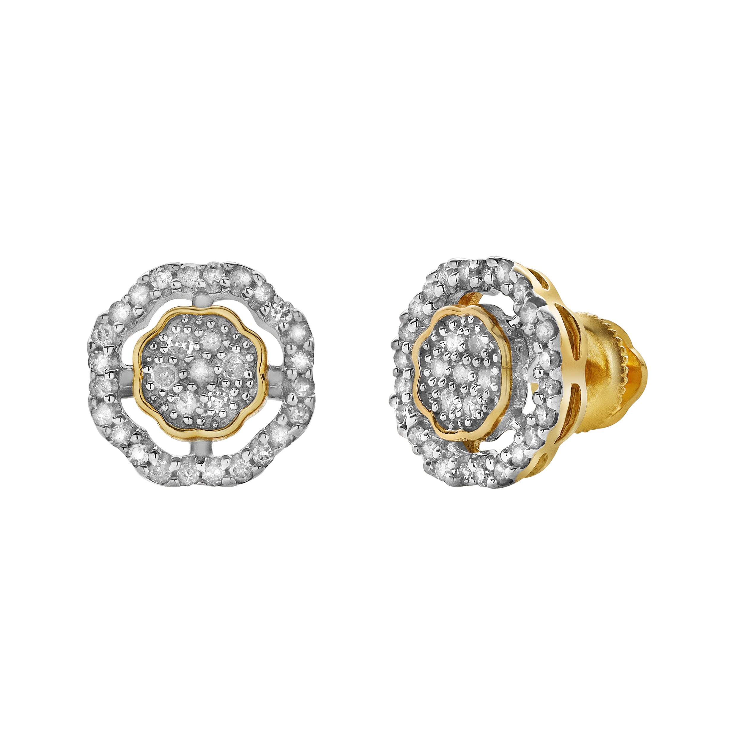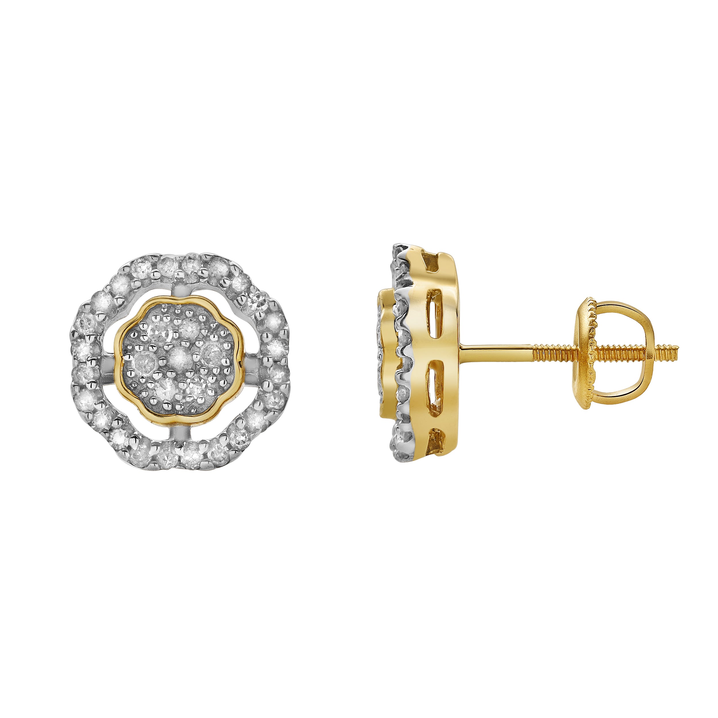 These gorgeous 0.35 carat diamond earrings feature a delicate cluster design meticulously set in 10k yellow gold with a screwback setting. Their elegant arrangement highlights the timeless brilliance of the diamonds.
