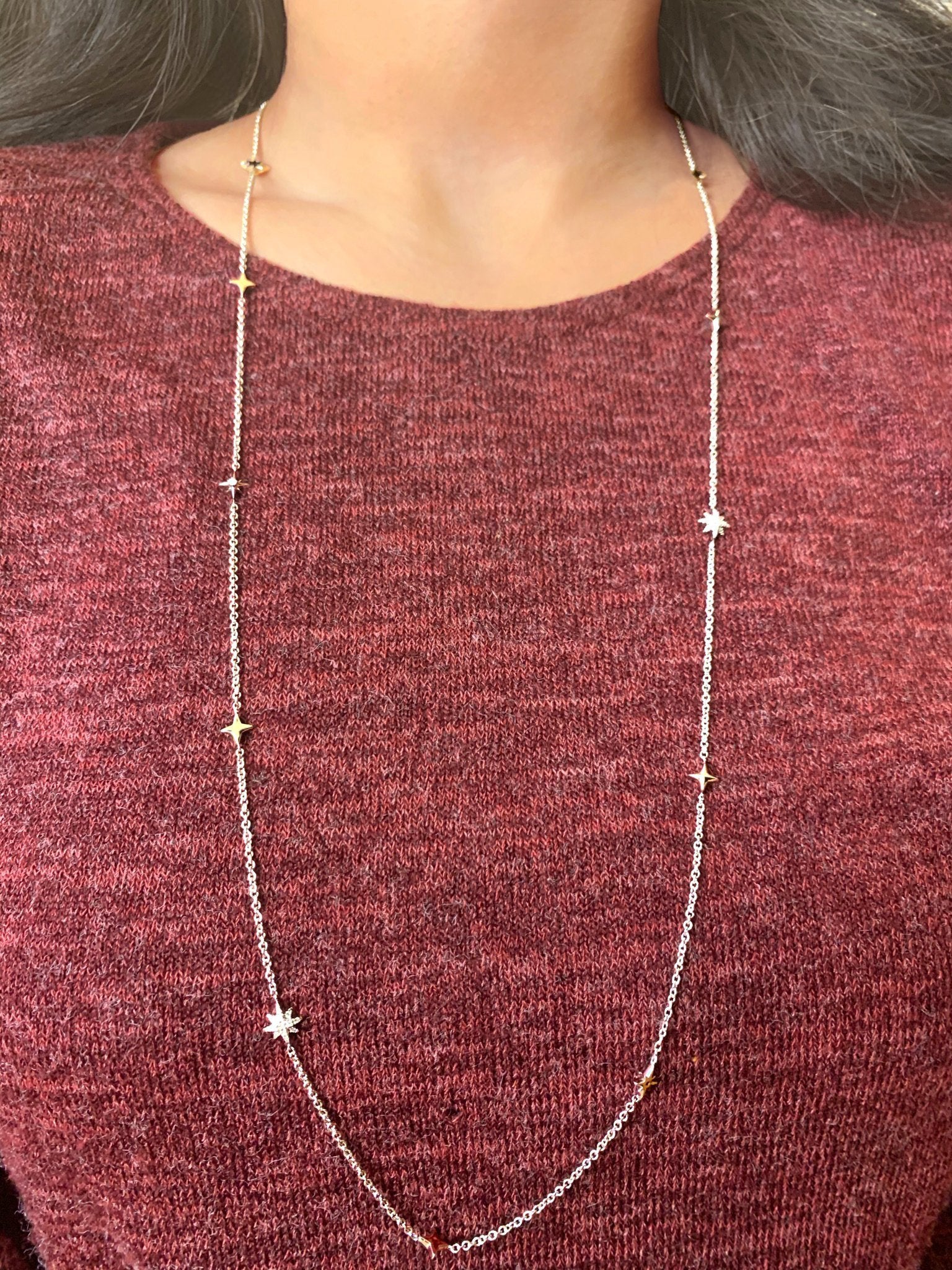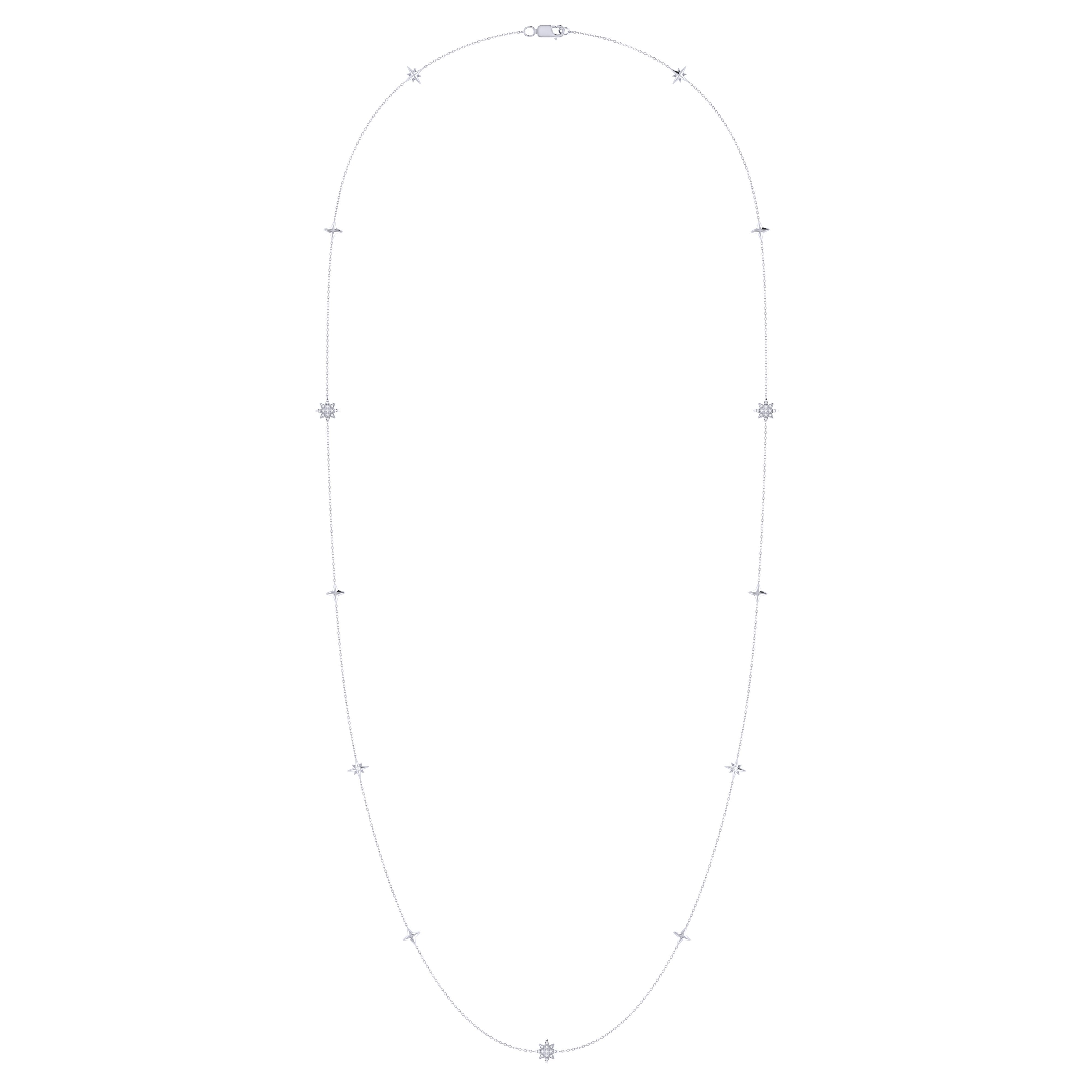 Turn the Earth's beautiful stars into a fashion statement with our Starry Lane Layered Diamond Necklace. Crafted in 14K White Gold, this necklace features 100% natural, genuine diamonds. 0.11 carats of diamonds are used in individual plate prong and collet prong settings. This necklace is 30" long and uses a cable chain with lobster clasp.