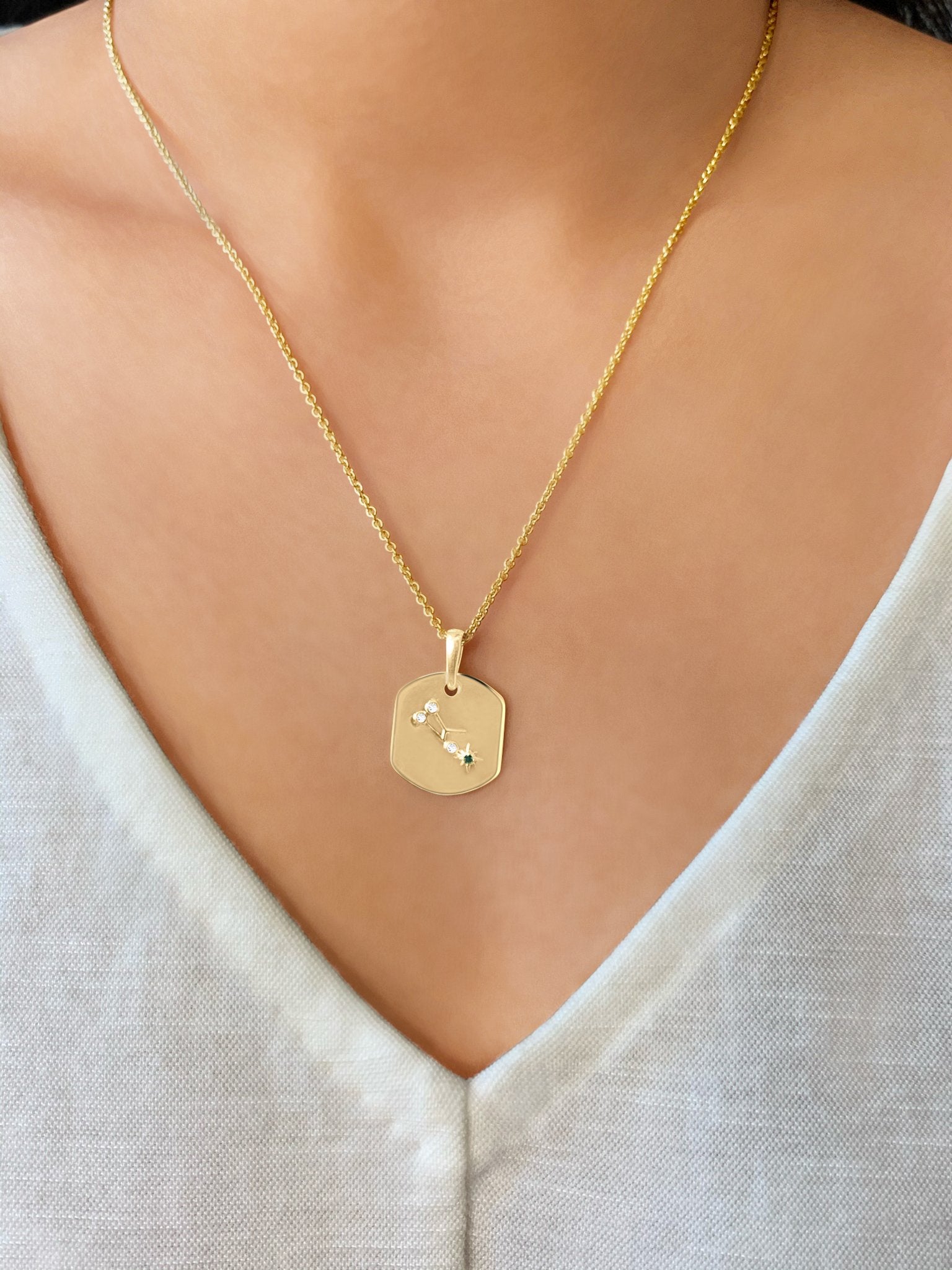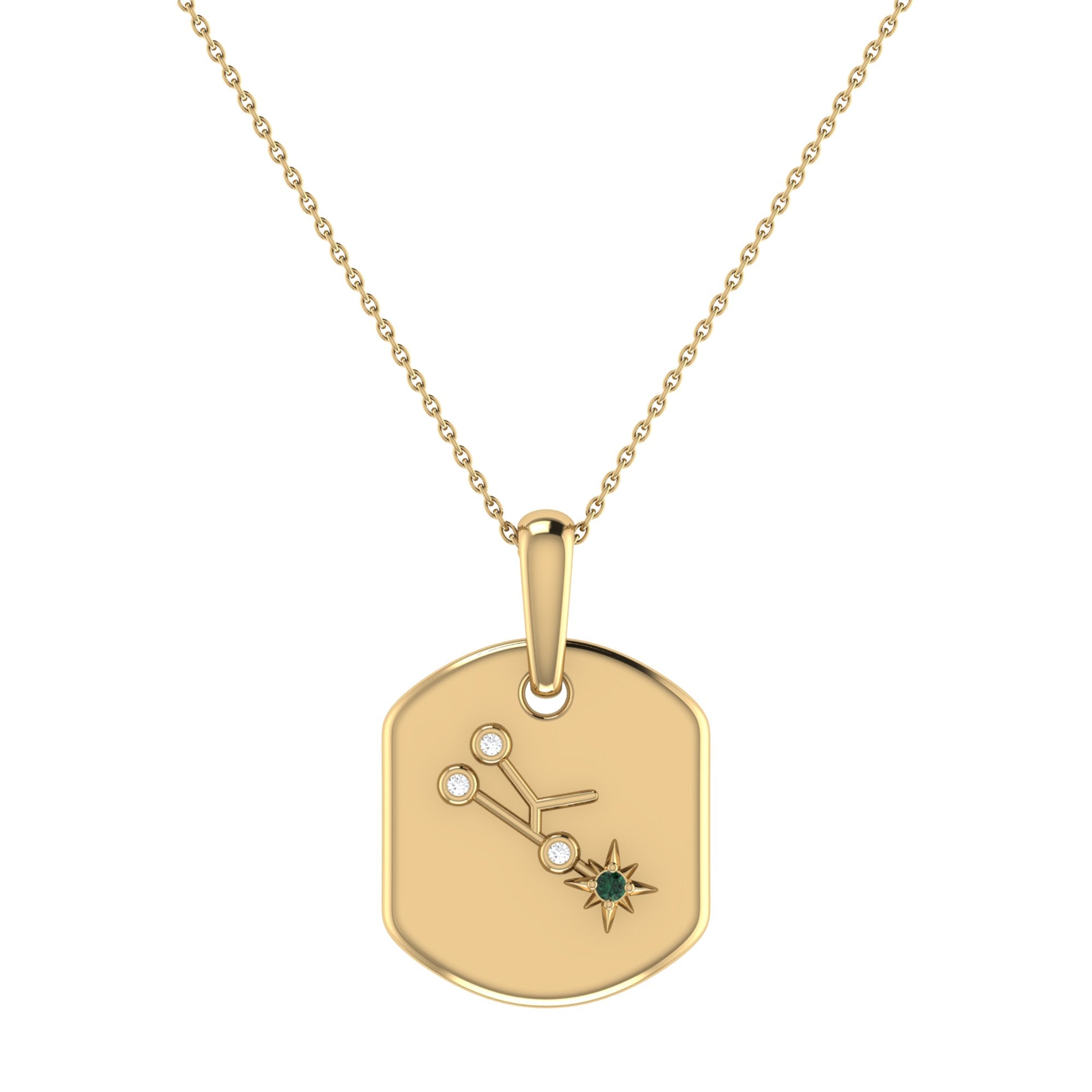 Taurus Bull Emerald & Diamond Constellation Tag Pendant Necklace in 14K Yellow Gold