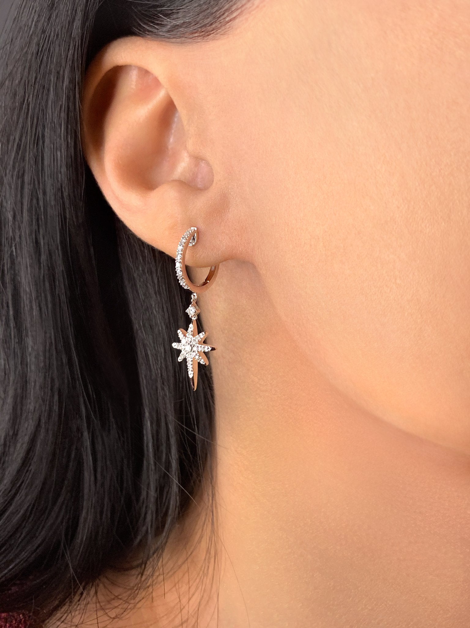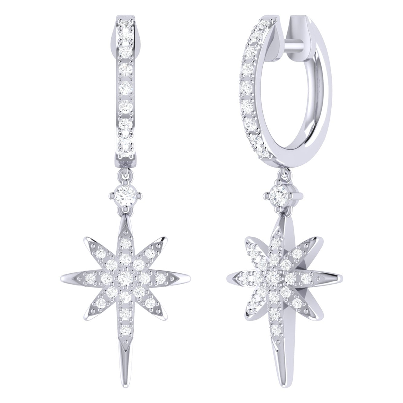 Dance in the Milky Way with our Twinkle Star Hoop Earrings. Crafted in 14K White Gold, these hoop earrings feature 100% natural, genuine diamonds. 0.33 carats of diamonds are used in individual plate prong & collet prong settings. These hoop earrings are 11mm wide and 31.8mm long from the ear lobe.