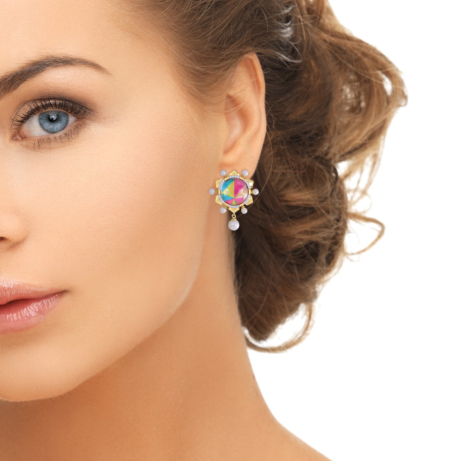 Crafted in 925 Sterling Silver these earrings feature circular colorful motifs encased by crystals and encircled by 6 pentagonal precious metal shapes pearls (3 to 5 mm) and 1/5 carats of genuine diamonds in a plate prong setting. These earrings are plated in 14 KT Yellow Gold.