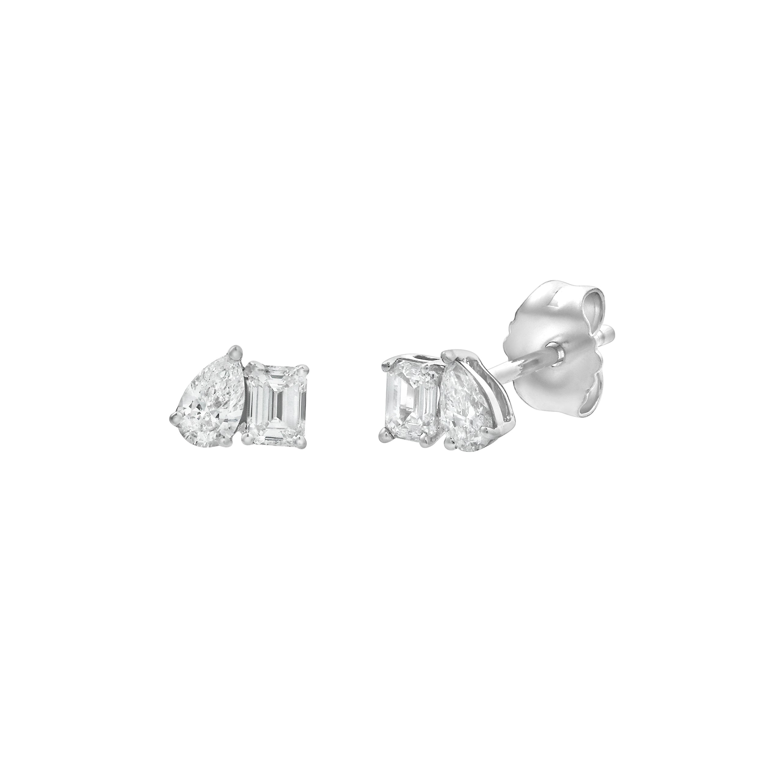 Our petite Valessa stud earrings are a modern take on the classic Toi et Moi design. Crafted in 14K White Gold with 0.5 cts in lab grown pear and emerald cut diamonds. Two distinct shapes come together to symbolize harmony and connection. Perfect for everyday wear or layered in a curated ear stack. Each pair is handmade with care and a commitment to ethical luxury. Diamond carat weight may vary up to 0.05 carats from the stated weight.