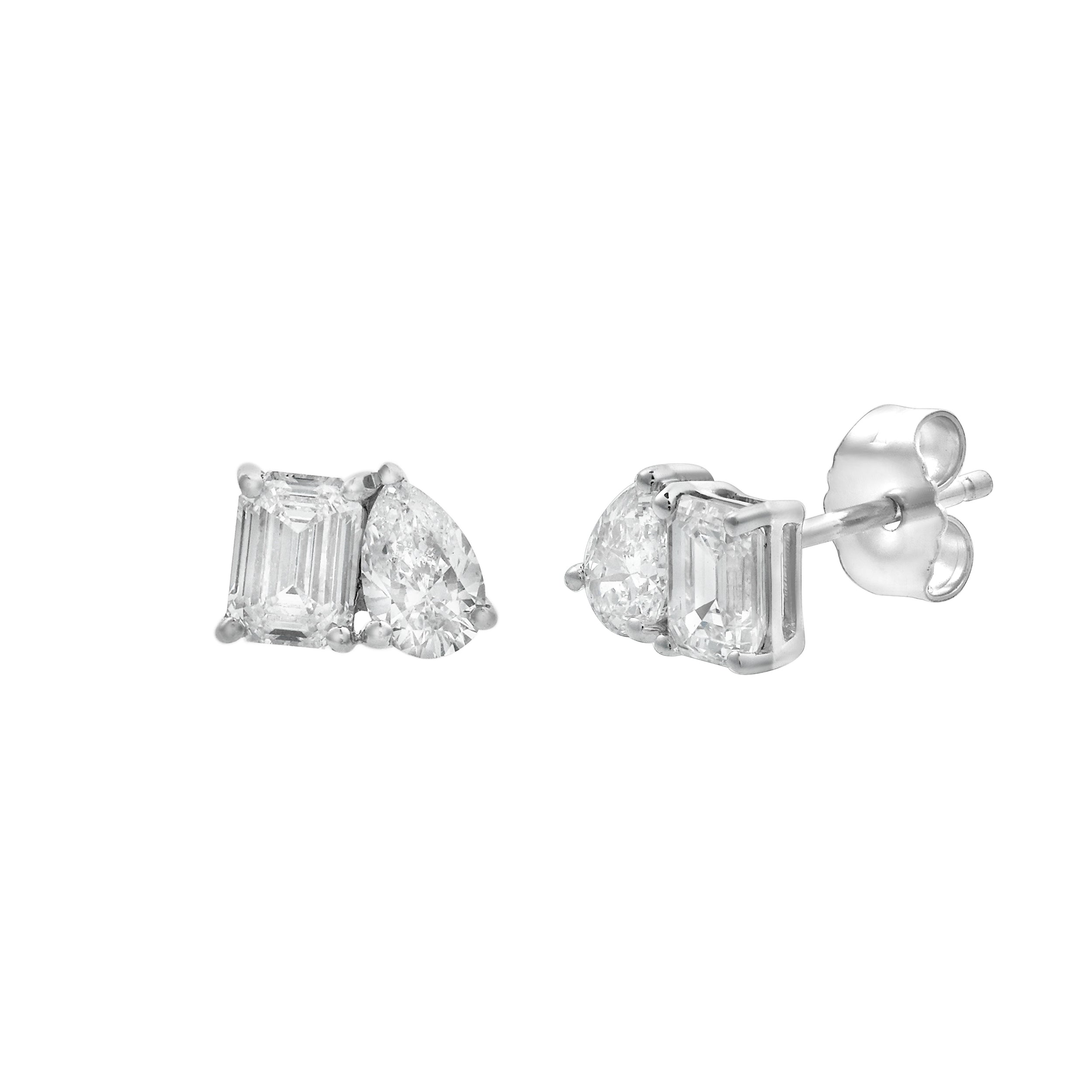 Our Valessa stud earrings are a modern take on the classic Toi et Moi design. Crafted in 14K White Gold with 0.75 cts in lab grown pear and emerald cut diamonds. Two distinct shapes come together to symbolize harmony and connection. Perfect for everyday wear or layered in a curated ear stack. Each pair is handmade with care and a commitment to ethical luxury. Diamond carat weight may vary up to 0.05 carats from the stated weight.