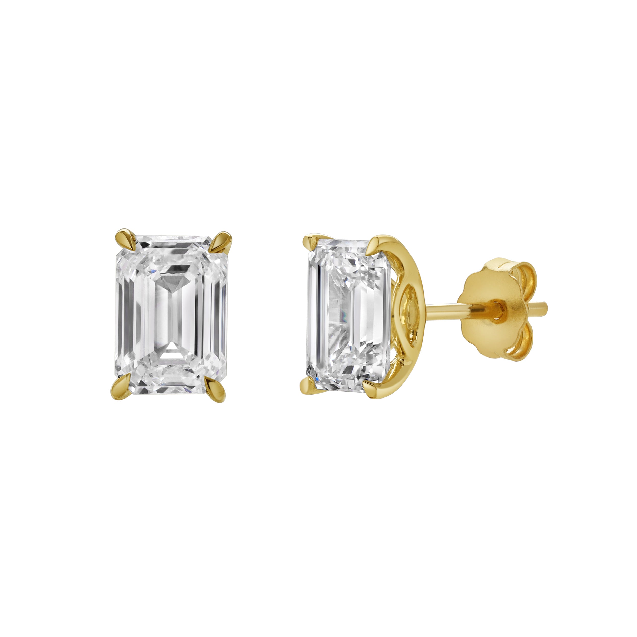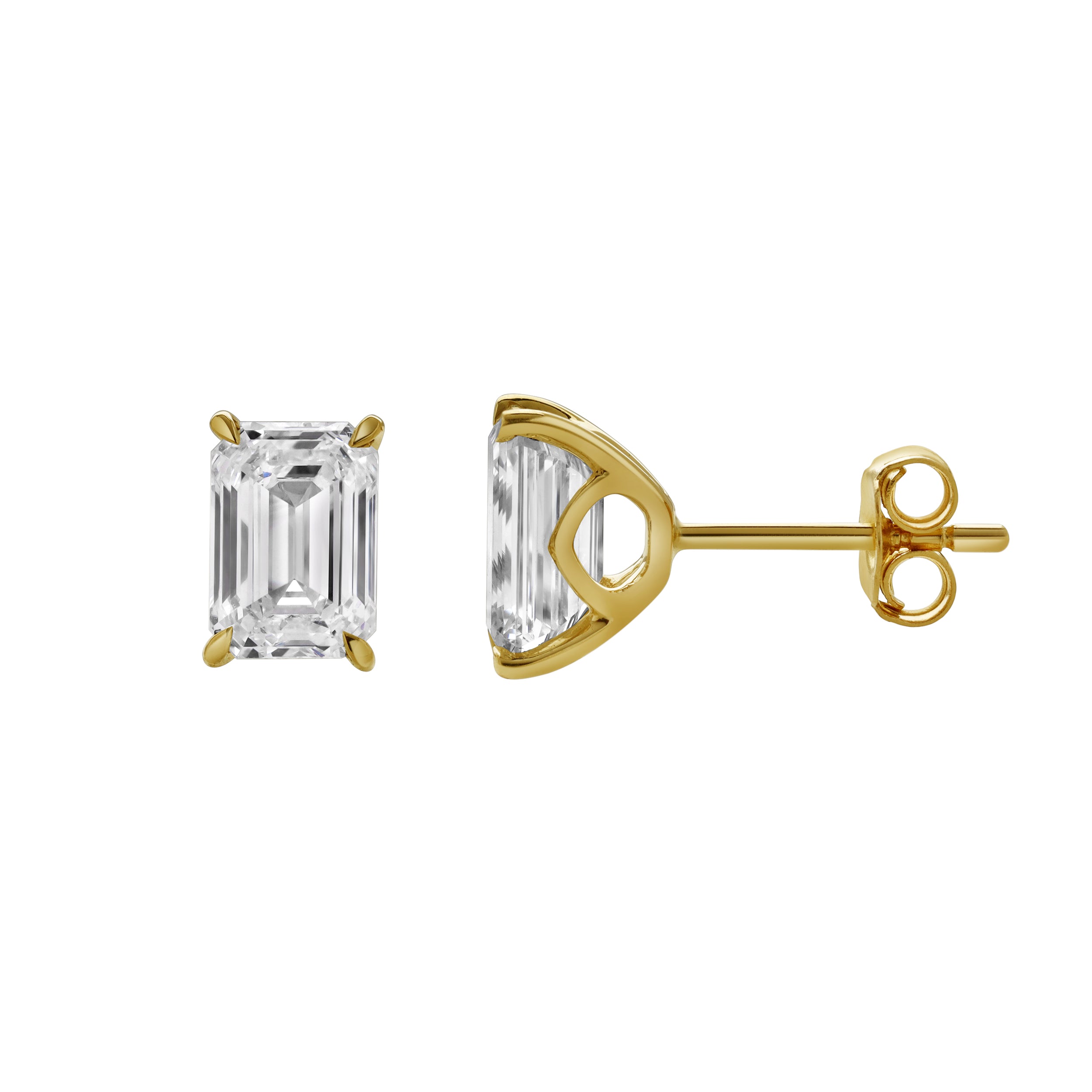 Brilliant 2.04 carat Emerald shaped lab grown diamond solitaire earrings showcased in an amazing 3 prong basket setting. Crafted in 14K gold with a premium push back post which combines timeless elegance with comfortable wear.