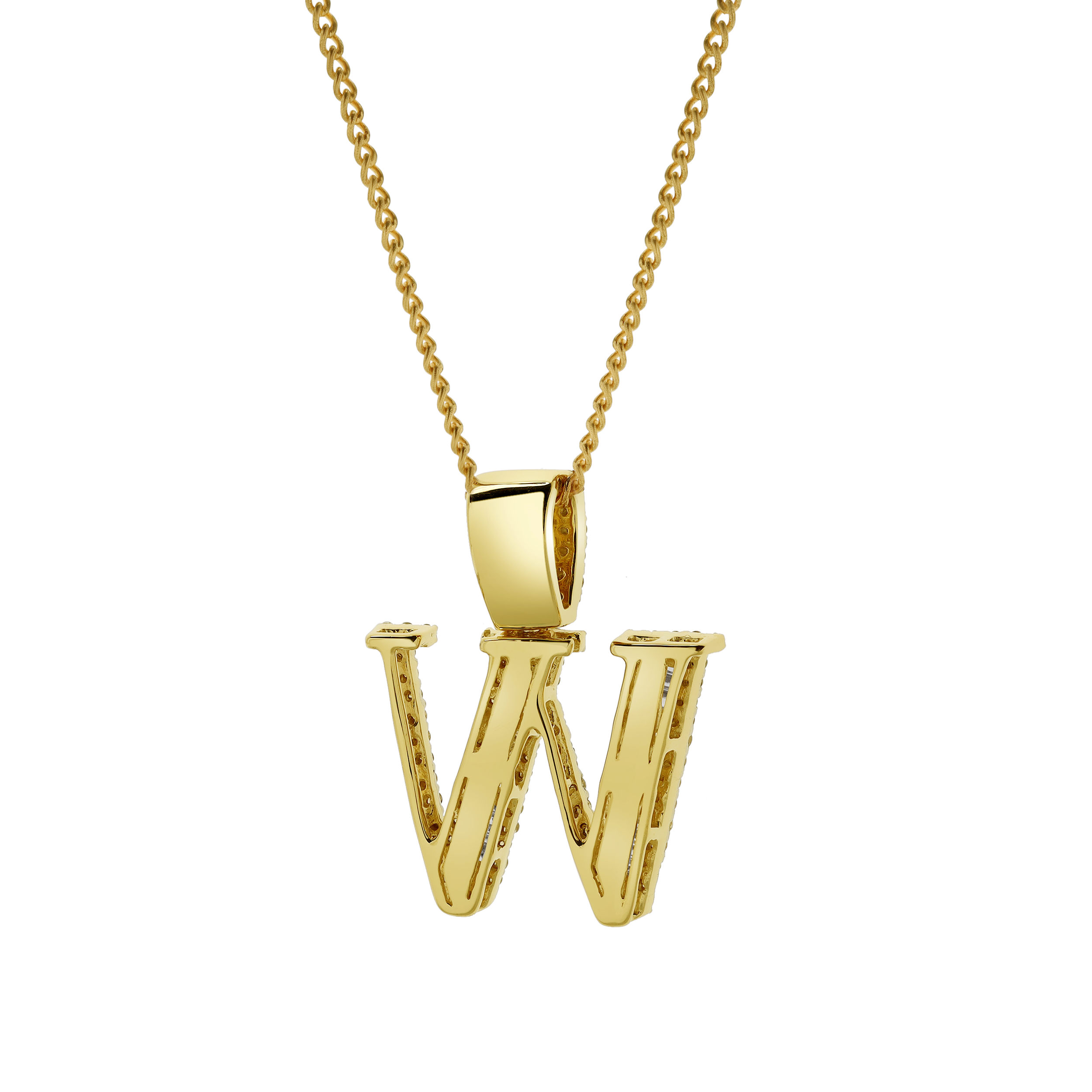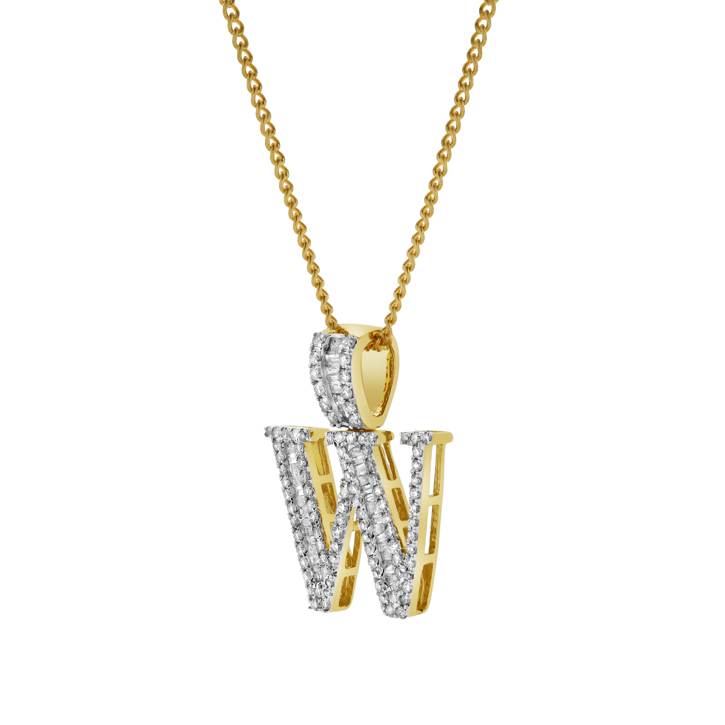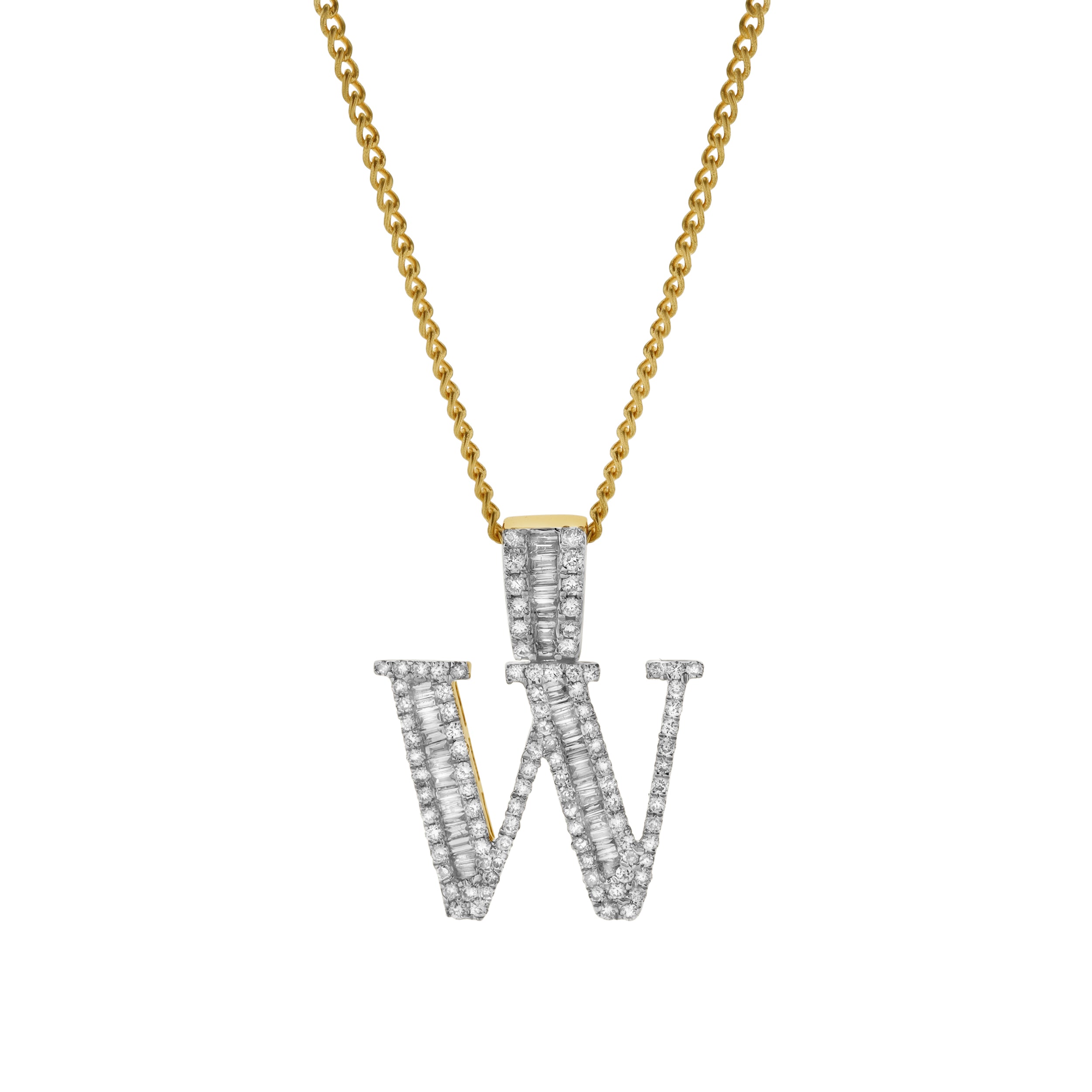 This W initial pendant is crafted in 10K Yellow Gold and features 0.82 carats of G SI1 diamonds. The mix of natural round and baguette diamonds adds texture brilliance and dimension to the design. Expertly crafted with a polished profile this pendant offers a bold yet refined personal touch. CHAIN NOT INCLUDED.